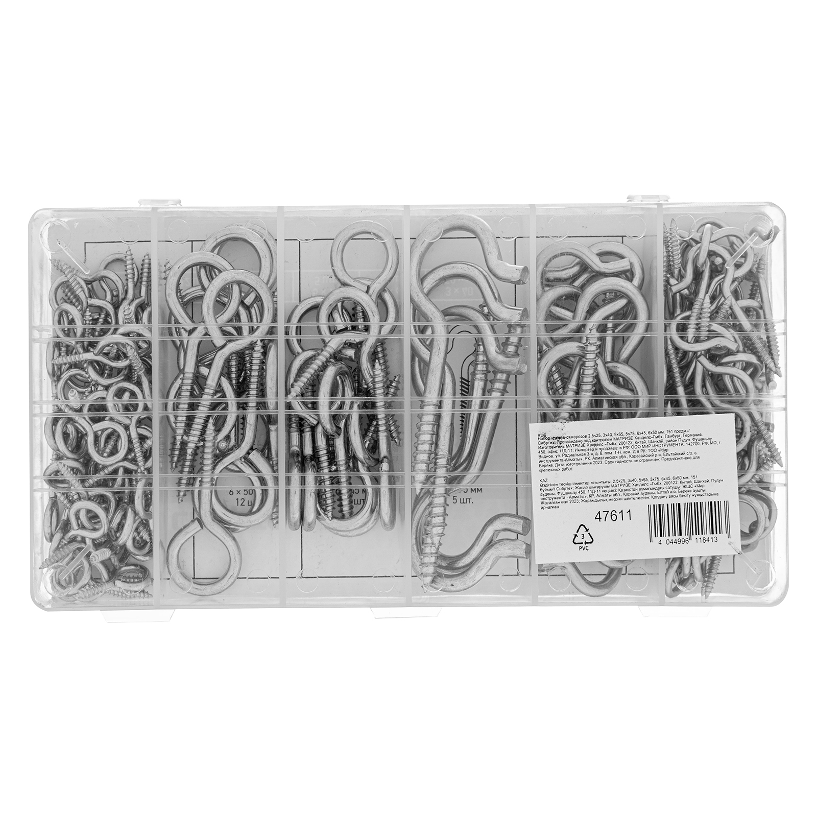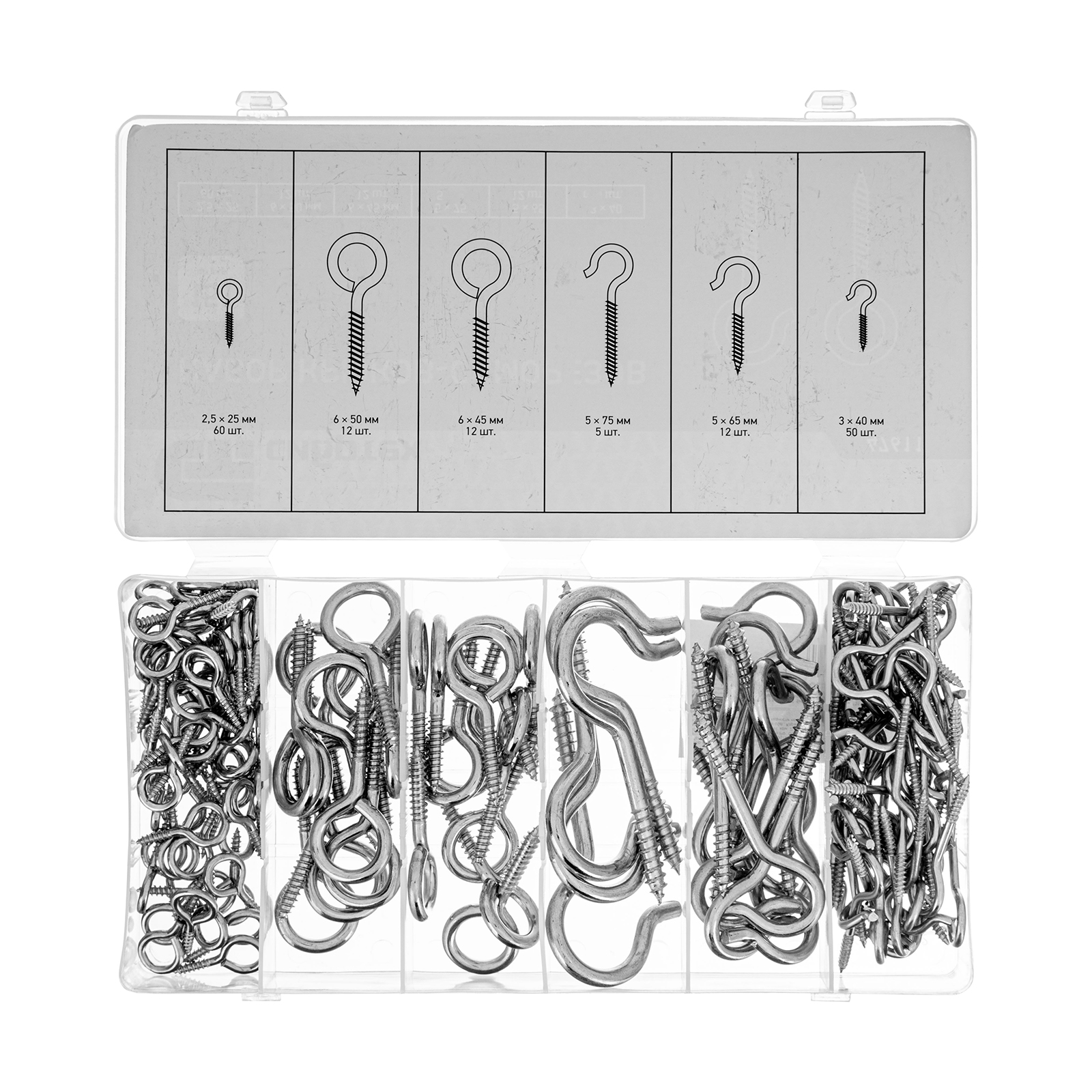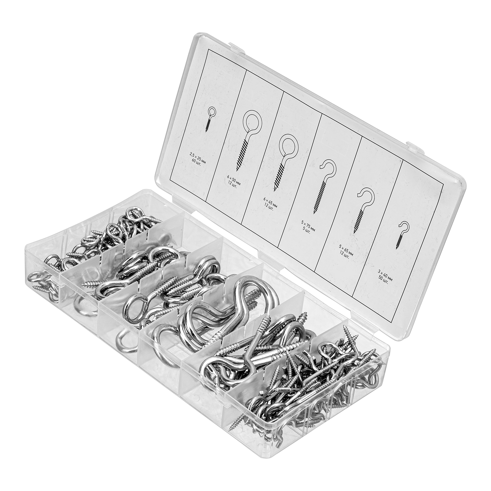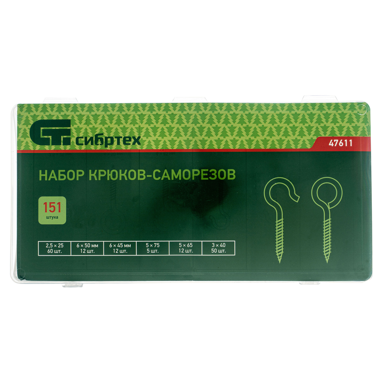 Набор крюков-саморезов Сибртех 47611 состоит из 151 предмета и включает саморезы с диаметром от 2,5 до 6 мм и длиной от 25 до 75 мм. В комплект входят крепежные изделия с головкой в форме кольца и крюка, использующиеся для монтажа подвесных конструкций. Широкий размерный ряд саморезов увеличивает возможности применения набора.