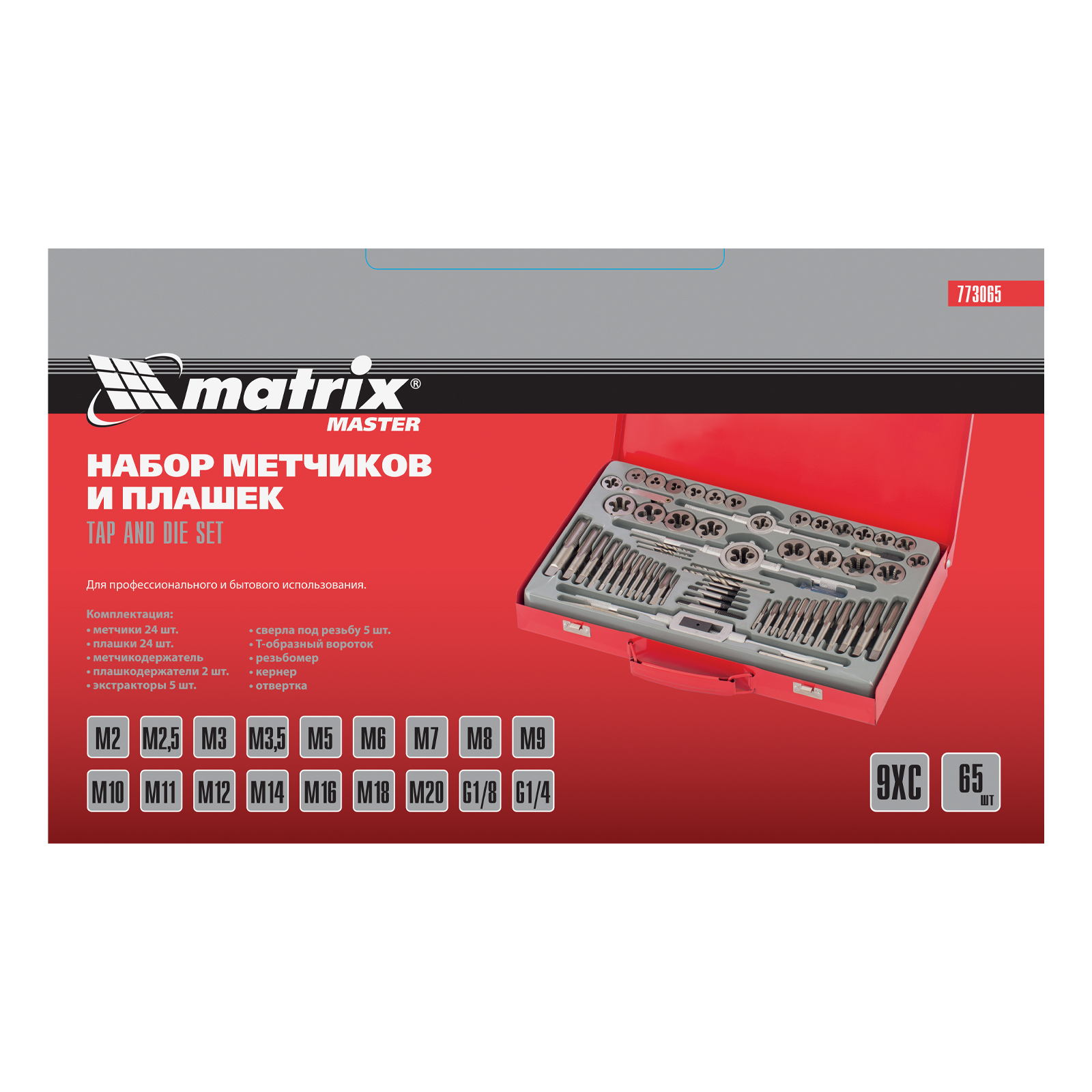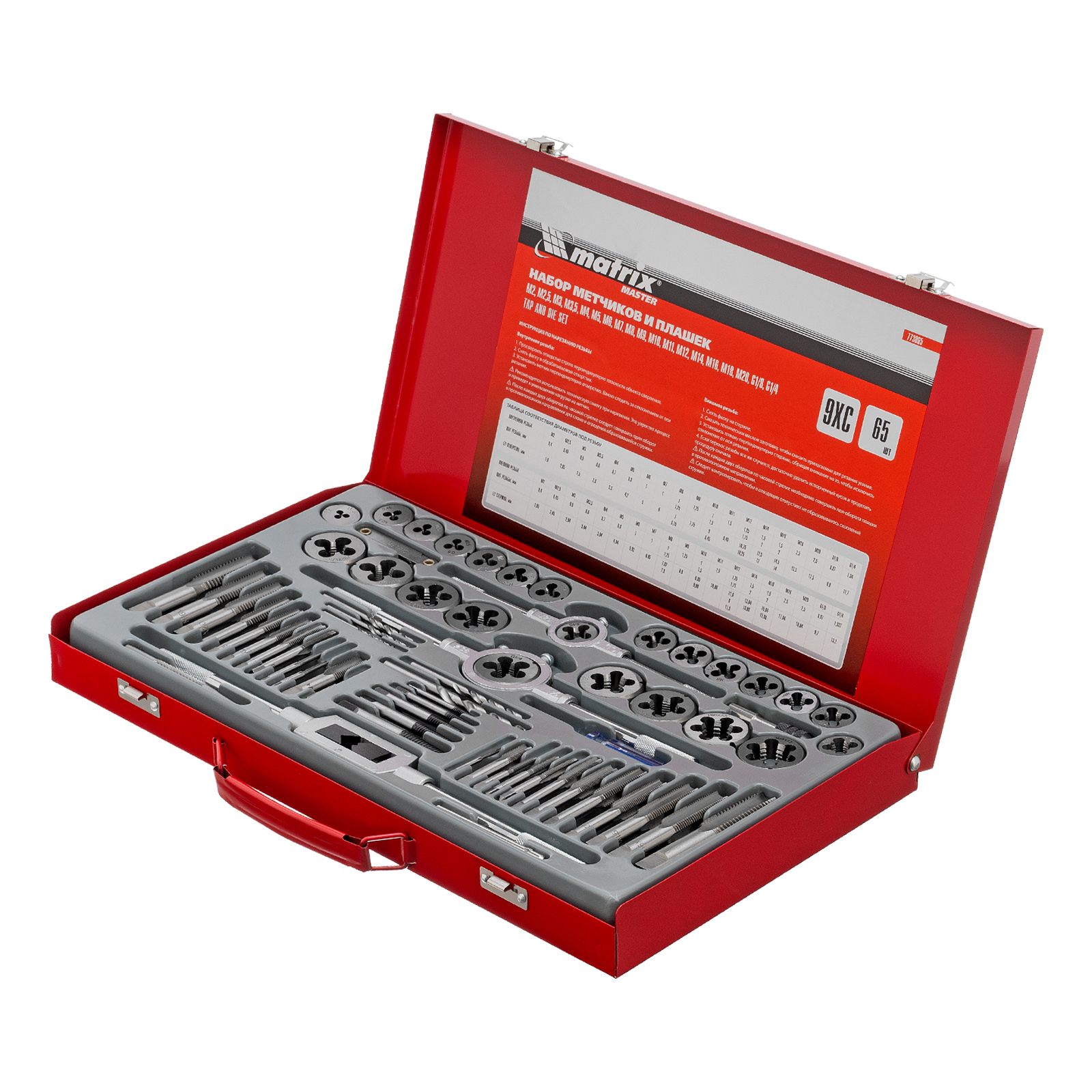 Набор метчиков и плашек Matrix 773065 для резьбы М2-М20 включает 65 предметов, помещенных в металлический кейс. Инструменты используются для создания внутренней и внешней резьбы различного диаметра и шага. Отвертка служит для монтажа и демонтажа резьбовых соединений, а экстракторы — для извлечения сломавшихся болтов и шпилек. Набор предназначен для проведения слесарных работ, будет полезен во время ремонта автомобиля.