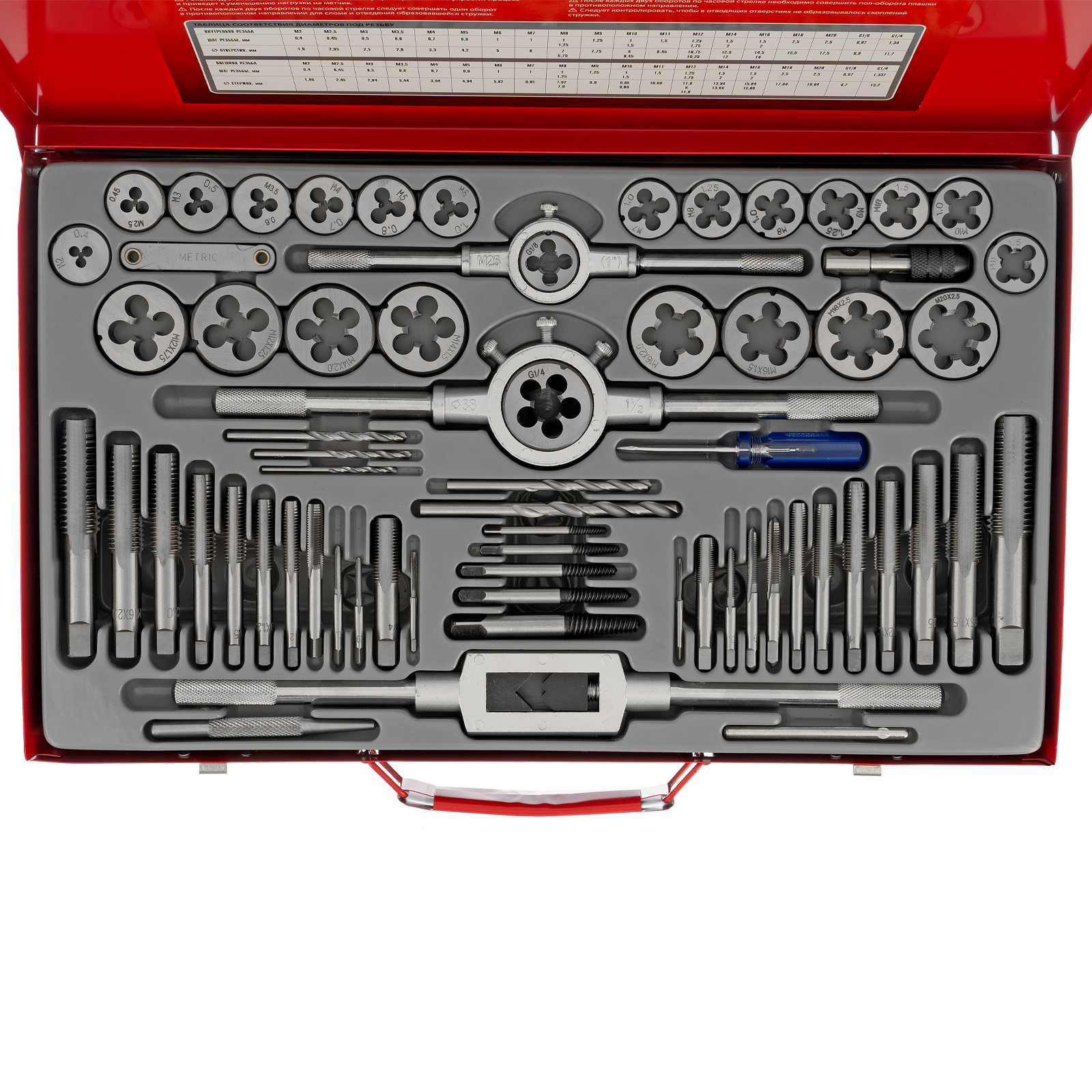 - Быстрый поиск нужного инструмента — на метчиках и плашках указаны шаг и размер резьбы.