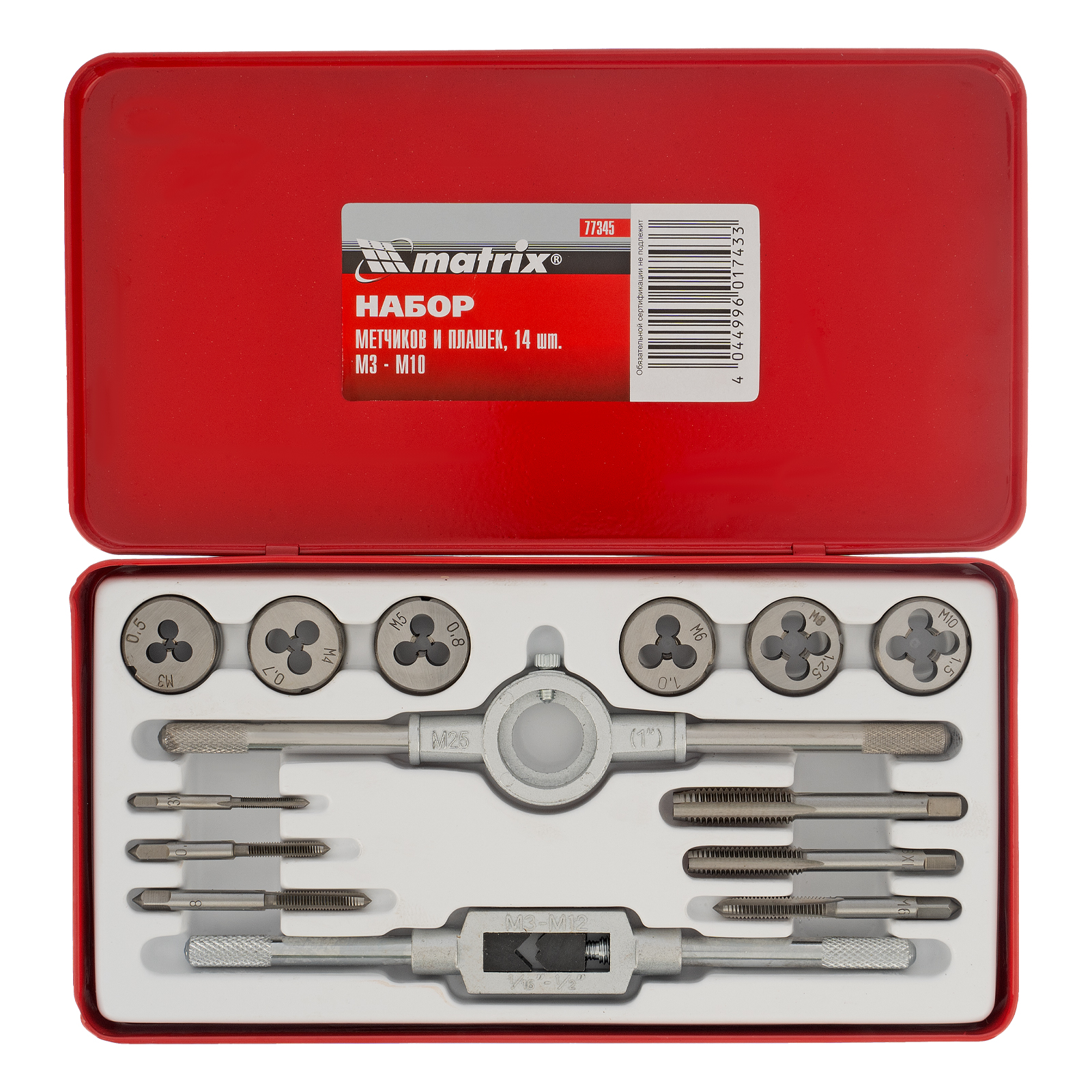 Набор метчиков и плашек М3-М10 Matrix 77345 состоит из 14 предметов — резьбонарезных инструментов, воротка и плашкодержателя. Используется для создания наружной и внутренней резьбы в сквозных и глухих отверстиях металлических деталей. Также с его помощью можно восстанавливать поврежденные резьбовые участки. Набор поставляется в металлическом кейсе, поэтому не потеряется при хранении или транспортировке. Будет полезен в слесарной мастерской, а также пригодится для проведения бытового ремонта.