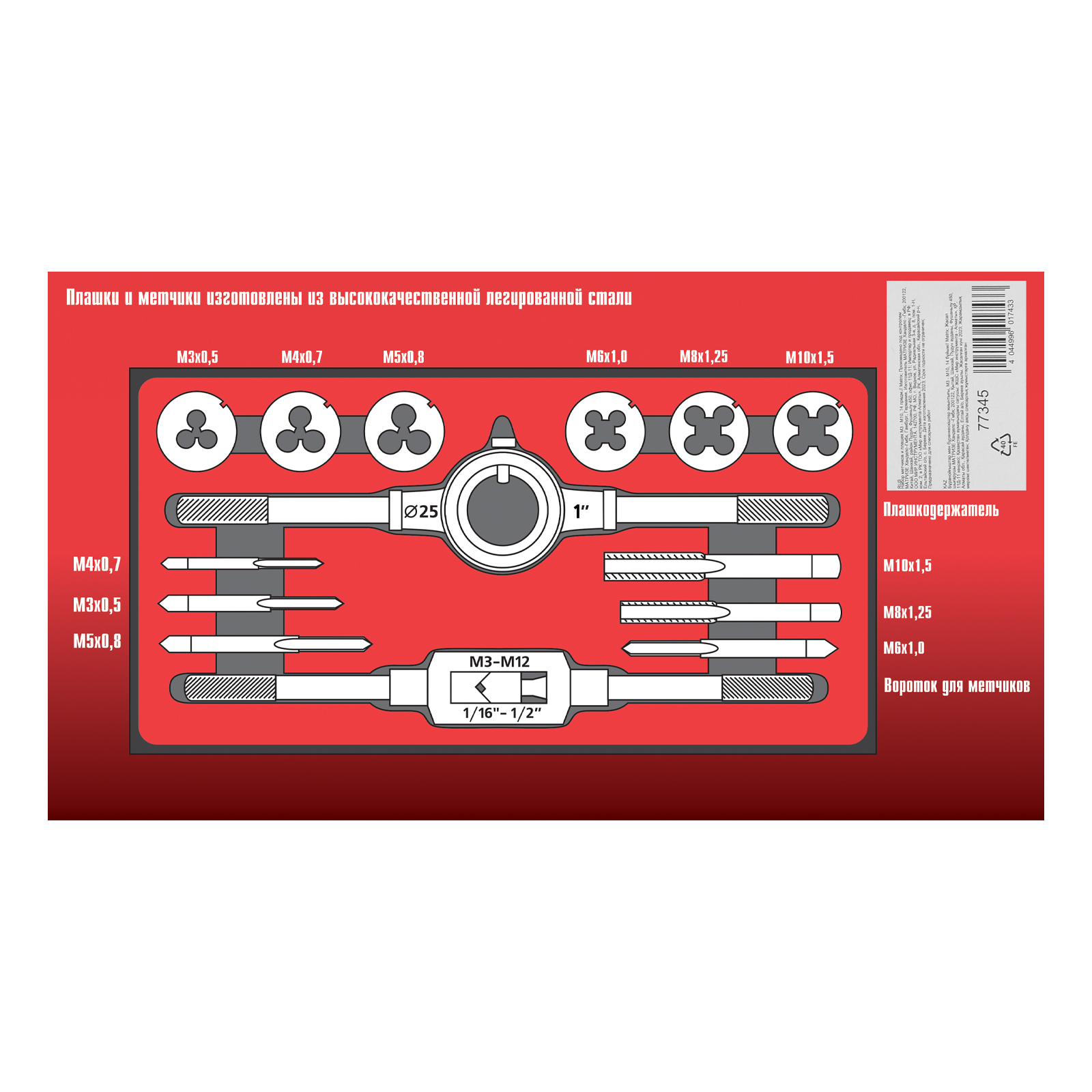 - Быстрый поиск нужного предмета — на каждом инструменте имеется маркировка с обозначением шага и размера резьбы.