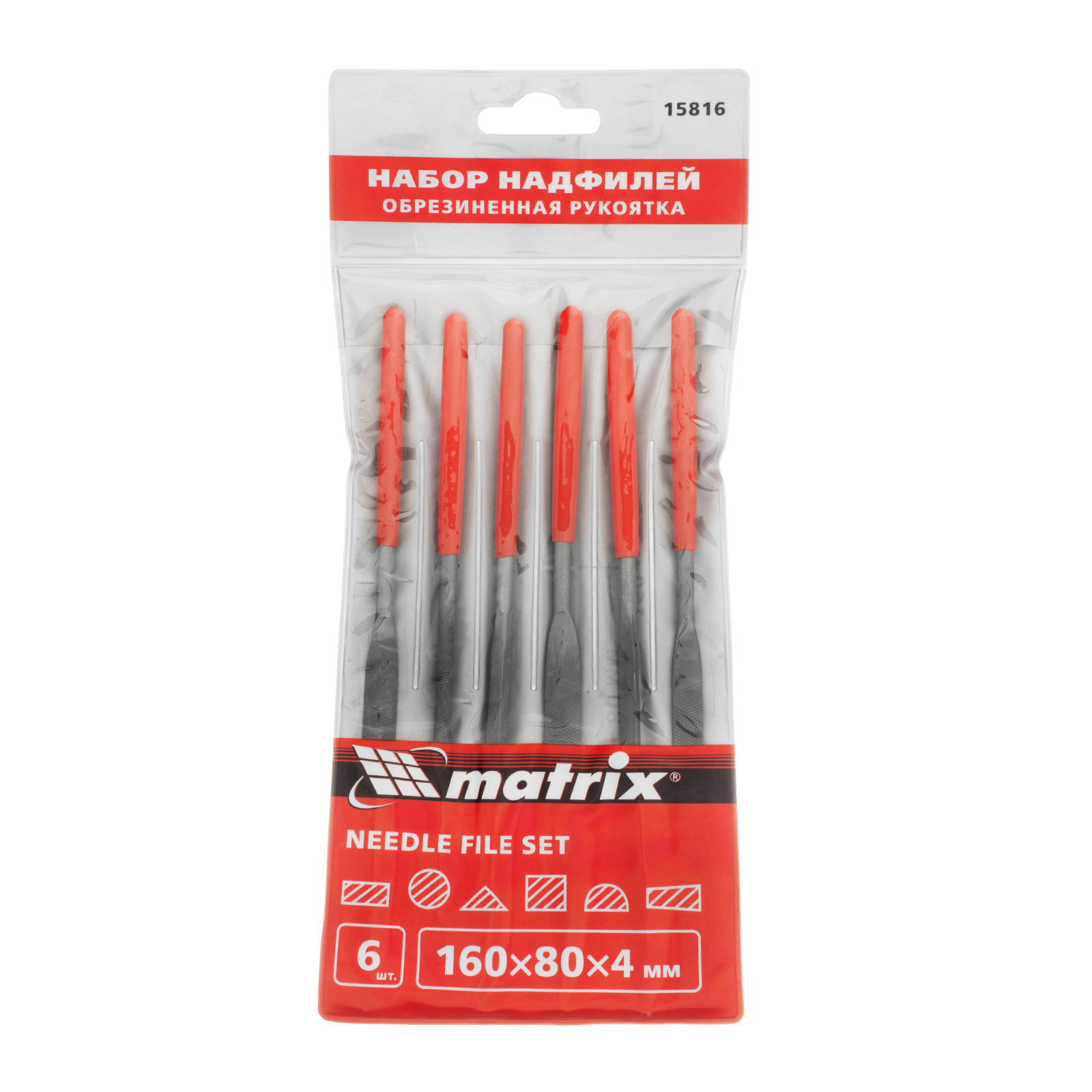 <p>Набор Matrix 15816 из 6 надфилей размером 160 х 4 мм, с обрезиненными рукоятками, предназначен для опиливания поверхностей из древесины, стекла, керамики и других материалов. Надфили с разными профилями позволяют обрабатывать пазы, отверстия, детали с округлыми и рельефными поверхностями. Инструменты необходимы в слесарной, столярной мастерской, пригодятся для занятий моделированием.</p><h2>Преимущества</h2><ul><li>Прочность и долговечность — надфили изготовлены из конструкционной стали.</li><li>Высокое качество обработки — на полотно каждого надфиля нанесена двойная перекрестная насечка.</li><li>Быстрый поиск среди других инструментов — рукоятки красного цвета хорошо заметны.</li><li>Комфортная работа — обрезиненные рукоятки не выскальзывают из рук.</li><li>Удобное хранение и транспортировка — набор упакован в прозрачный чехол.</li></ul>