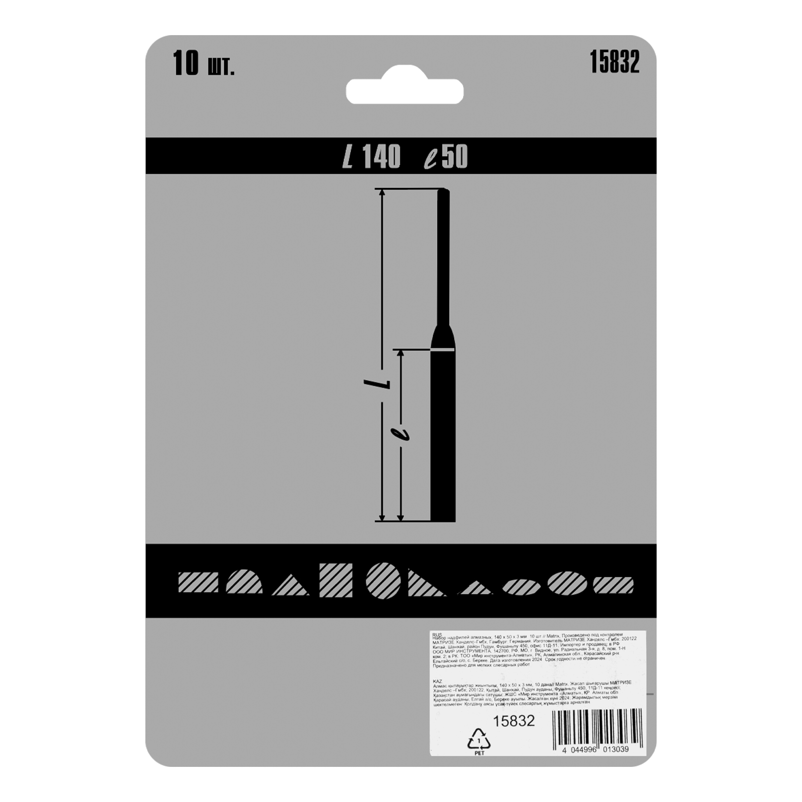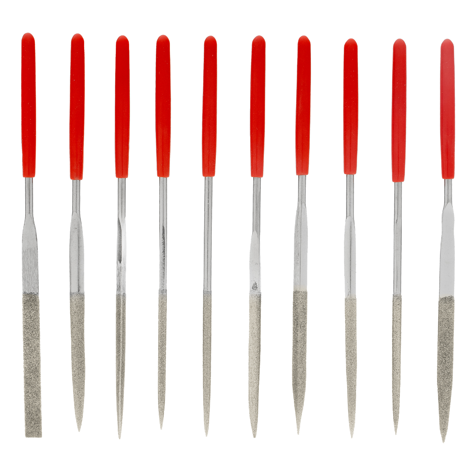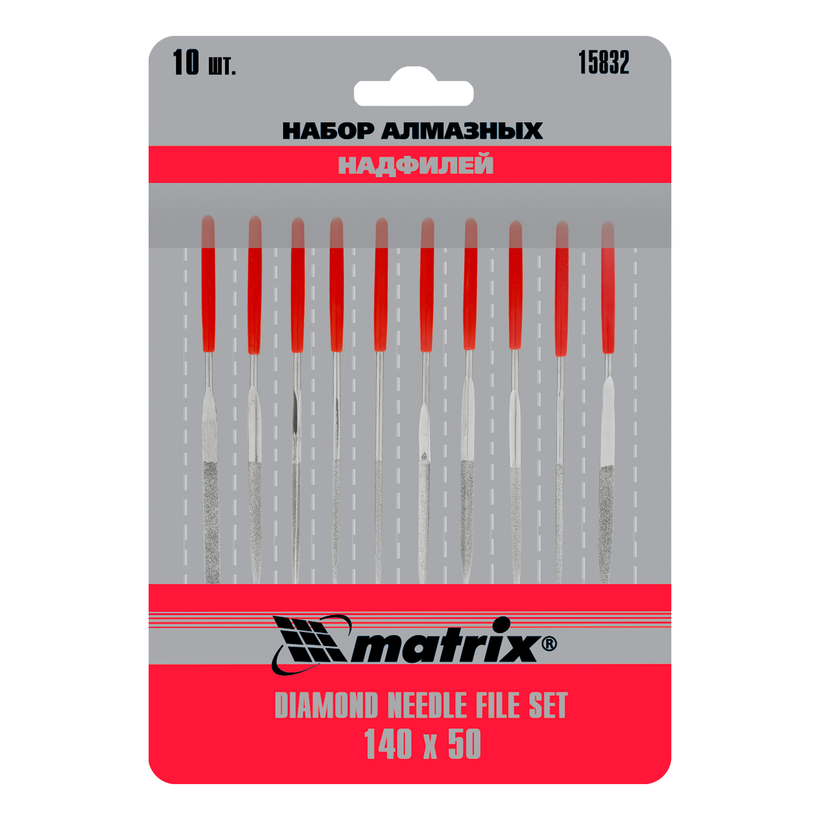 <p>Набор алмазных надфилей Matrix 15832 размером 140 х 50 х 3 мм предназначен для выполнения точных работ и используется для доводки и зачистки мелких деталей. Подходит для обработки металлических, стеклянных, керамических поверхностей. Набор универсален, т. к. в него входят 10 надфилей с разными сечениями профилей, что позволяет опиливать ровные поверхности, а также углы, пазы, отверстия и округлые выступы. Надфили пригодятся в слесарном деле, при занятиях моделированием, будут полезны и в быту.</p><h2>Преимущества</h2><ul><li>Твердость и износостойкость — инструменты изготовлены из высокоуглеродистой стали.</li><li>Высокие абразивные свойства — на рабочие части нанесено напыление из алмазной крошки.</li><li>Комфортная работа — обрезиненные рукоятки не выскальзывают из ладони.</li><li>Быстрый поиск инструментов — красный цвет рукояток хорошо заметен в рабочем пространстве.</li></ul>
