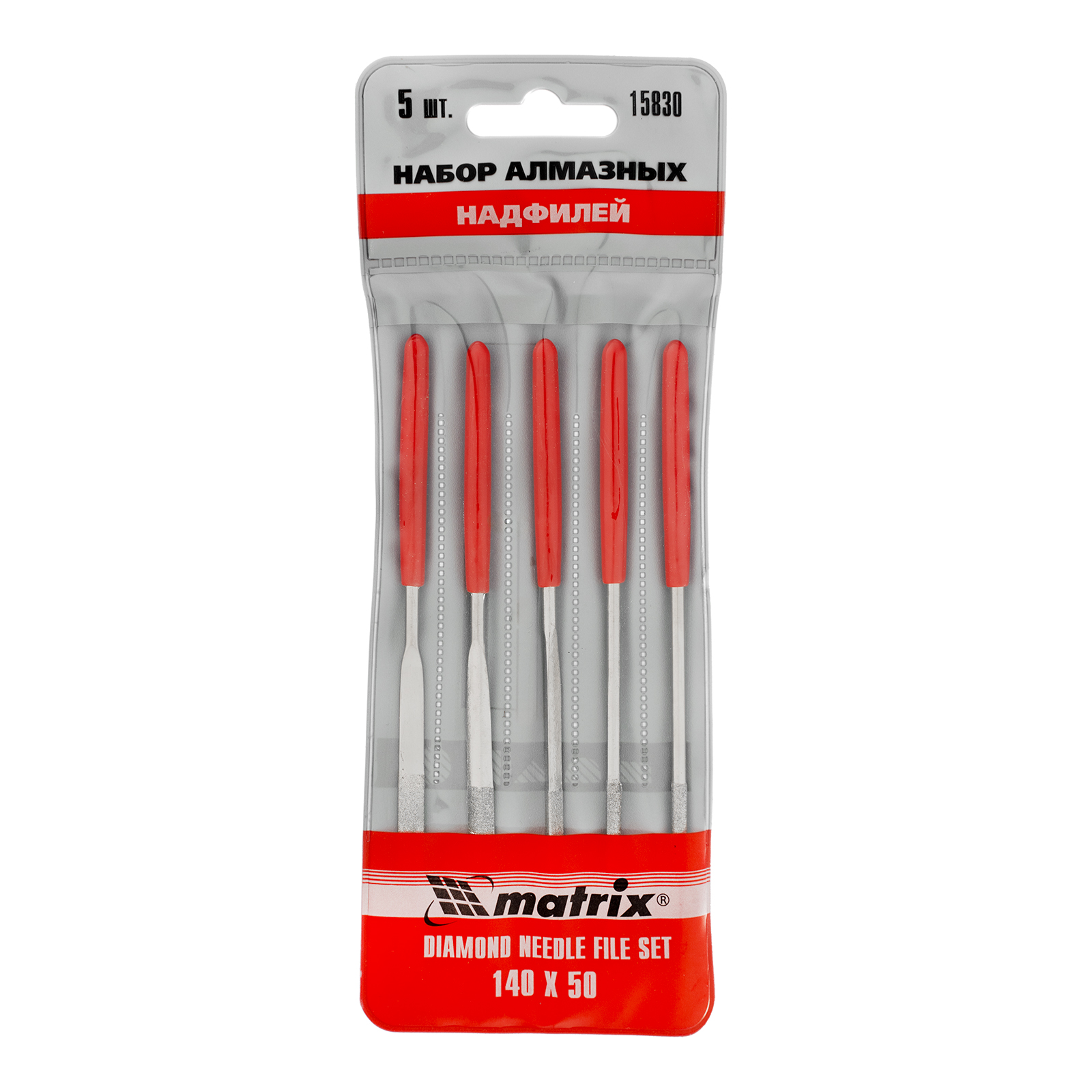 <p>Набор алмазных надфилей Matrix 15830 размером 140 х 50 х 3 мм предназначен для выполнения точных работ и используется для доводки и зачистки мелких деталей. Подходит для обработки металлических, стеклянных, керамических поверхностей. Набор универсален, т. к. в него входят 5 надфилей с разными сечениями профилей, что позволяет опиливать ровные поверхности, а также углы, пазы, округлые выступы. Надфили пригодятся в слесарном деле, при занятиях моделированием, будут полезны и в быту.</p><h2>Преимущества</h2><ul><li>Твердость и износостойкость — инструменты изготовлены из высокоуглеродистой стали.</li><li>Высокие абразивные свойства — на рабочие части нанесено напыление из алмазной крошки.</li><li>Комфортная работа — обрезиненные рукоятки не выскальзывают из ладони.</li><li>Быстрый поиск инструментов — красный цвет рукояток хорошо заметен в рабочем пространстве.</li></ul>