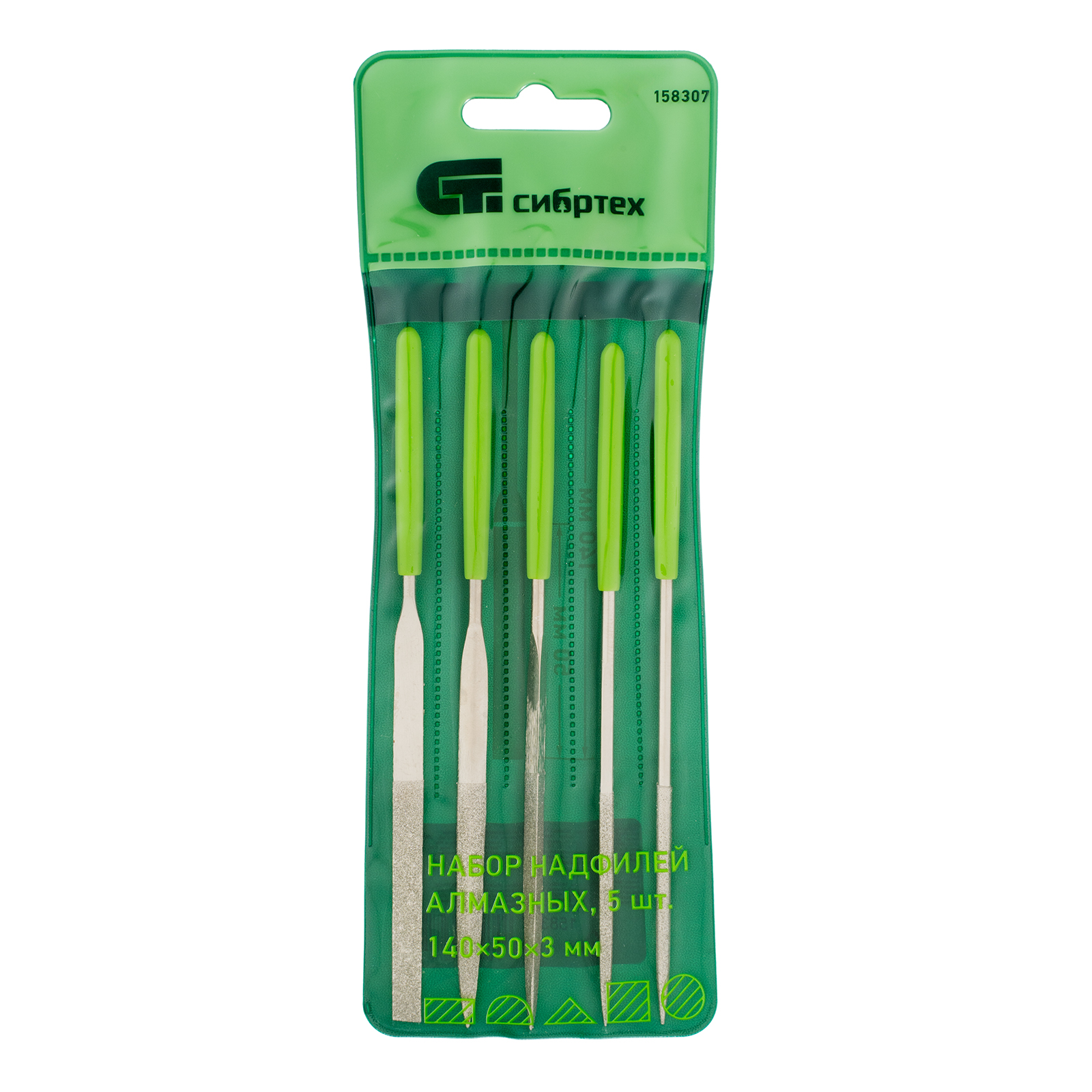 <p>Набор алмазных надфилей Сибртех 158307 из 5 шт. размером 140 х 50 х 3 мм предназначен для опиливания твердых поверхностей — стекла, металла, камня, керамики. В комплект поставки входят надфили с самыми распространенными профилями, благодаря чему можно обрабатывать плоские детали, пазы, углы, отверстия и рельефные поверхности. Набор будет полезен для проведения слесарных или ремонтно-отделочных работ, также пригодится в быту.</p><h2>Преимущества</h2><ul><li>Высокий ресурс — абразив из алмазной крошки характеризуется высокой твердостью.</li><li>Комфортная работа — обрезиненные рукоятки не выскальзывают из ладони.</li><li>Быстрый поиск среди других инструментов — яркие рукоятки хорошо заметны в рабочем пространстве.</li></ul>