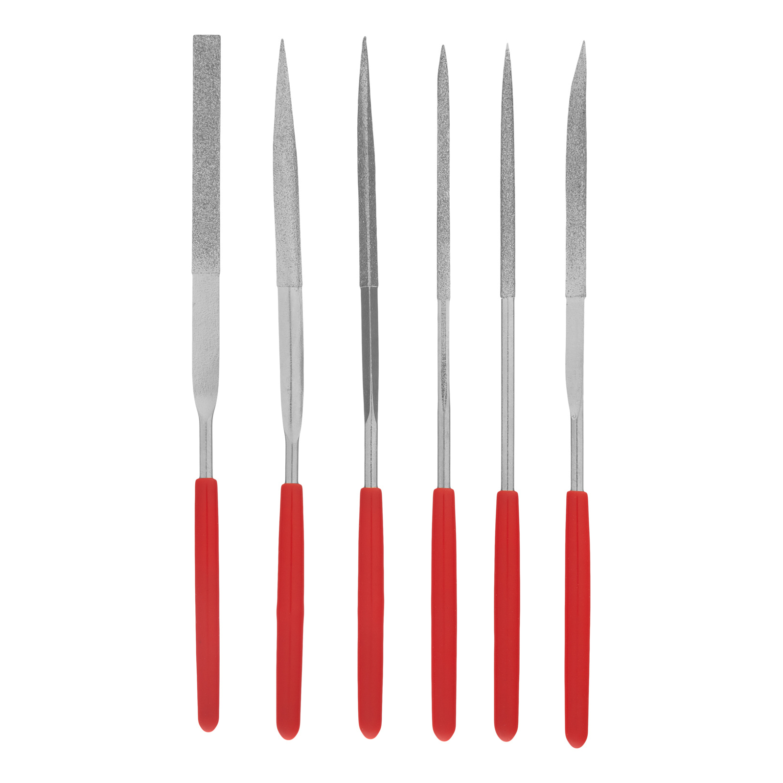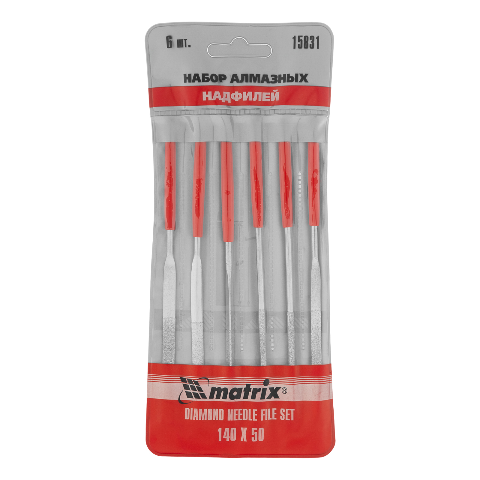 <p>Набор алмазных надфилей Matrix 15831 размером 140 х 50 х 3 мм предназначен для выполнения точных работ и используется для доводки и зачистки мелких деталей. Подходит для обработки металлических, стеклянных, керамических поверхностей. Набор универсален, т. к. в него входят 6 надфилей с разными сечениями профилей, что позволяет опиливать ровные поверхности, а также углы, пазы, отверстия и округлые выступы. Надфили пригодятся в слесарном деле, при занятиях моделированием, будут полезны и в быту.</p><h2>Преимущества</h2><ul><li>Твердость и износостойкость — инструменты изготовлены из высокоуглеродистой стали.</li><li>Высокие абразивные свойства — на рабочие части нанесено напыление из алмазной крошки.</li><li>Комфортная работа — обрезиненные рукоятки не выскальзывают из ладони.</li><li>Быстрый поиск инструментов — красный цвет рукояток хорошо заметен в рабочем пространстве.</li></ul>