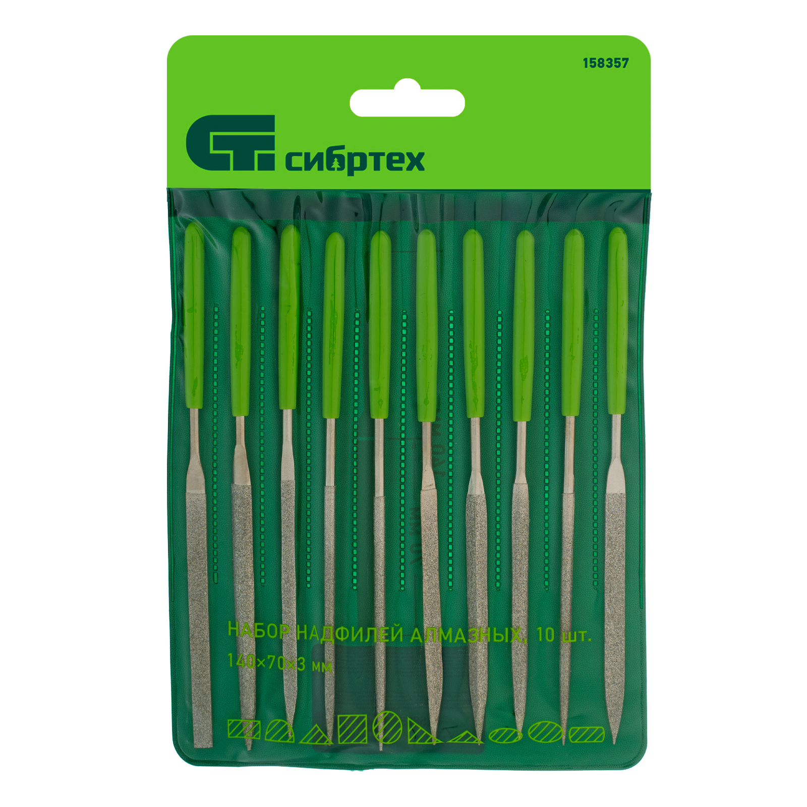 <p>Набор алмазных надфилей Сибртех 158357 из 10 шт., 140 х 70 х 3 мм, предназначен для опиливания твердых поверхностей — стекла, металла, камня, керамики. В комплекте надфили с самыми распространенными профилями, благодаря чему можно обрабатывать плоские детали, пазы, углы, отверстия, сложные грани и рельефные поверхности. Набор будет полезен при проведении слесарных или ремонтно-отделочных работ, пригодится и в быту.</p><h2>Преимущества</h2><ul><li>Алмазная крошка, являющаяся абразивом, характеризуется высокой твердостью, что увеличивает ресурс надфилей.</li><li>Обрезиненные рукоятки не выскальзывают из ладони, что обеспечивает комфорт во время работы.</li><li>Надфили с яркими рукоятками хорошо заметны среди других инструментов, поэтому не затеряются в рабочем пространстве.</li></ul>