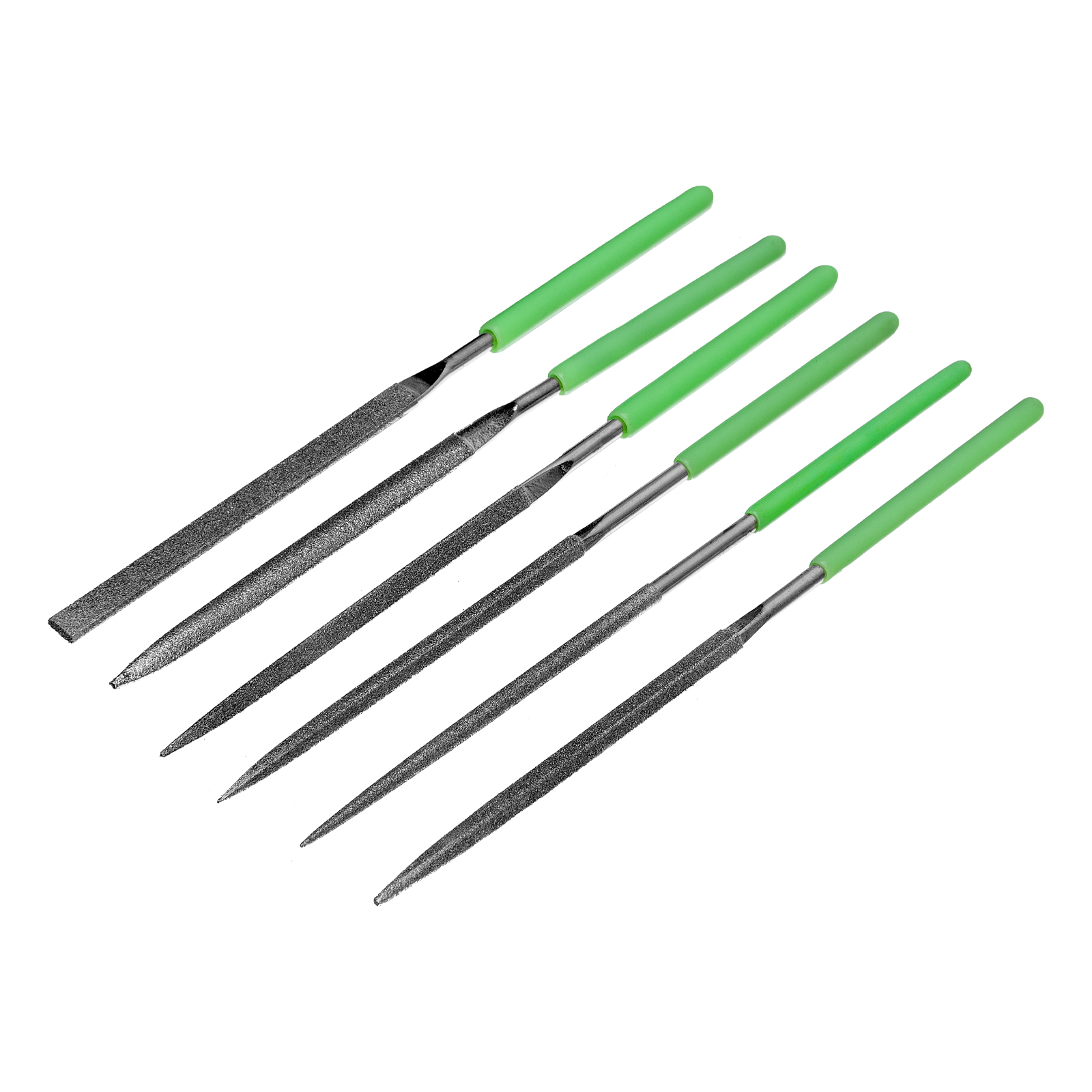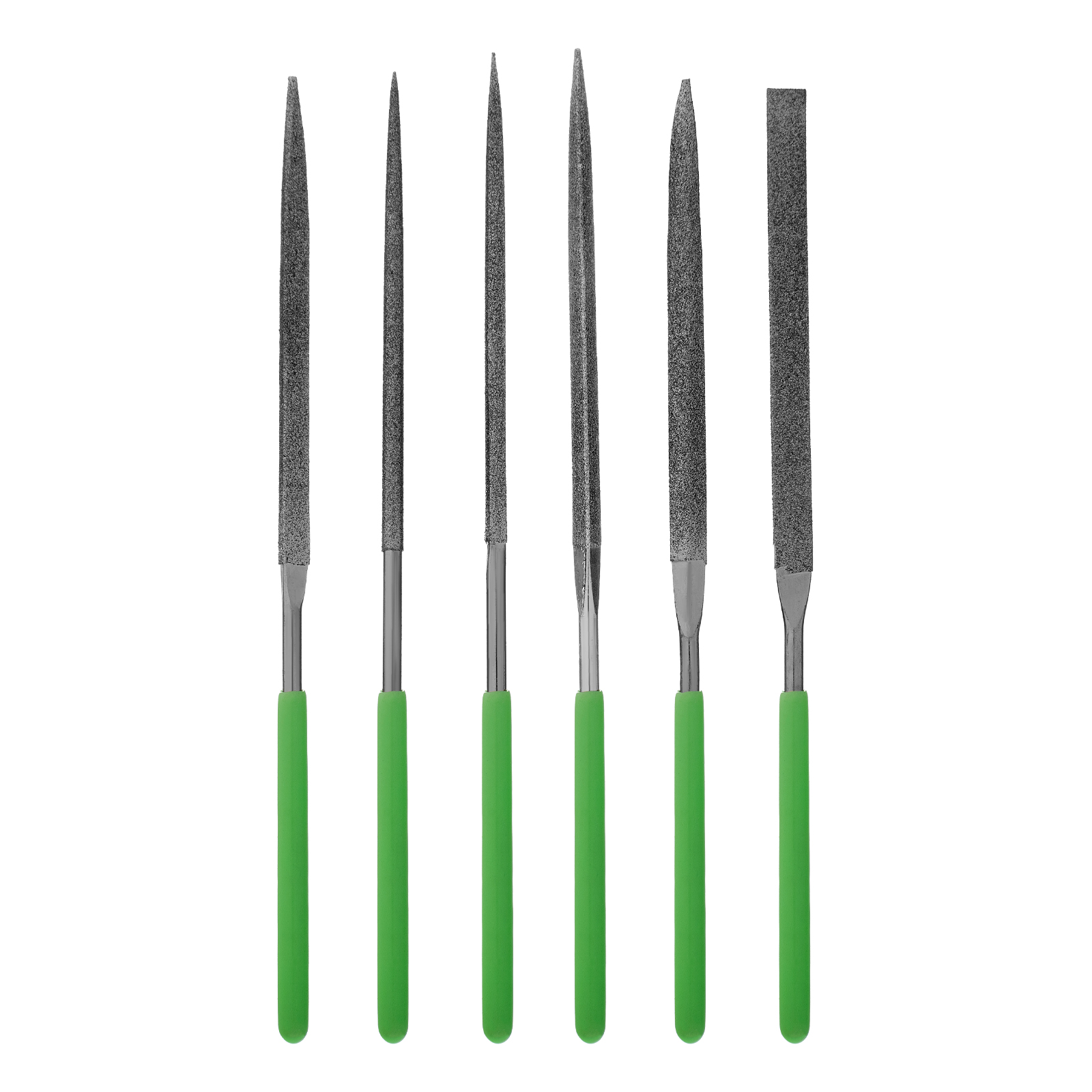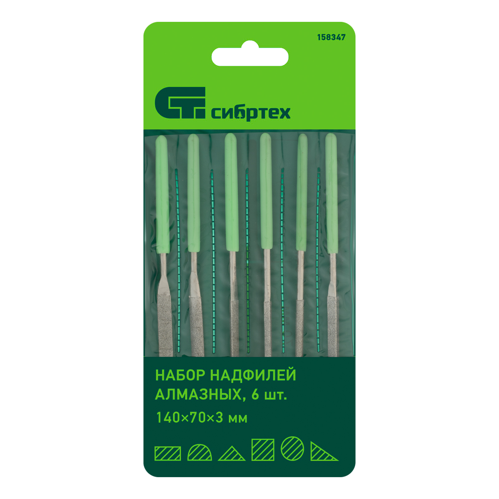 <p>Набор алмазных надфилей Сибртех 158347 из 6 шт. размером 140 х 70 х 3 мм предназначен для опиливания твердых поверхностей — стекла, металла, камня, керамики. В комплект поставки входят надфили с самыми распространенными профилями, благодаря чему можно обрабатывать плоские детали, пазы, углы, отверстия, сложные грани и рельефные поверхности. Набор будет полезен для проведения слесарных или ремонтно-отделочных работ, также пригодится в быту.</p><h2>Преимущества</h2><ul><li>Высокий ресурс — абразив из алмазной крошки характеризуется высокой твердостью.</li><li>Комфортная работа — обрезиненные рукоятки не выскальзывают из ладони.</li><li>Быстрый поиск среди других инструментов — яркие рукоятки хорошо заметны в рабочем пространстве.</li></ul>
