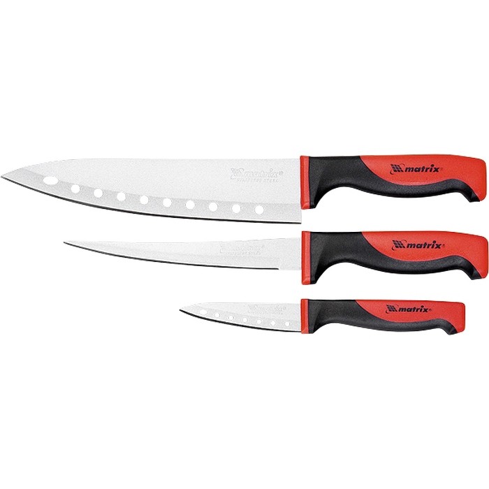 <ul><li>В набор входят большой, филейный и малый поварские ножи.</li></ul><ul><li>Все ножи имеют улучшенное тефлоновое покрытие полотна.</li></ul><ul><li>Большой и малый поварские ножи также оснащены технологическими отверстиями по длине лезвия, что существенно облегчает рез, увеличивает его эффективность и исключает прилипание продуктов.</li></ul><ul><li>Эргономичная двухкомпонентная антискользящая рукоятка с протектором для пальцев обеспечивает удобный захват, а значит, и комфортную и безопасную работу.</li></ul>