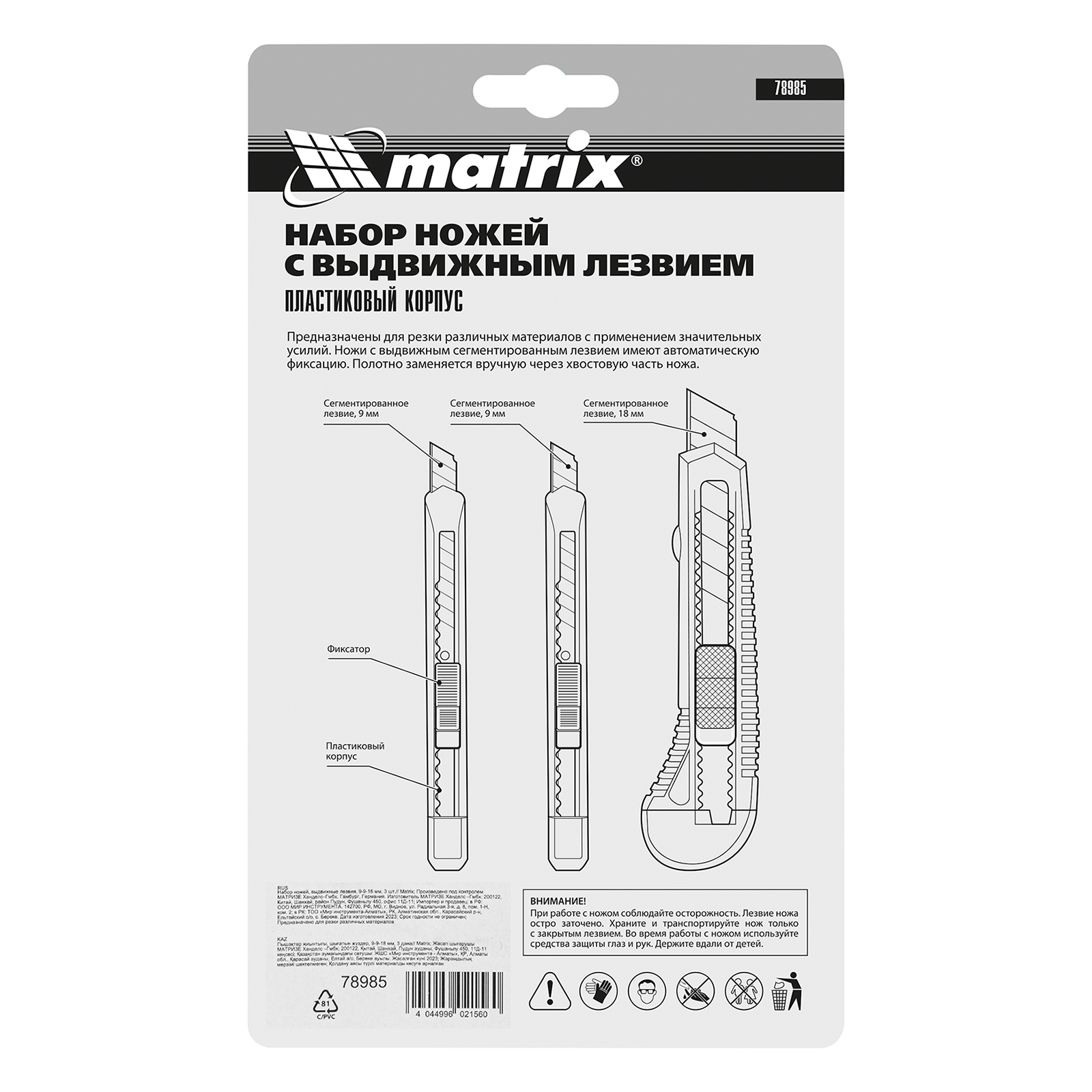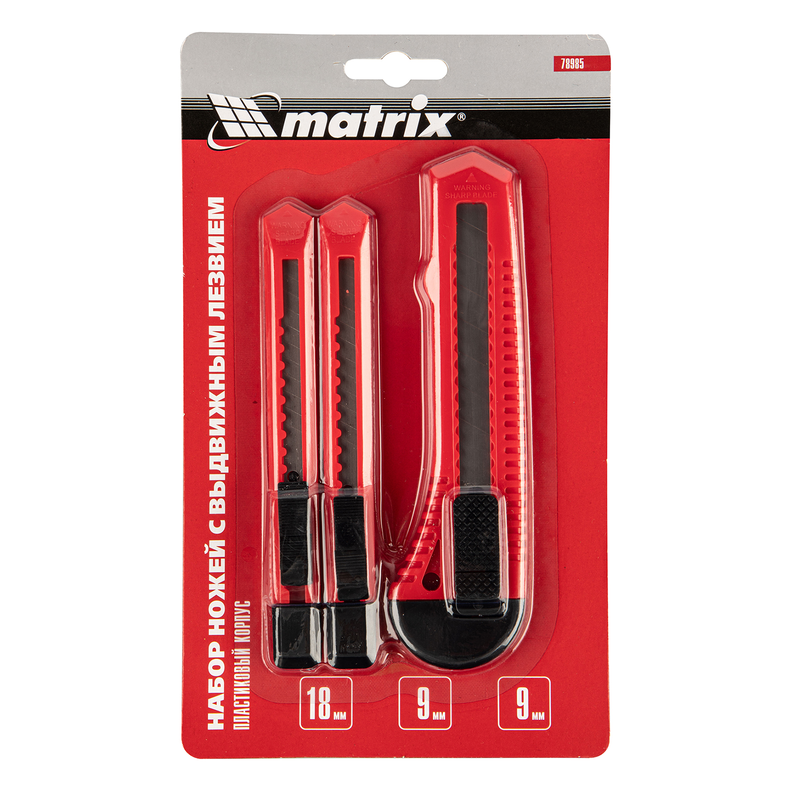 Набор Matrix 78985 состоит из 3 ножей с выдвижными лезвиями шириной 9-9-18 мм. Ими режут материалы, работа с которыми не требует особых усилий — картон, бумагу, обои, линолеум. Лезвия выдвигаются на необходимую длину в зависимости от толщины материала. Набор рекомендован для бытового использования.