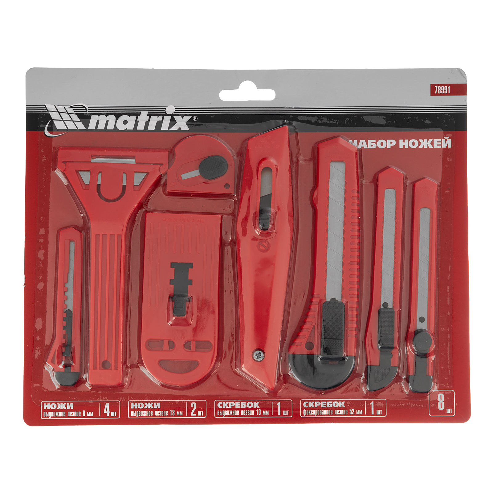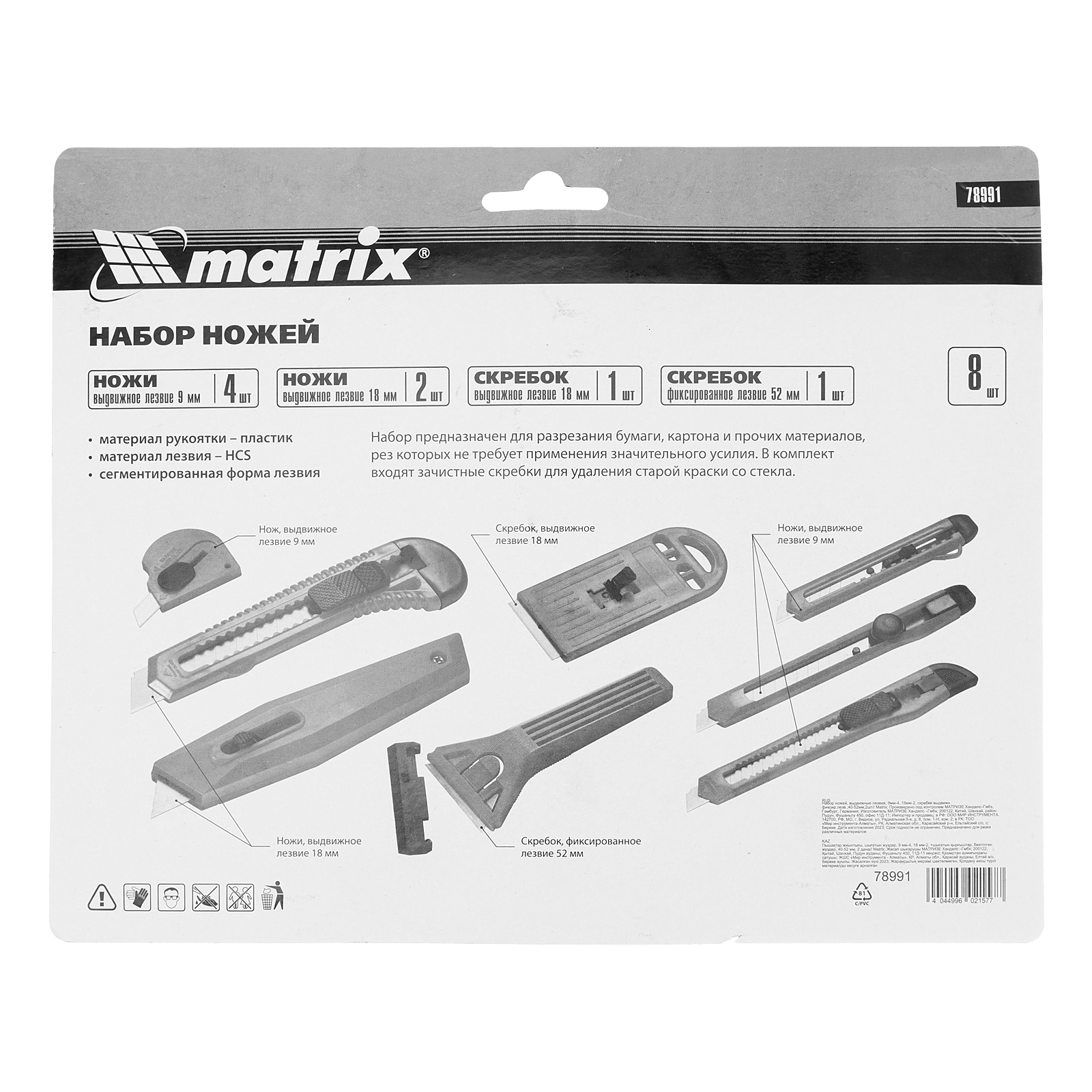Набор Matrix 78991 состоит из 4 ножей с выдвижными лезвиями шириной 9 мм, 2 ножей с лезвиями 18 мм, а также 2 скребков с выдвижным и фиксированным лезвиями шириной 40 и 52 мм соответственно. Ножи используются для резки картона, бумаги, обоев и других мягких материалов. С помощью скребков можно легко удалить засохшую краску со стекла или кафеля. Набор будет полезен во время ремонта, а также пригодится дома или в офисе.