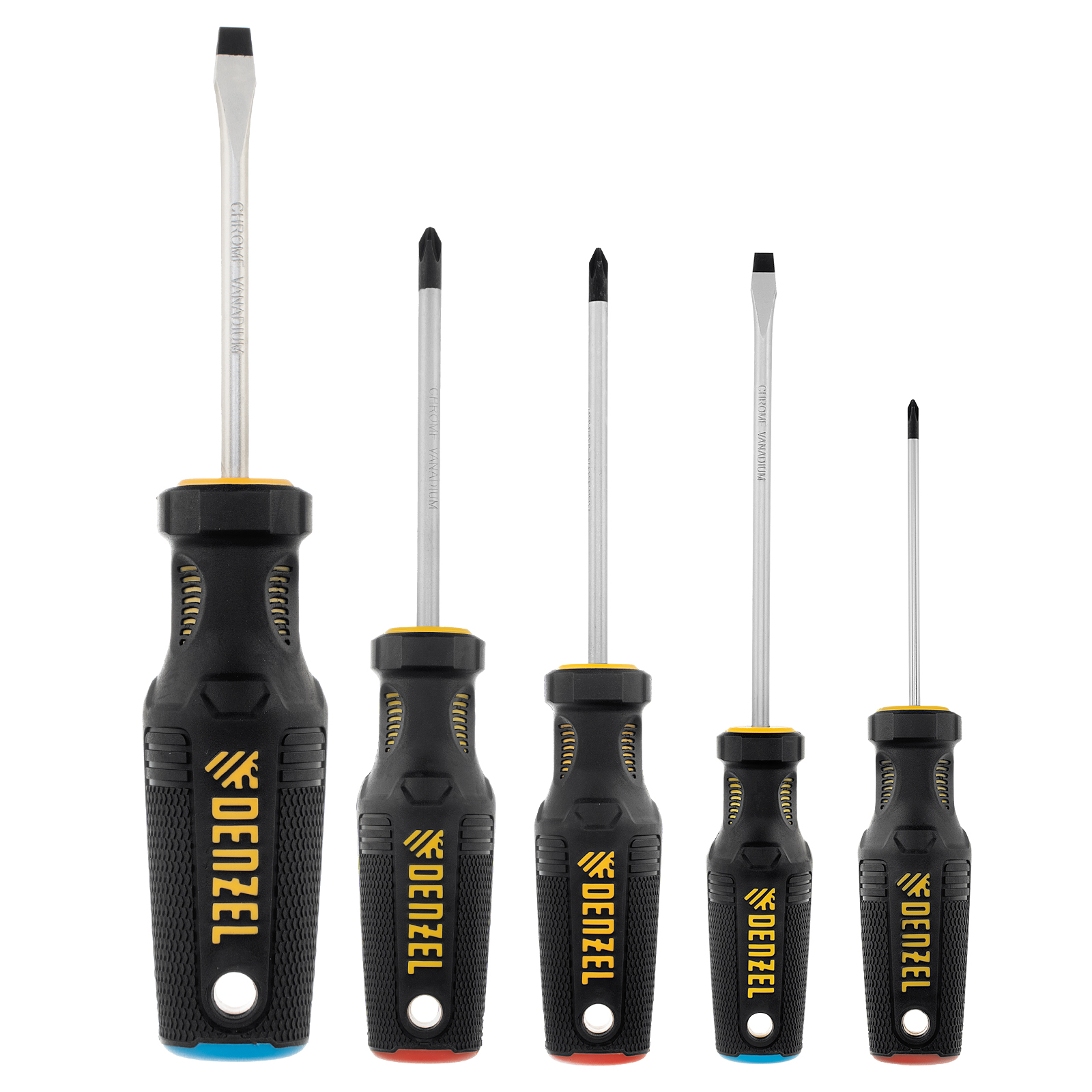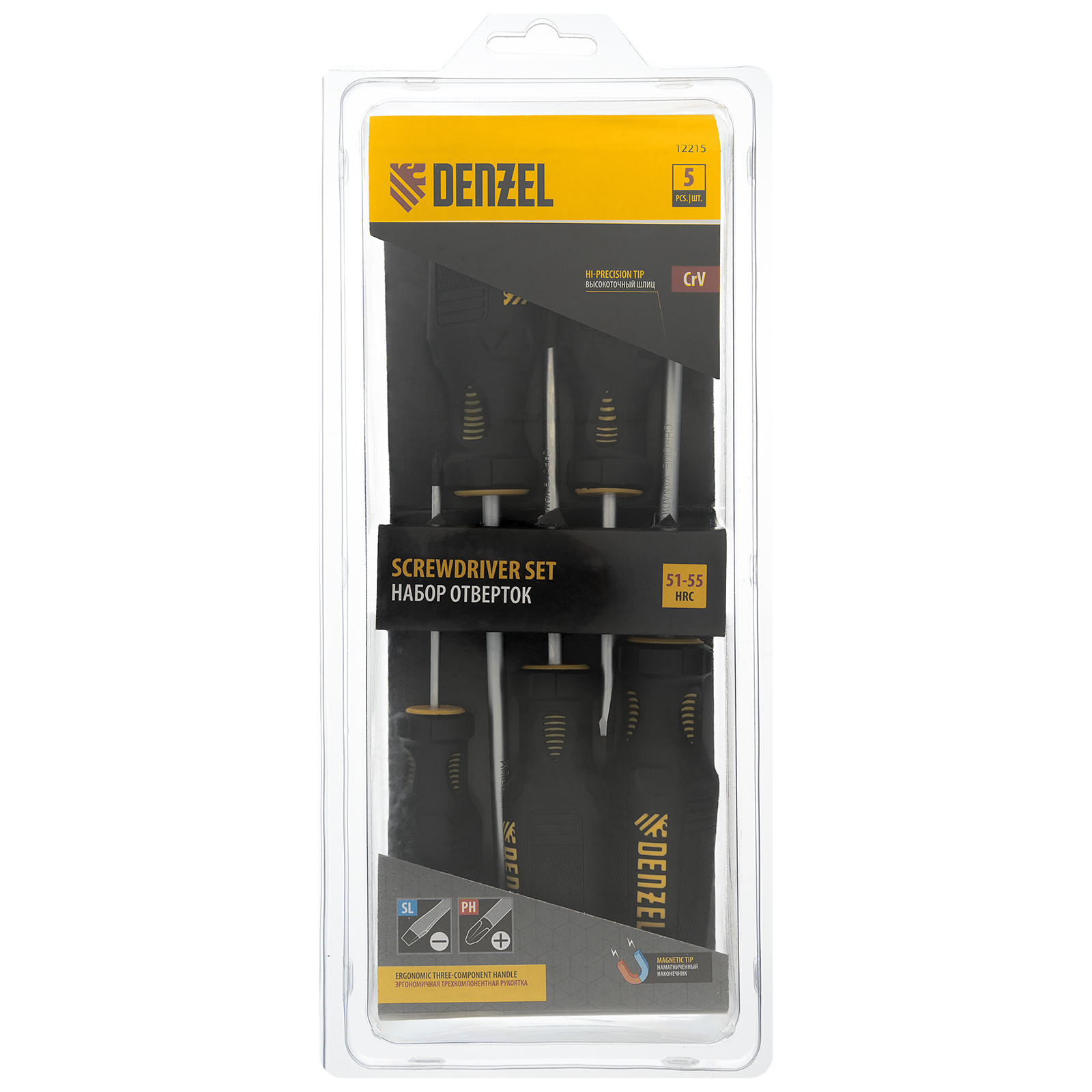 Набор Denzel 12215 из 5 отверток с трехкомпонентными рукоятками, изготовленных из стали CrV, используется для монтажа и демонтажа резьбовых крепежей со шлицами типа SL и PH. Во время работы не нужно придерживать винты или саморезы рукой, поскольку шлицы отверток намагничены. Набор подходит для интенсивного использования.