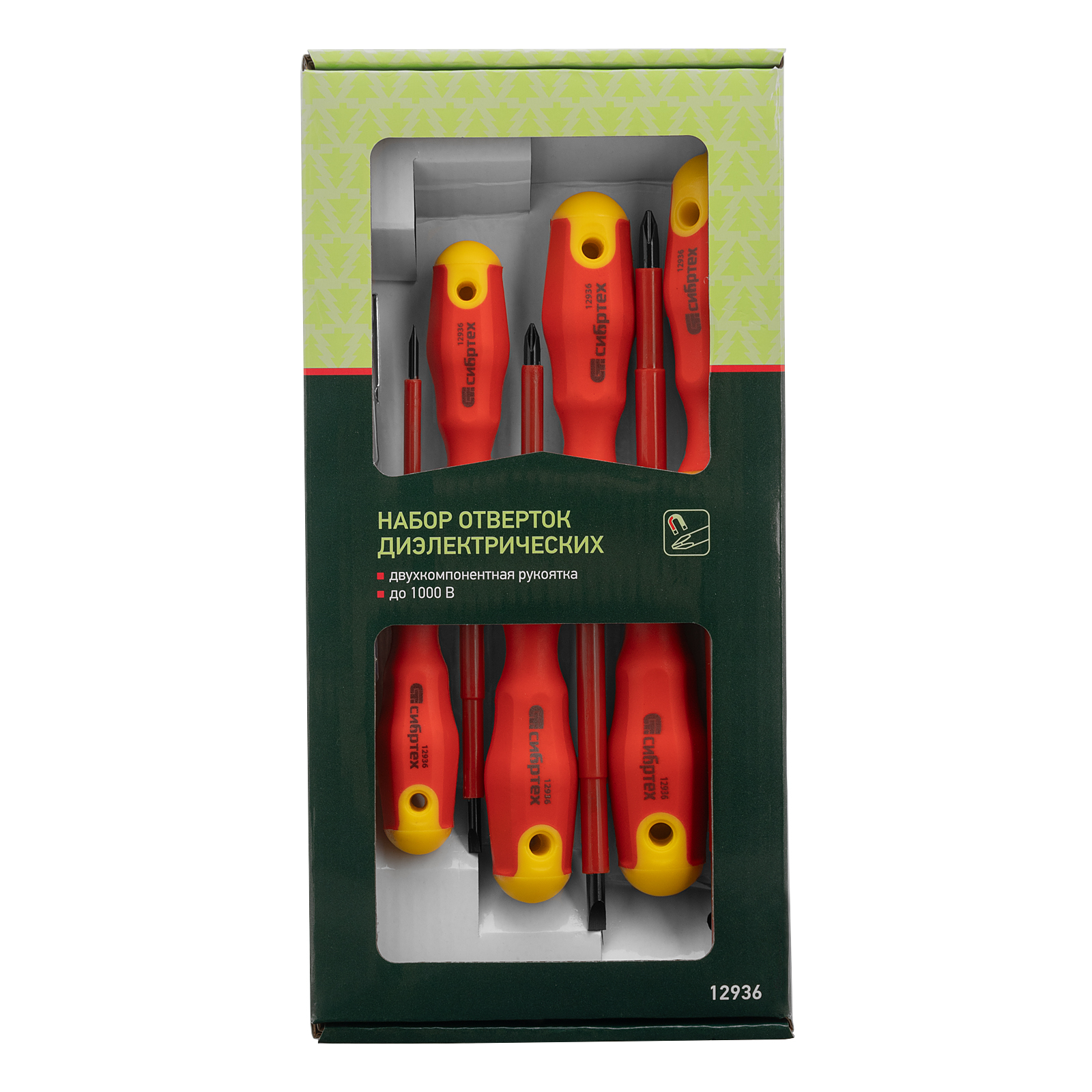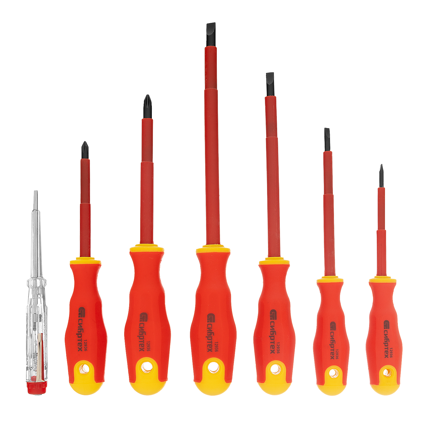 Набор диэлектрических отверток и тестер Сибртех 12936, CrV, с двухкомпонентными рукоятками, состоит из 7 предметов, которые пригодятся при обслуживании электрооборудования и электроприборов. Диэлектрическое покрытие защищает оператора от поражения током во время работ под напряжением до 1000 В. Широкий диапазон длины стержней отверток 80-125 мм позволяет выбрать оптимальную в зависимости от степени углубления крепежа. Важно — техника безопасности запрещает работу под напряжением даже при использовании инструмента с диэлектрическим покрытием!