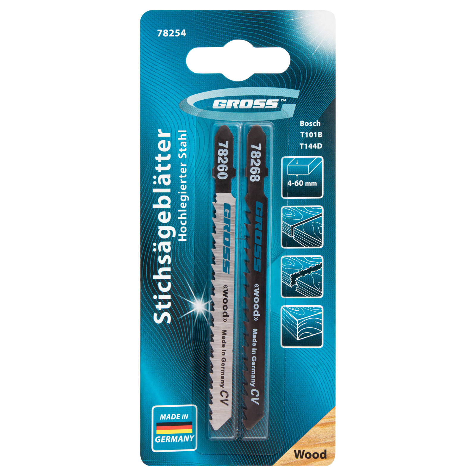 Набор полотен для электролобзика Gross 78254, 2шт. (T101B, T144D), — это профессиональный инструмент для работ по дереву. Он рассчитан на распил древесины любых пород, а также фанеры, ДВП и пластика. Полотна позволяют осуществить чистый и быстрый рез. Благодаря длине 100 мм они справляются с распилом материалов толщиной 4-60 мм.