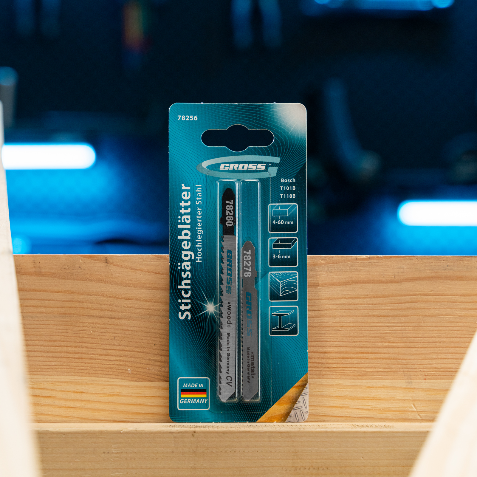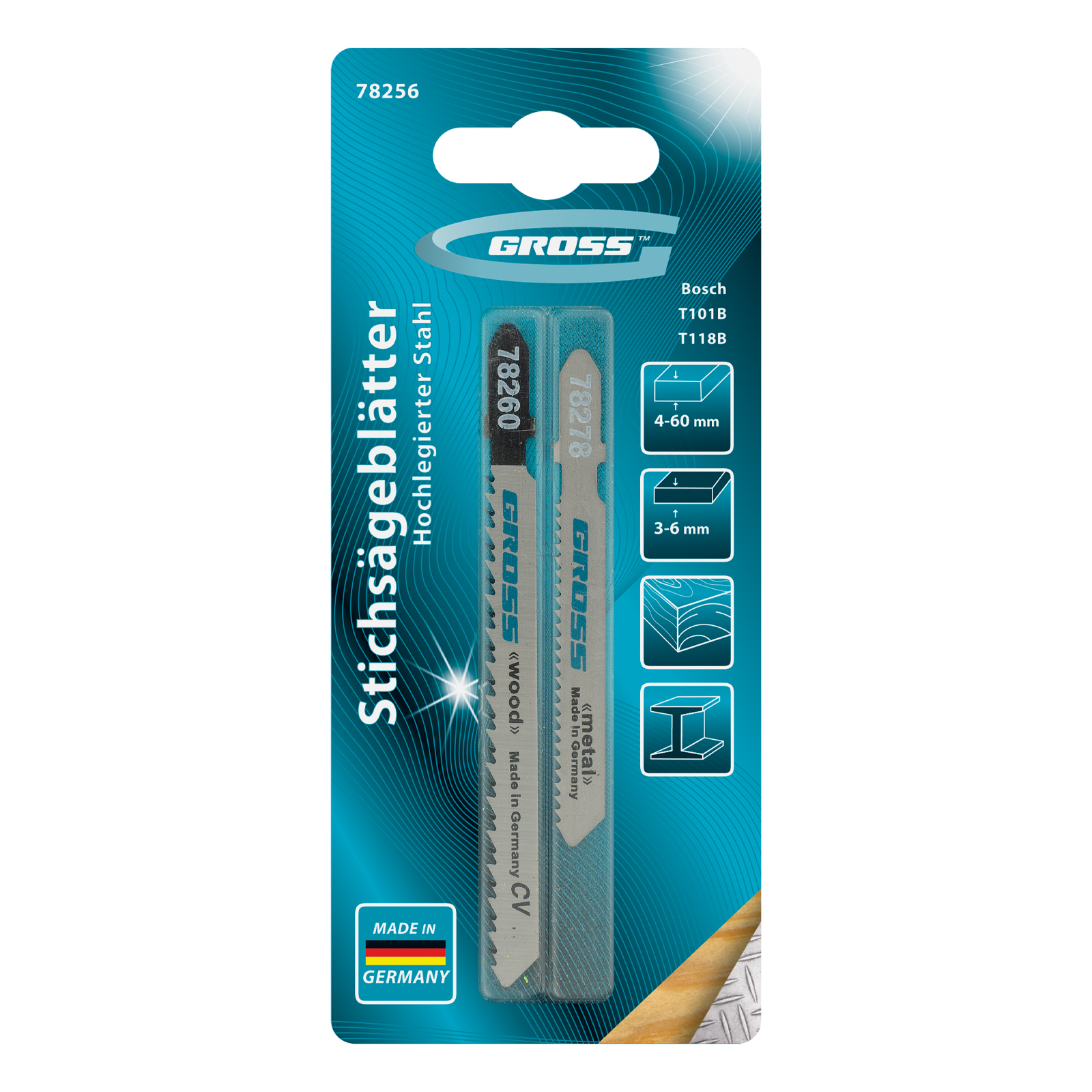 Универсальный набор полотен Gross 78256, 2 шт. в упаковке, предназначен для установки на электролобзики. Позволяет производить распил металлов толщиной 3-6 мм, а также древесины толщиной 4-60 мм. Благодаря отшлифованной под конус боковой поверхности полотна оставляют аккуратную кромку в месте распила.