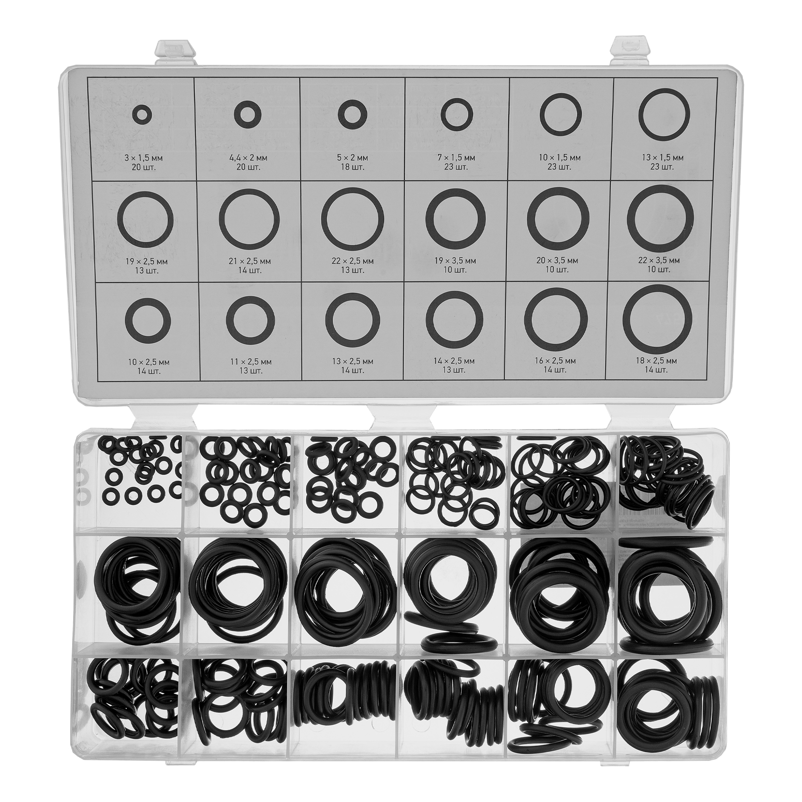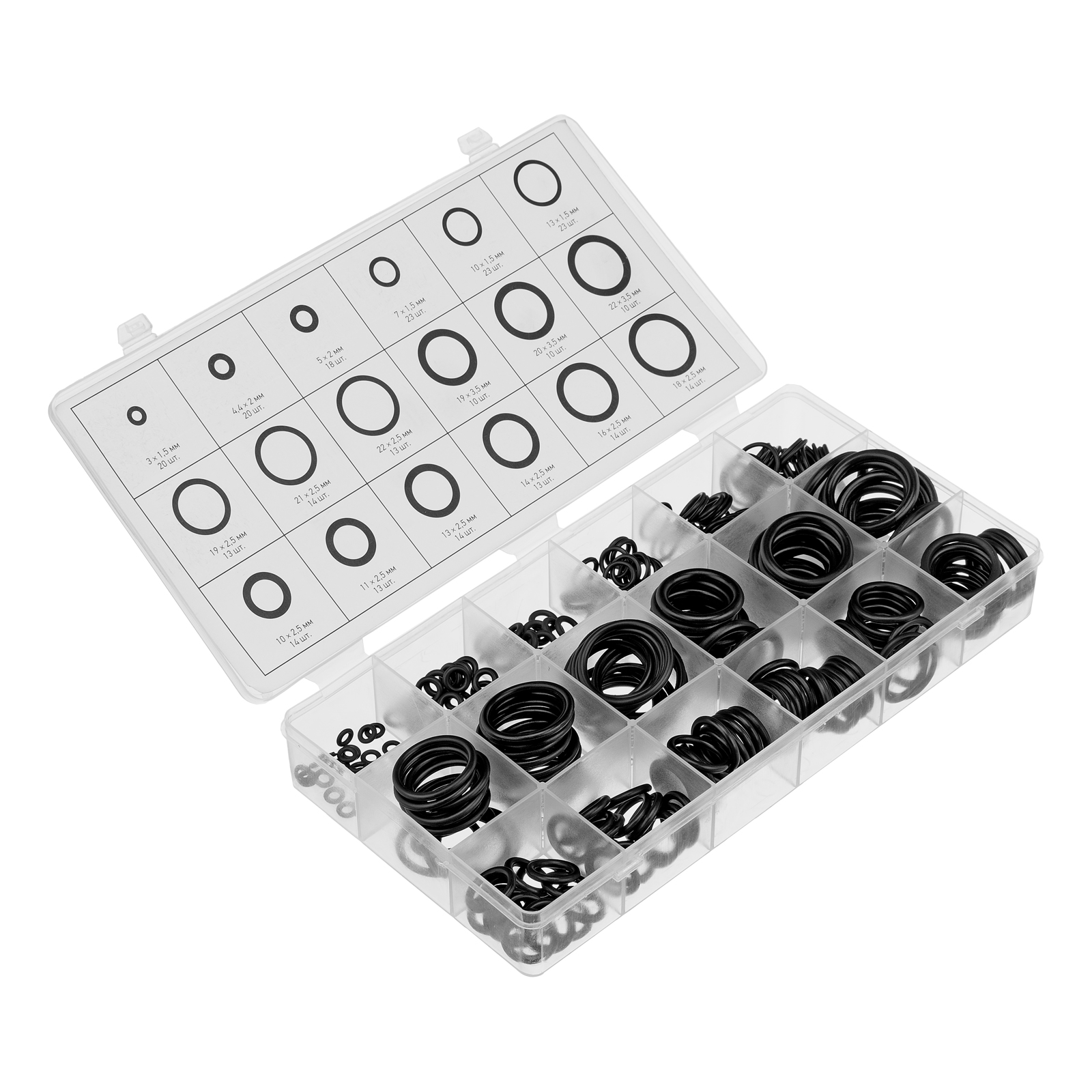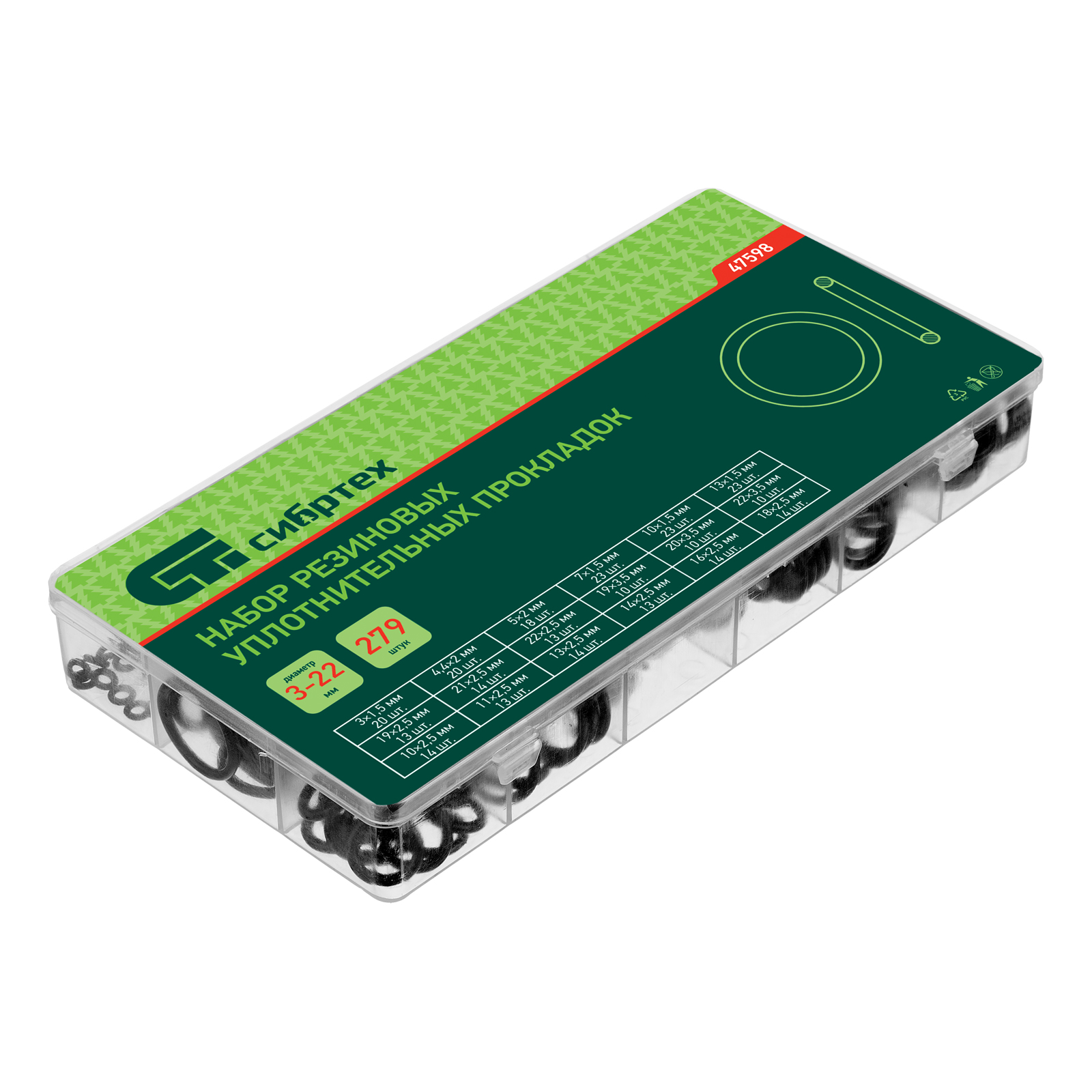 Набор Сибртех 47598 состоит из 279 резиновых уплотнительных прокладок с наружным диаметром от 3 до 22 мм и используется для создания герметичных конструкций. Позволяет решать широкий спектр задач, т. к. включает кольца наиболее часто встречающихся размеров. Прокладки используют для сантехнических и других ремонтных работ, а также в качестве уплотнительных резинок для автомобиля.