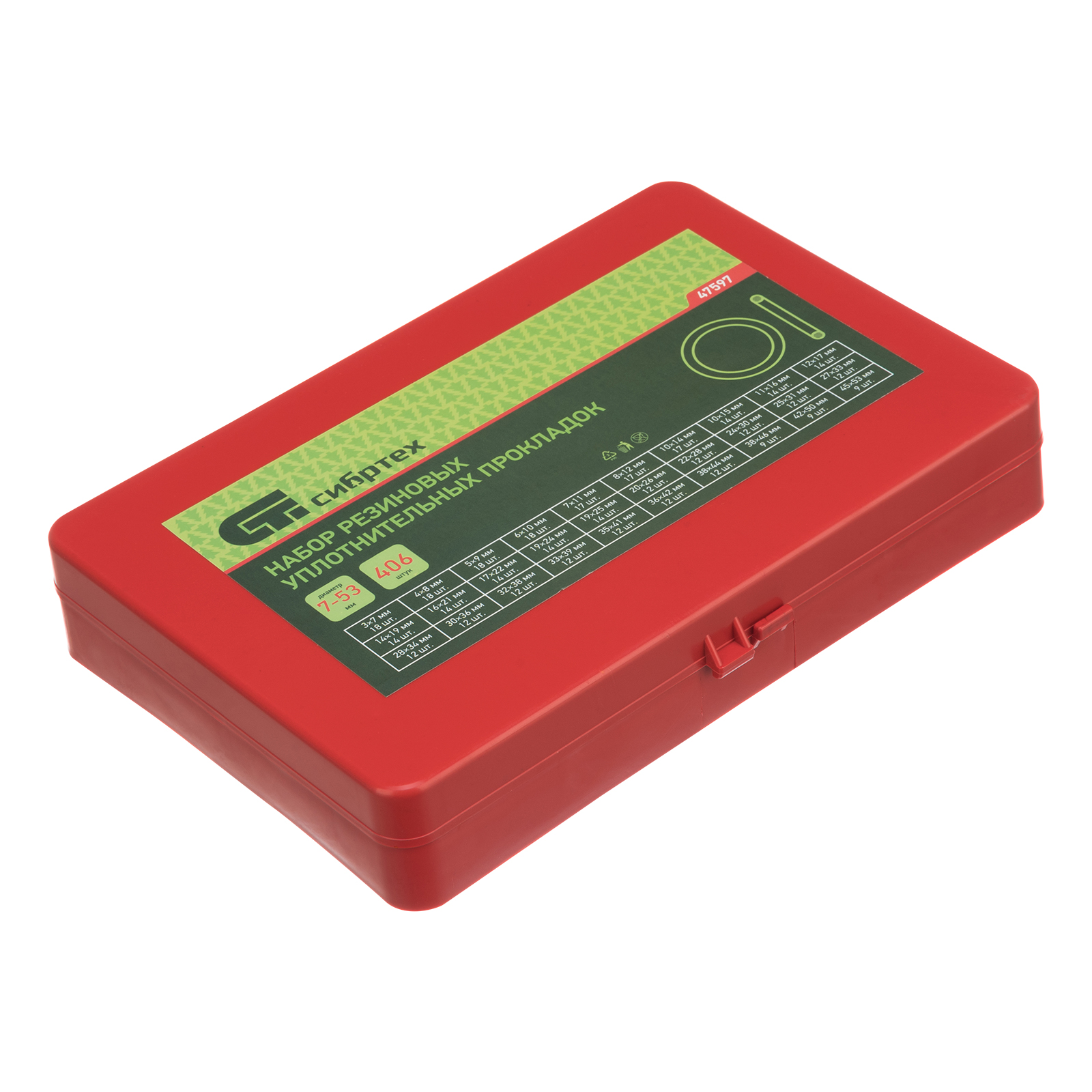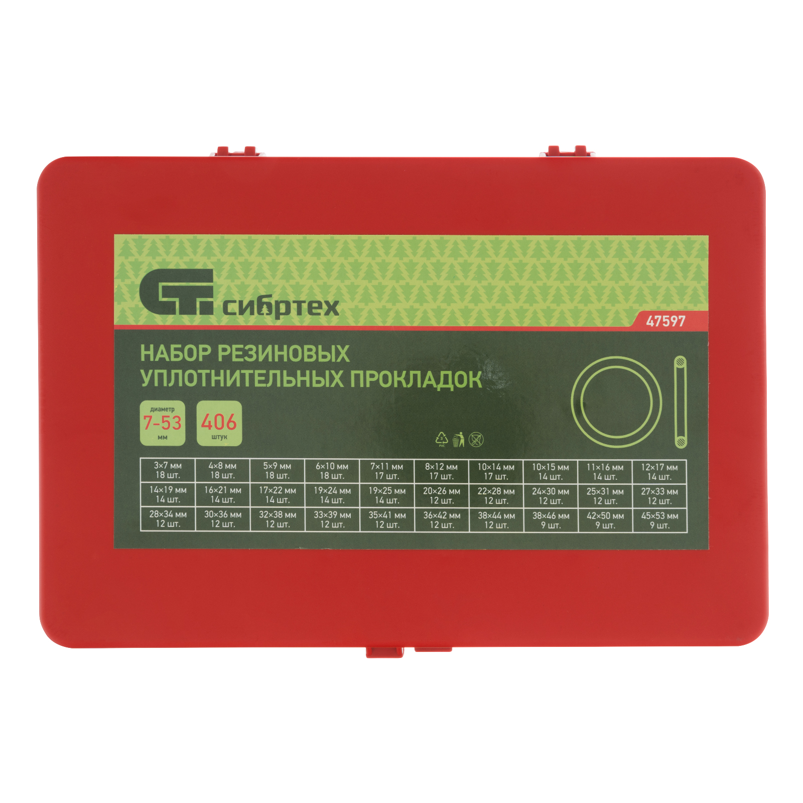 Набор Сибртех 47597 состоит из 406 резиновых уплотнительных прокладок с наружным диаметром от 7 до 53 мм и используется для создания герметичных конструкций. Позволяет решать широкий спектр задач, т. к. включает кольца наиболее часто встречающихся размеров. Прокладки используют для сантехнических и других ремонтных работ, а также в качестве уплотнительных резинок для автомобиля.