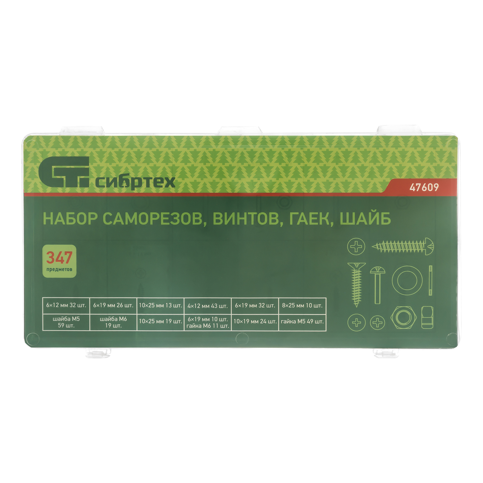 <p>Набор Сибртех 47609 состоит из 347 предметов и включает саморезы с диаметром резьбы от 4 до 8 мм и длиной от 12 до 25 мм, а также гайки М5-М6, шайбы 5 и 6 мм и винты 10 х 25 мм, 6 х 19 мм, 10 х 19 мм. Крепежные элементы предназначены для создания надежных резьбовых соединений и используются для сборки мебели, техники, монтажа оборудования, проведения сантехнических работ, а также в автомобилестроении. Также будут полезны дома или на даче.</p><h2>Преимущества</h2><ul><li>Эффективное решение разнообразных задач — в набор входят крепежные изделия различных типов и наиболее распространенных размеров.</li><li>Прочность и долговечность — крепеж изготовлен из твердой стали и оцинкован для защиты от коррозии.</li><li>Удобное хранение и транспортировка — набор упакован в пластиковый кейс с 12 отсеками.</li></ul>