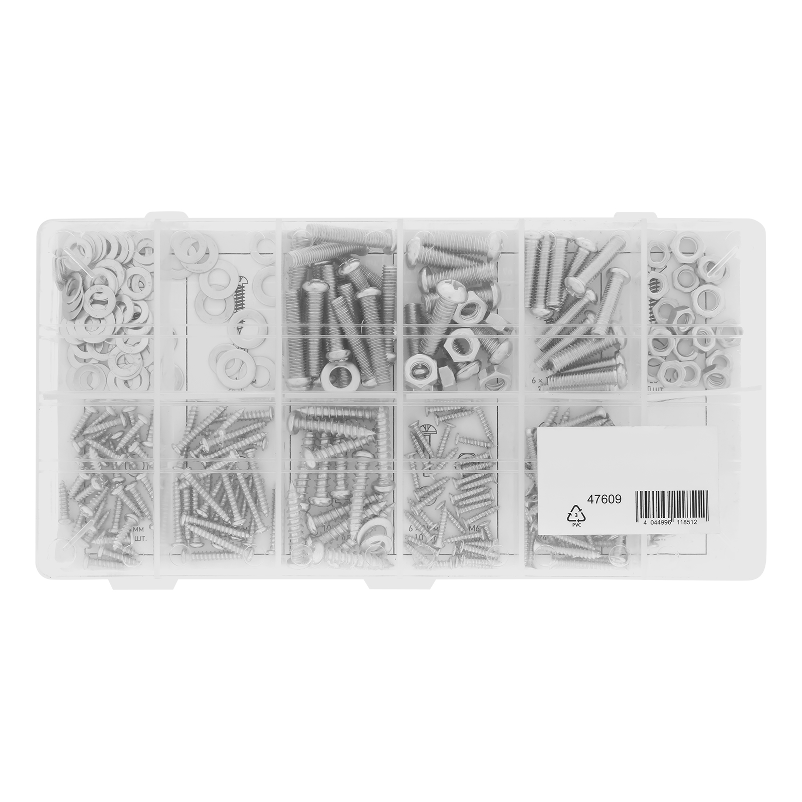 Набор Сибртех 47609 состоит из 347 предметов и включает саморезы с диаметром резьбы от 4 до 8 мм и длиной от 12 до 25 мм, а также гайки М5-М6, шайбы 5 и 6 мм и винты 10 х 25 мм, 6 х 19 мм, 10 х 19 мм. Крепежные элементы предназначены для создания надежных резьбовых соединений и используются для сборки мебели, техники, монтажа оборудования, проведения сантехнических работ, а также в автомобилестроении. Также будут полезны дома или на даче.