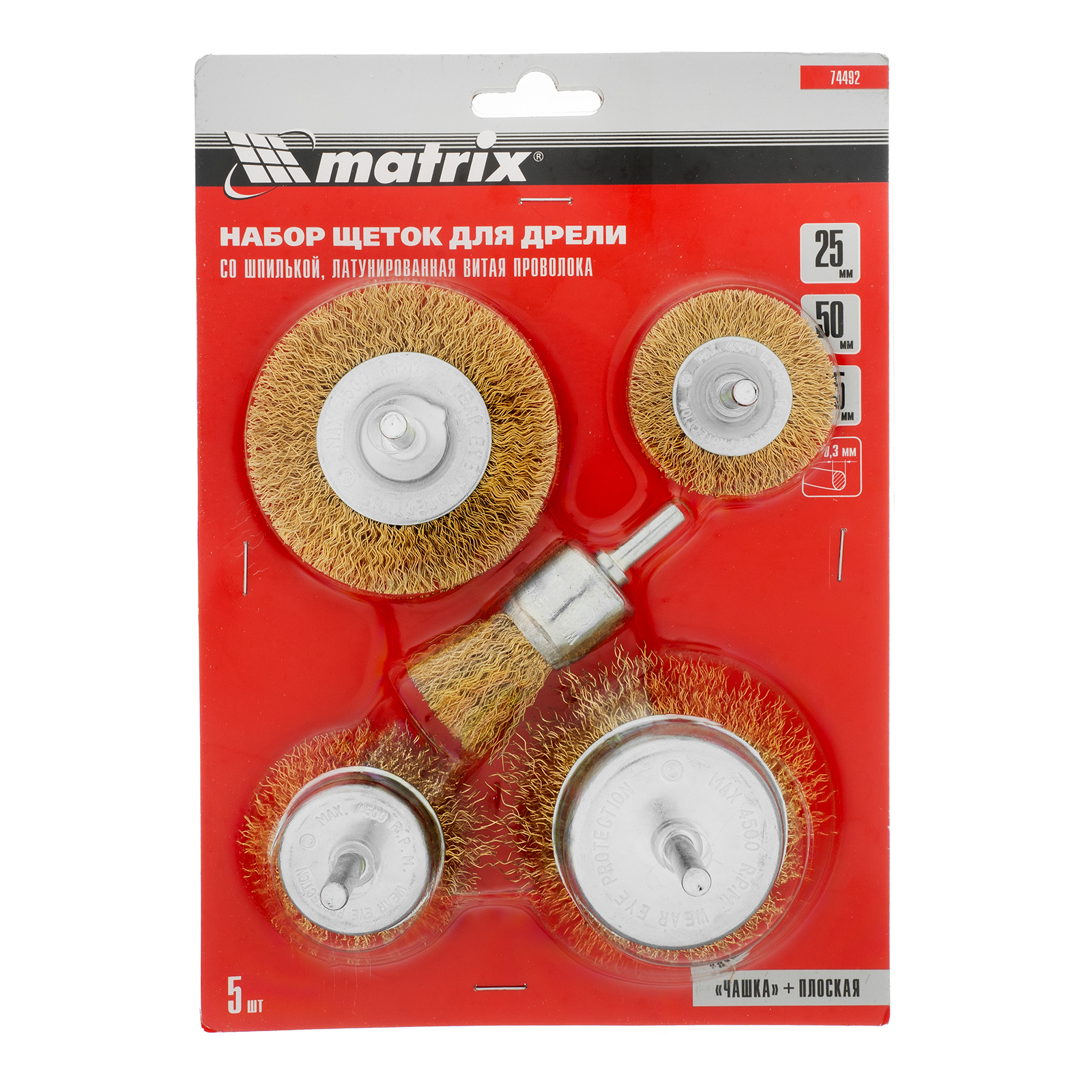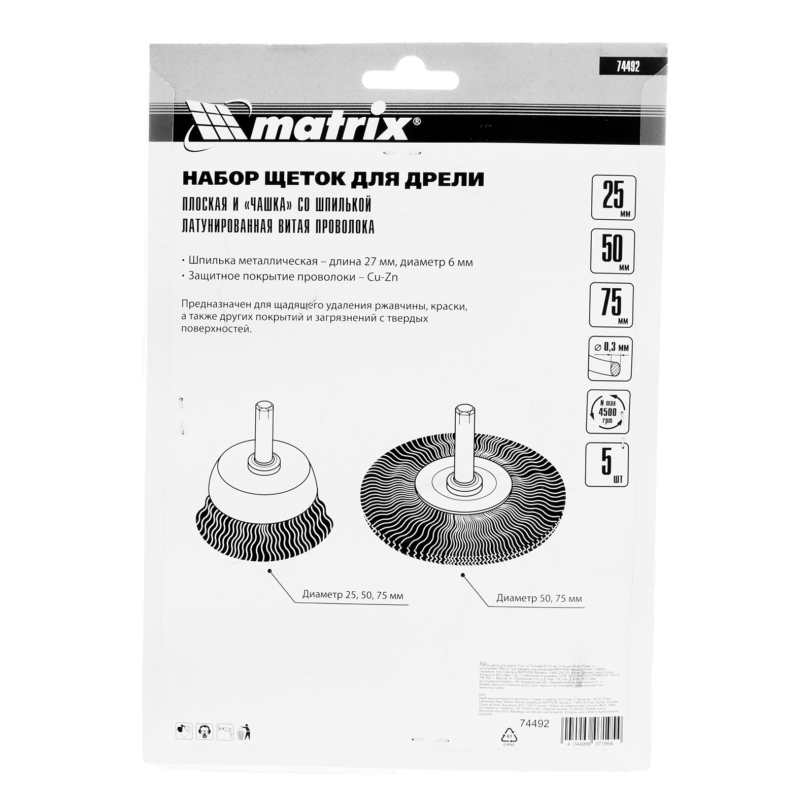 Набор щеток со шпильками Matrix 74492 (две плоские диаметром 50-75 мм и три «чашки» диаметром 25-50-75 мм) включает насадки на дрель, предназначенные для щадящей обработки поверхностей различной площади. Рекомендованная скорость вращения — не более 4500 об/мин. Плоские щетки оптимальны для зачистки труднодоступных мест, углов и изгибов, а «чашки» — для обработки плоскостей. С помощью насадок можно счистить с поверхностей ржавчину, загрязнения и старые лакокрасочные покрытия.