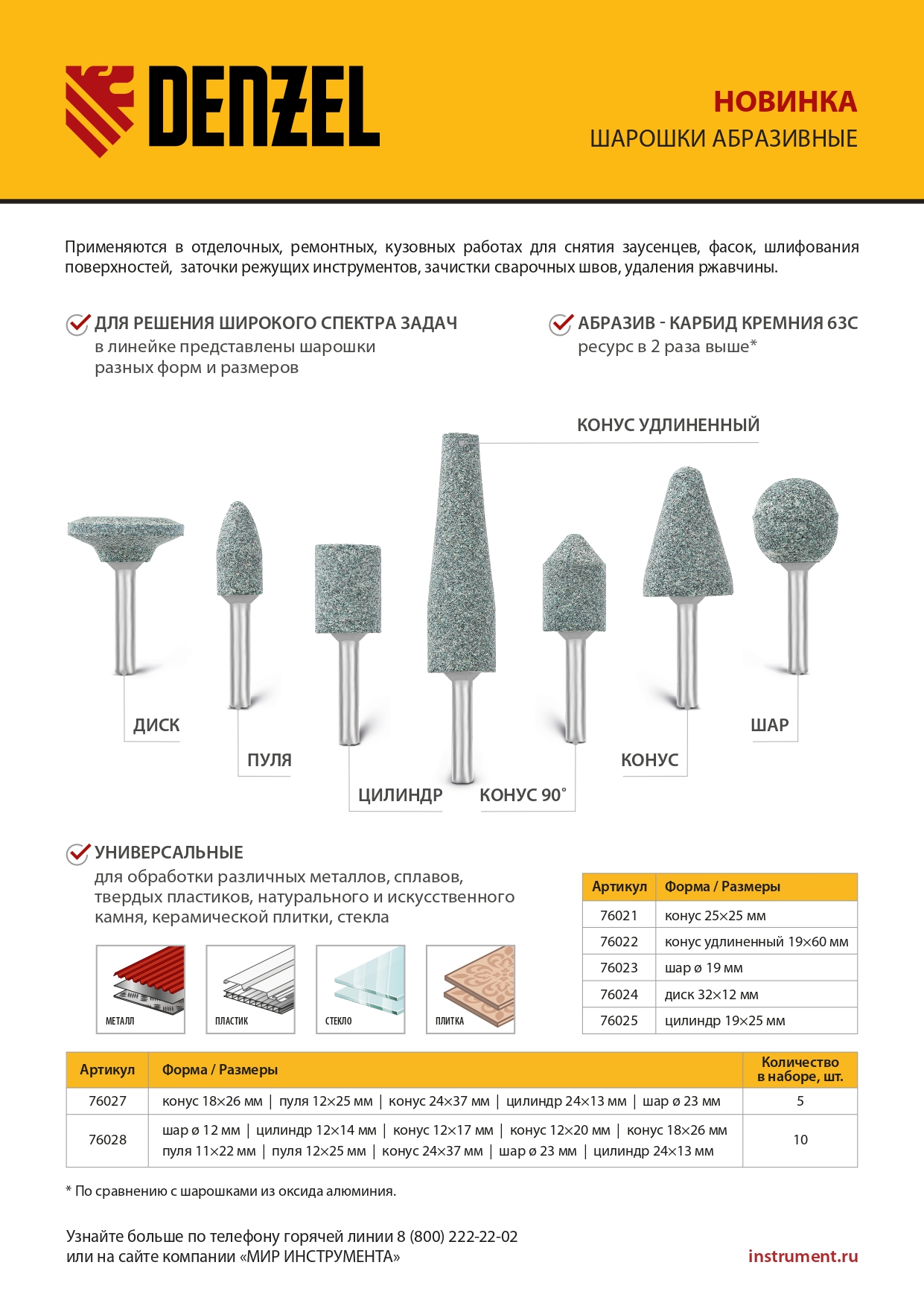 <p>Набор Denzel 76028 включает в себя 10 шарошек для дрели, шуруповерта или прямошлифовальной машины (ПШМ). Оснастка предназначена для зачистки сварных швов, канавок, углублений, снятия фасок и заусенцев, расширения отверстий и обработки деталей с рельефной поверхностью. Набор шарошек пригодится в ремонтной мастерской, автосервисе, будет полезен при выполнении отделочных работ.</p><h2>Преимущества</h2><ul><li>Износостойкость — карбид кремния (63C) сохраняет рабочие свойства вдвое дольше, чем оксид алюминия.</li><li>Универсальность — шарошки подходят для обработки металла, различных сплавов, стекла, пластика, керамической плитки, натурального и искусственного камня.</li><li>Решение широкого спектра задач — в набор входят шарошки наиболее популярных размеров и форм (конус, пуля, цилиндр, шар).</li></ul>