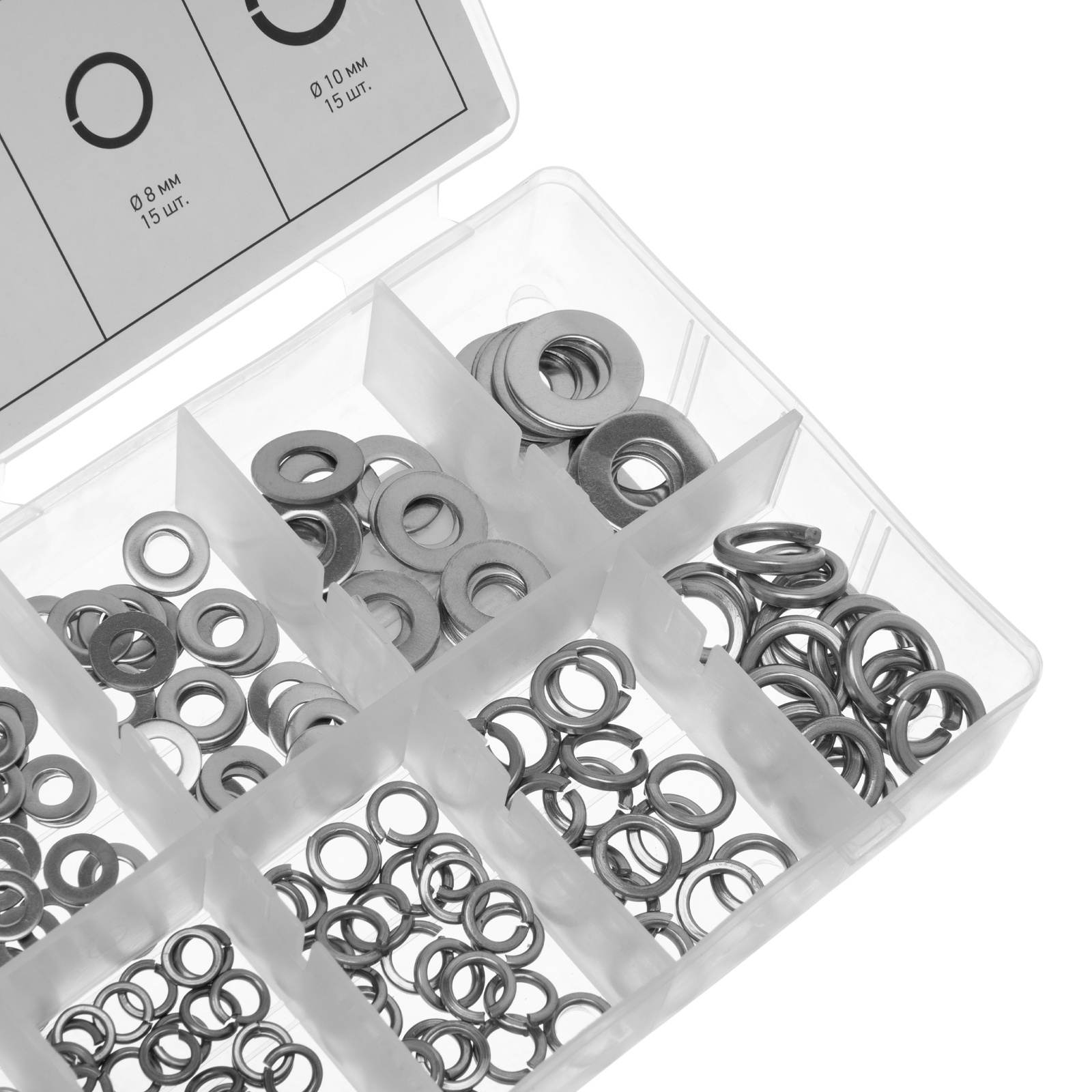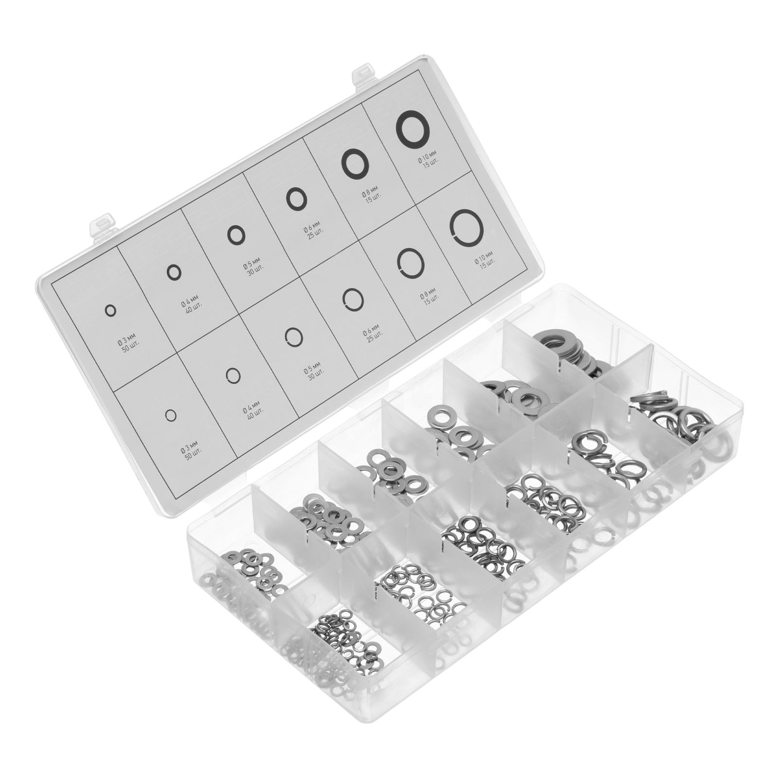 Пластиковый кейс - 1 штШайбы плоские: 3 мм - 50 шт4 мм - 40 шт5 мм - 30 шт6 мм - 25 шт8 мм - 15 шт10 мм - 15 штШайбы гроверы: 3 мм - 50 шт4 мм - 40 шт5 мм - 30 шт6 мм - 25 шт8 мм - 15 шт10 мм - 15 шт