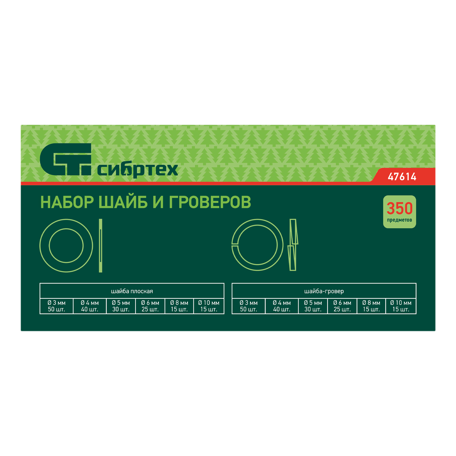 <p>Набор плоских шайб и гроверов Сибртех 47614 состоит из 350 предметов размером 3, 4, 5, 6, 8 и 10 мм. Они служат для усиления резьбовых соединений и предотвращения их раскручивания. Набор будет полезен в строительстве, при сборке мебели, бытовой техники и электроники, пригодится также и в домашнем хозяйстве. </p><h2>Преимущества</h2><ul><li>Надежность — стальные метизы отличаются прочностью и устойчивостью к нагрузкам.</li><li>Коррозионная стойкость — на шайбы нанесено цинковое покрытие.</li><li>Широкие возможности применения — в набор входят шайбы самых популярных размеров.</li><li>Удобное использование и хранение — крепежные элементы упакованы в пластиковый кейс и рассортированы по отделениям в соответствии с размером.</li></ul>