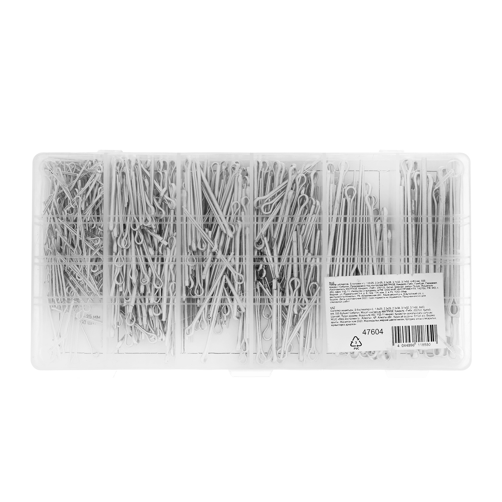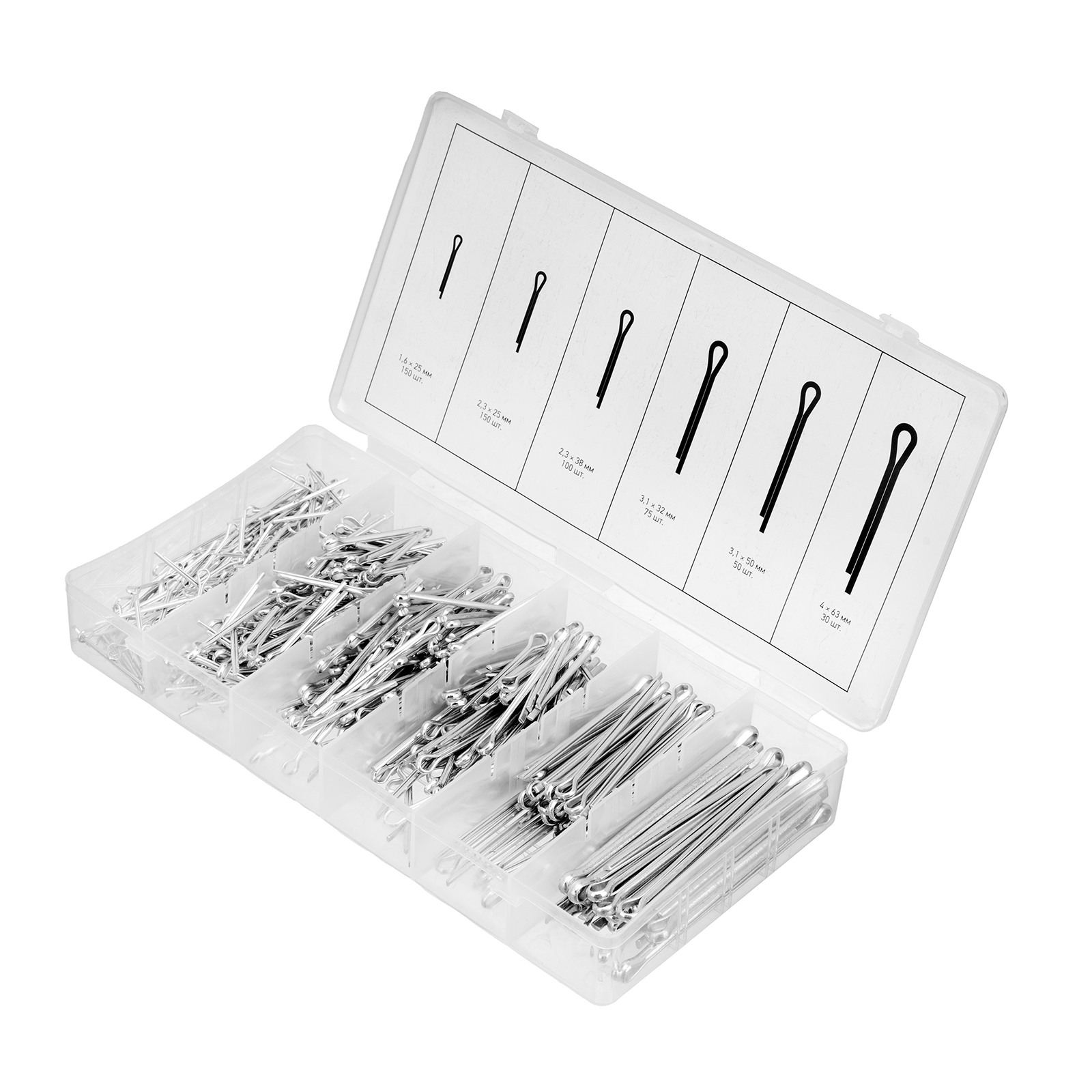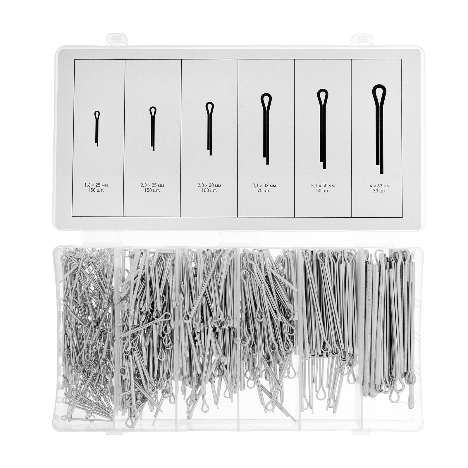 Быстрый поиск нужного крепежа — шплинты помещены в индивидуальные отсеки с маркировкой размеров.