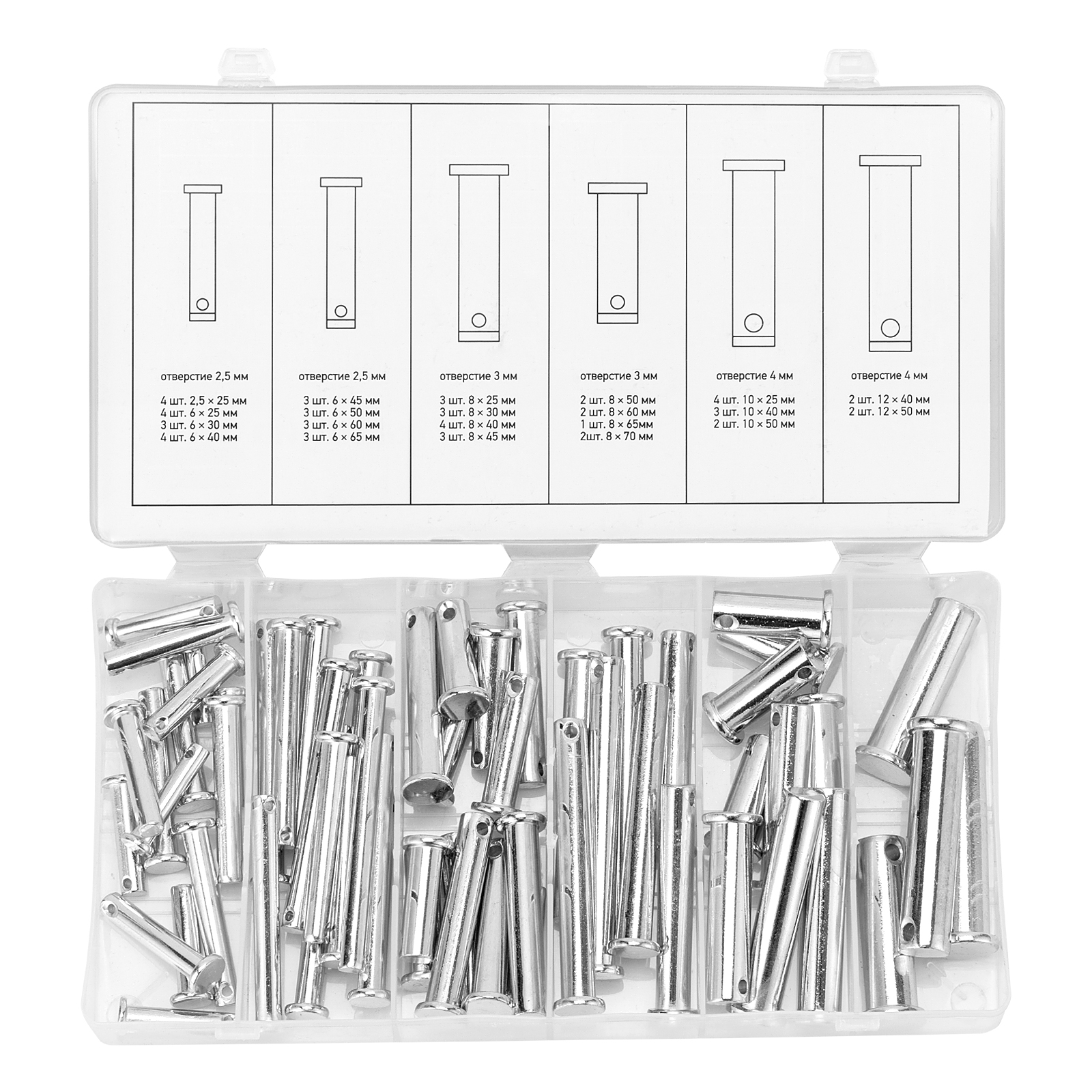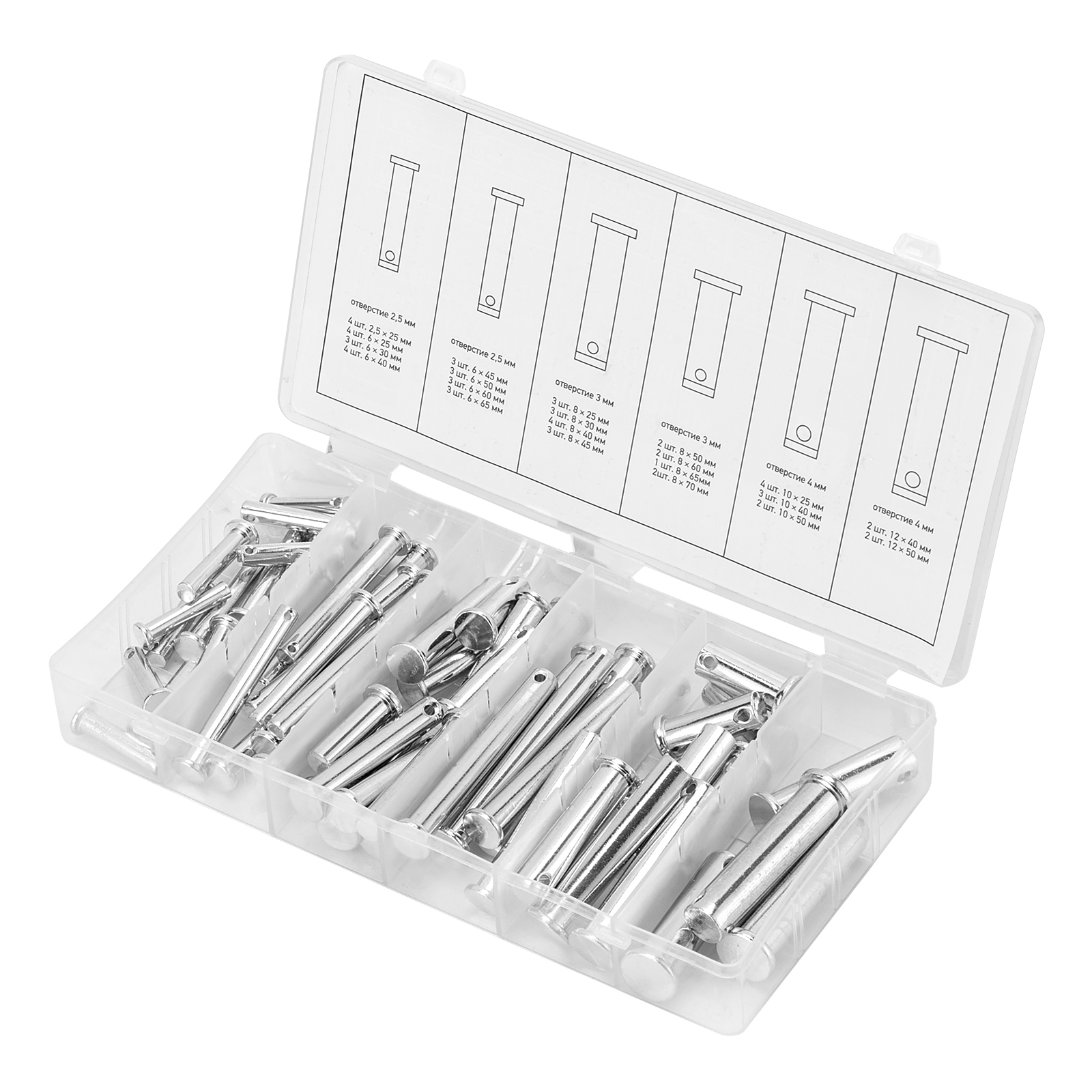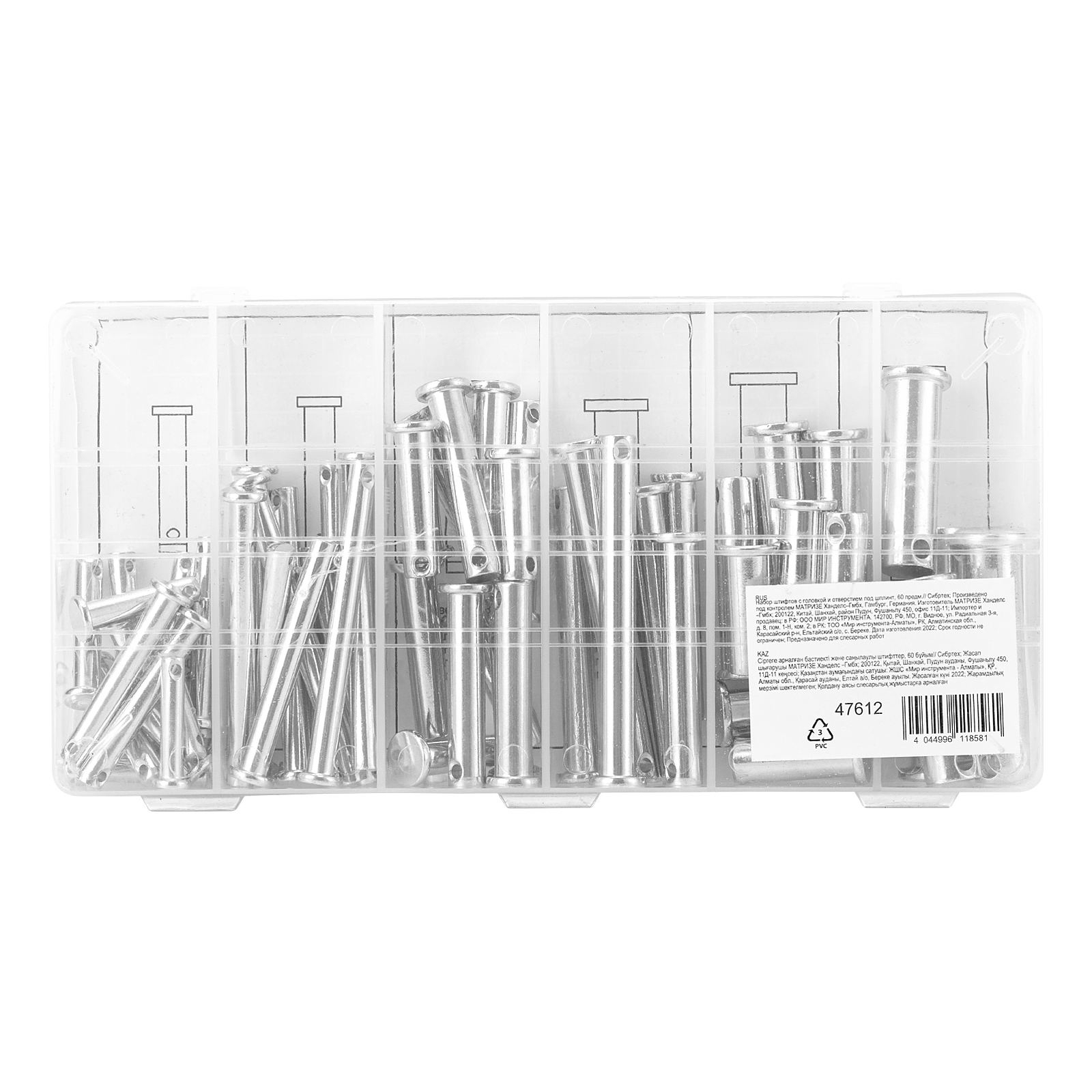Набор Сибртех 47612 включает 60 штифтов с головкой и отверстием под шплинт, предназначенных для неподвижного соединения деталей. В корпусе каждого штифта имеется отверстие, позволяющее использовать шплинт для надежной фиксации крепежа.