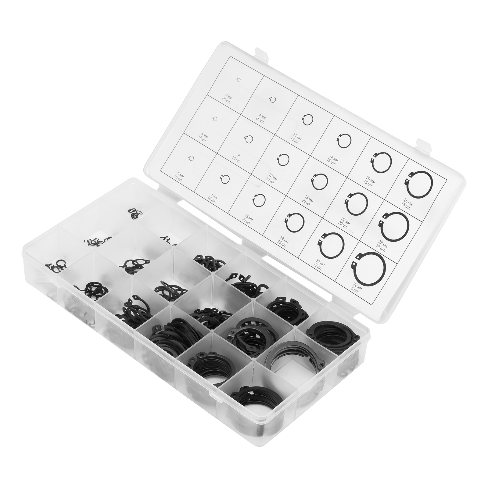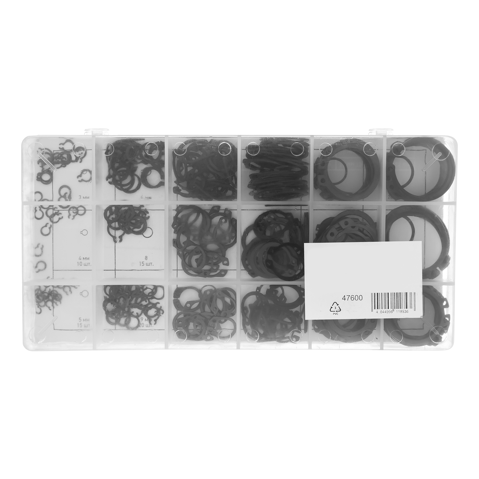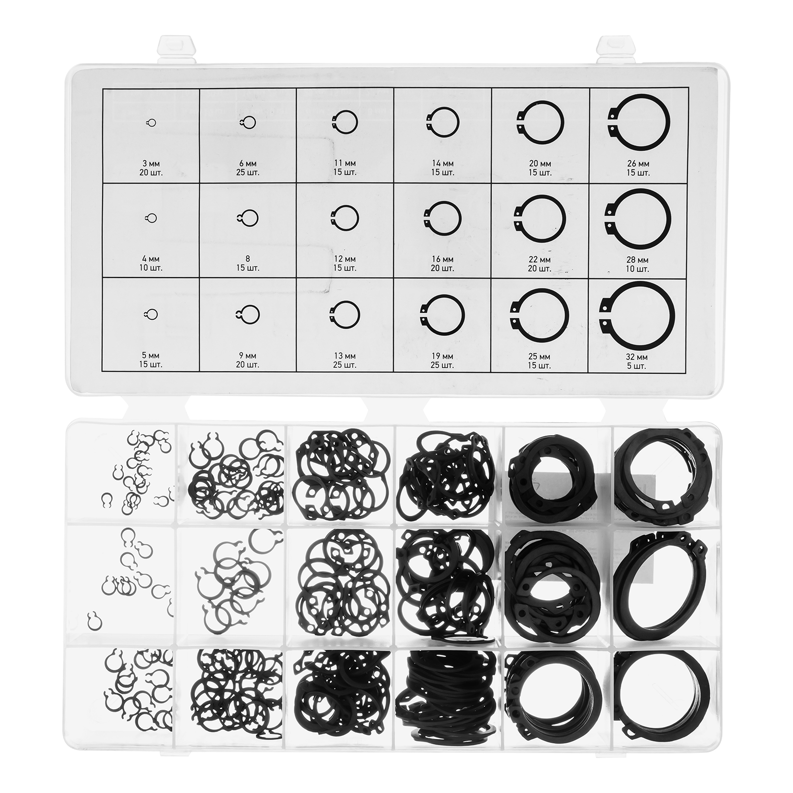 Набор Сибртех 47600, состоящий из 300 стопорных колец диаметром 3-32 мм, используется для закрепления деталей на валах различных механизмов. Кольца предотвращают смещение деталей относительно друг друга. В наборе расходники самых ходовых размеров, поэтому найти нужное будет легко. Изделия пригодятся для ремонта бытовой техники, а также будут полезны в гараже.