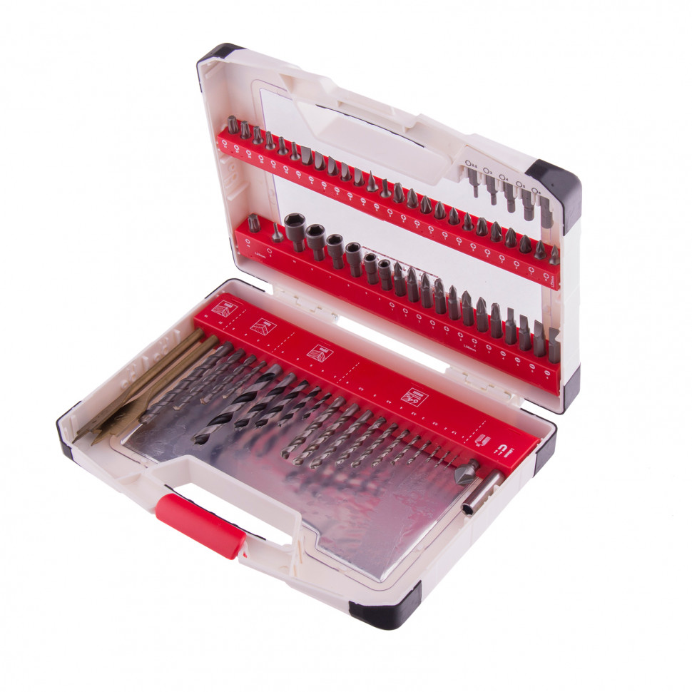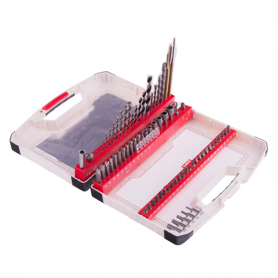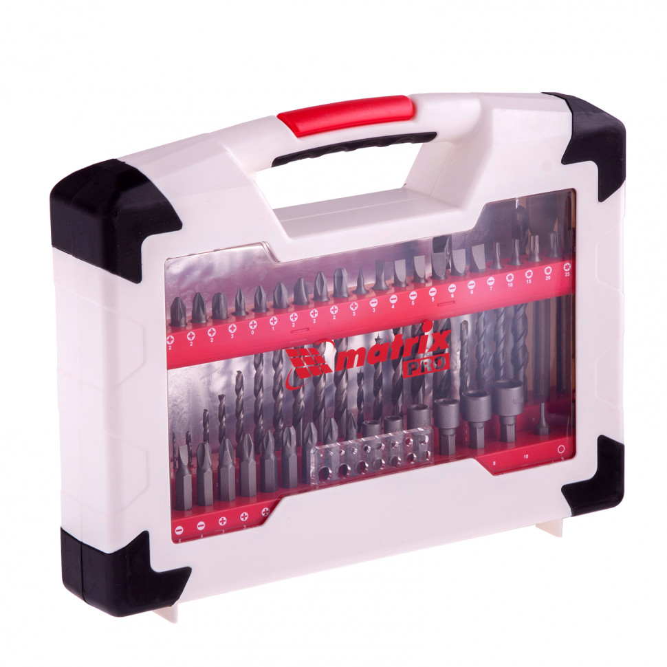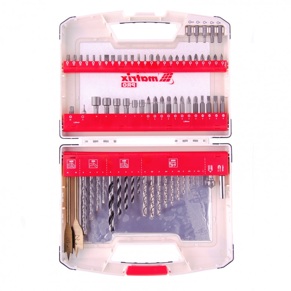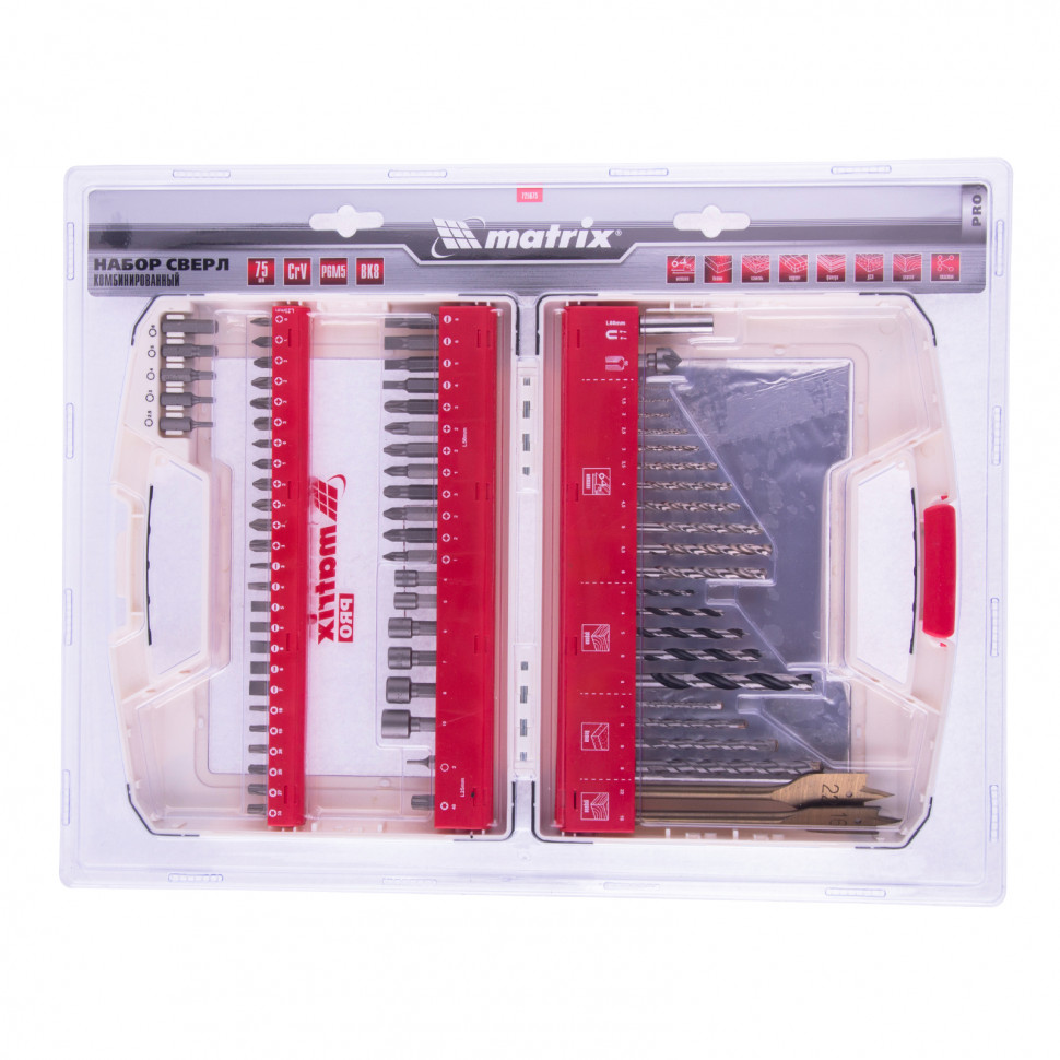 Комбинированный набор Matrix PRO 725675 — универсальное решение для мастеров, т. к. он содержит 75 предметов: калибровочную шкалу, отверточные биты (44 шт.) и адаптер к ним, зенковку, 6 торцевых головок, 2 перовых сверла, сверла по дереву 3-8 мм, сверла по бетону 4-8 мм и сверла по металлу 1-6 мм. Оснастка подходит как для бытового использования, так и решения профессиональных задач.