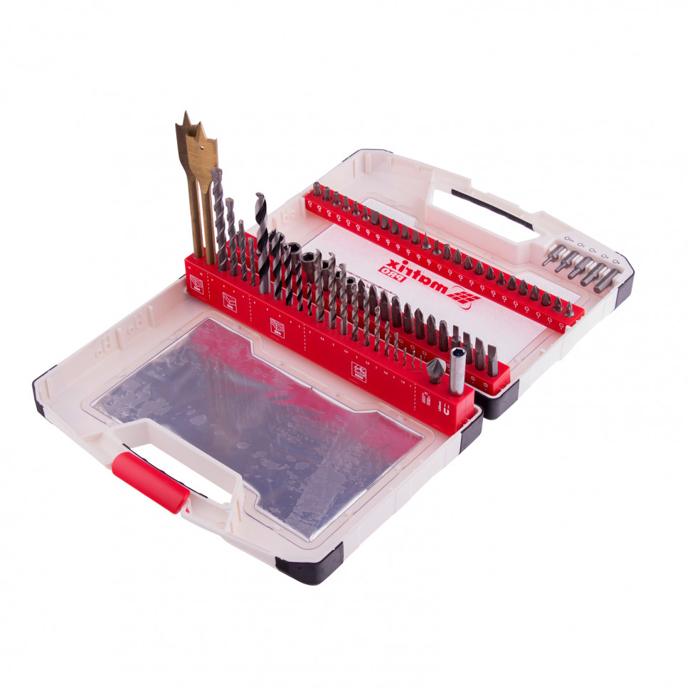 - Прочность и долговечность — биты, торцевые головки и адаптер выполнены из хромованадиевой стали, сверла по металлу из стали Р6М5, а сверла по дереву — из стали 45.