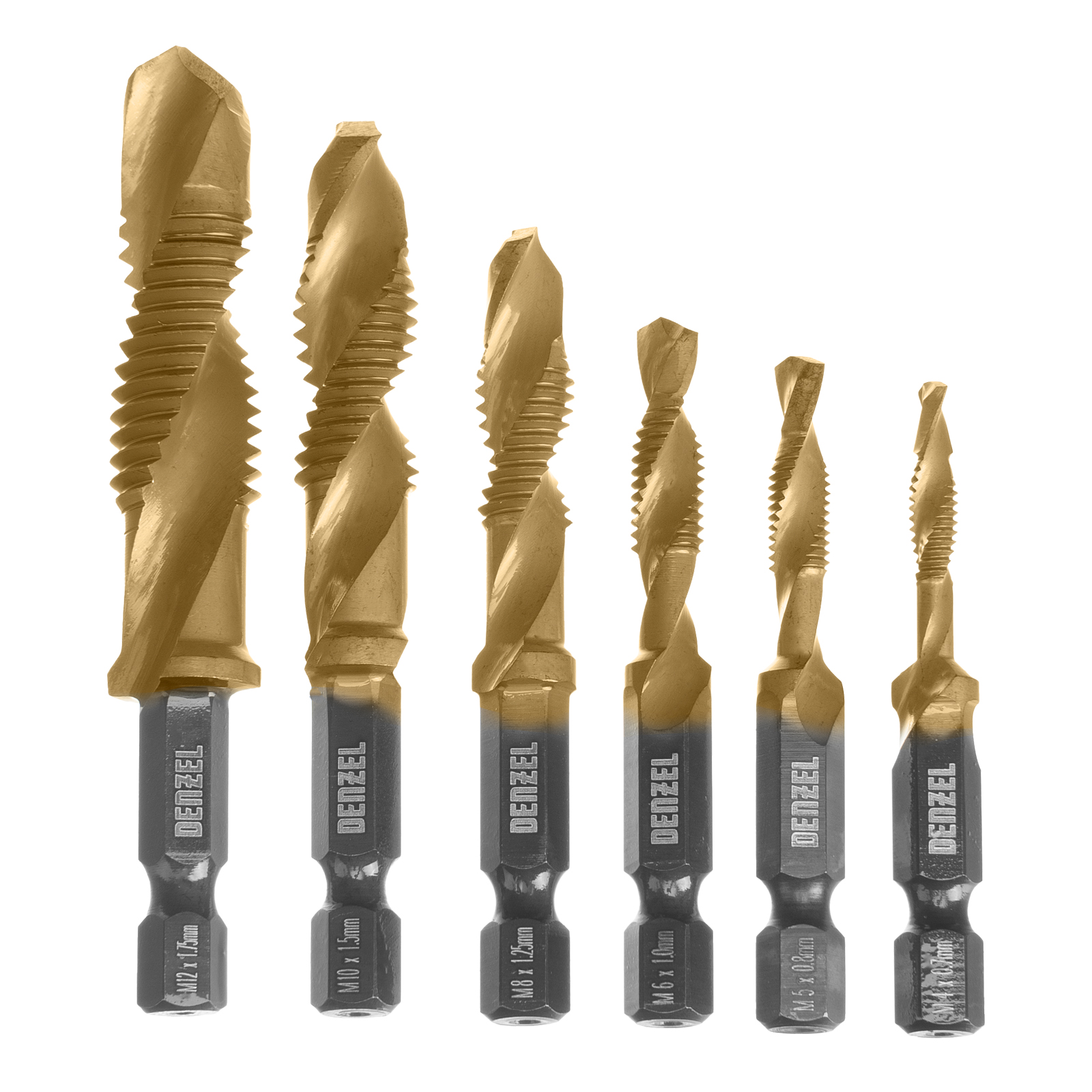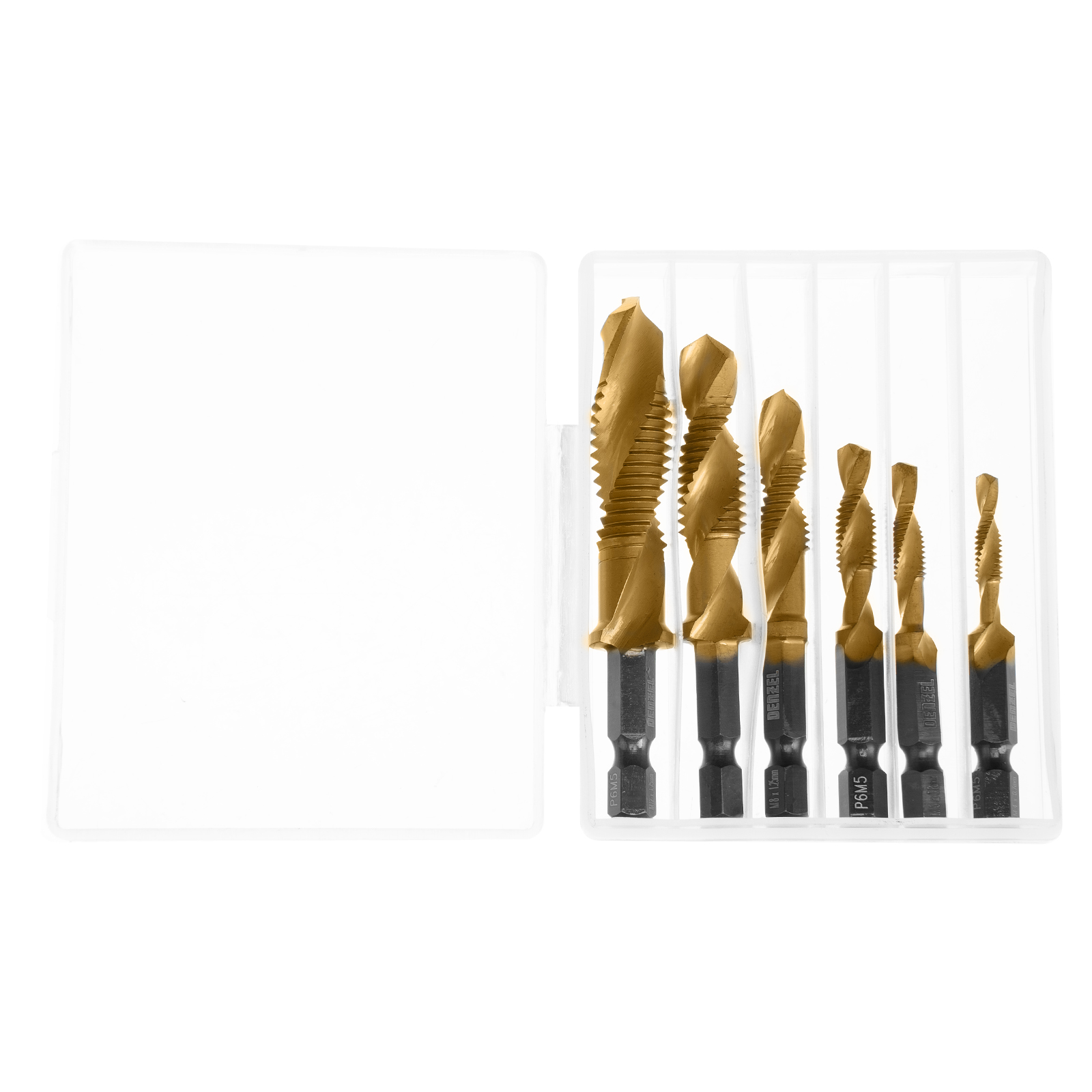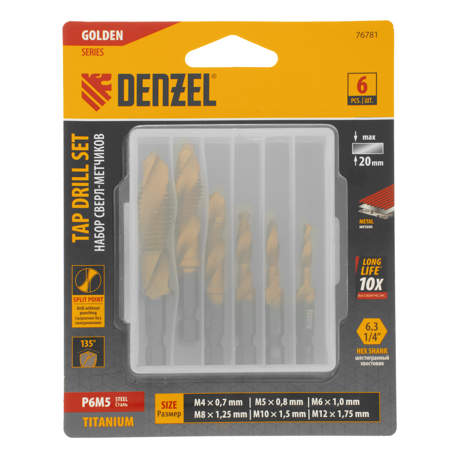 Набор сверл-метчиков Denzel 76781 состоит из 6 предметов, изготовленных из стали P6M5, и позволяет сверлить глухие и сквозные отверстия в чугуне, стали, алюминии, меди, бронзе с одновременным нарезанием правой метрической резьбы размером M4-M12 с шагом 0,7-1,75 мм. Такое решение позволяет существенно сократить время работы. Угол заточки оснастки 135° оптимален для эффективного решения поставленных задач. Сверлам-метчикам присвоен класс точности 4H, что обеспечивает высокое качество получаемой резьбы. Благодаря высококачественному исполнению сверла-метчики прослужат в 10 раз дольше аналогов из углеродистой стали.