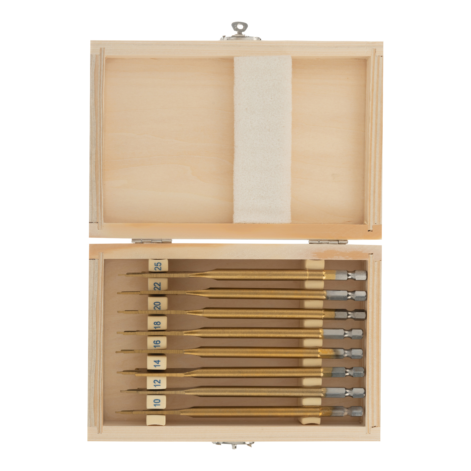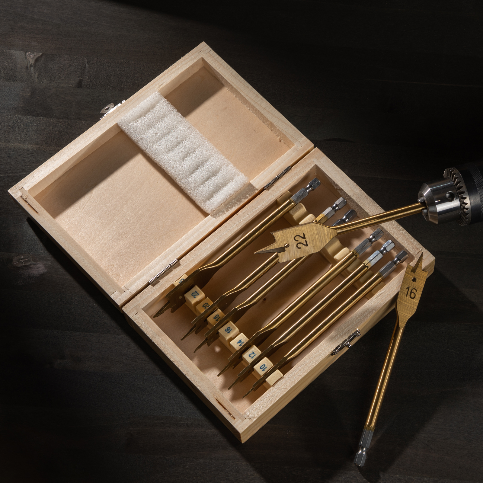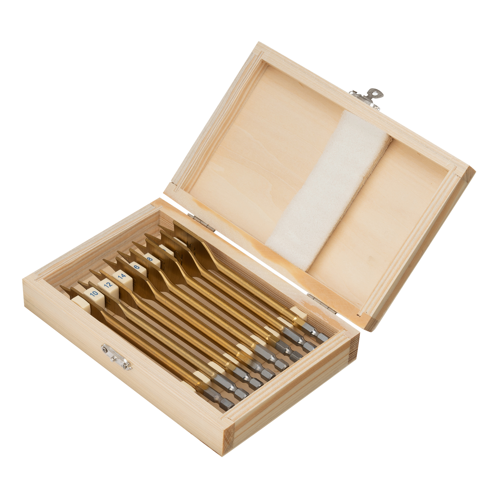 Набор Matrix 70441 состоит из 8 перовых сверл по дереву диаметром 10-12-14-16-18-20-22-25 мм и поставляется в деревянном кейсе. Позволяет получать сквозные и глухие отверстия в древесине. Сверла устанавливаются на электрические и механические дрели или шуруповерты.