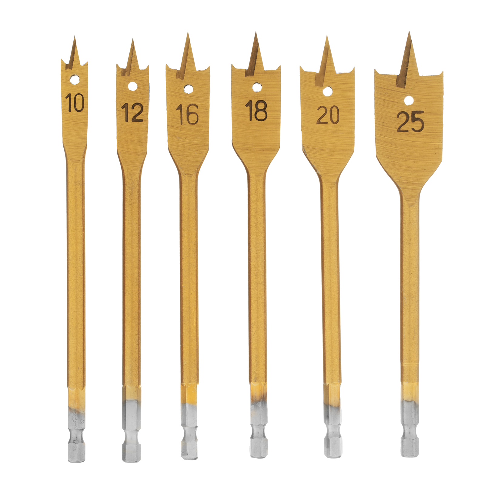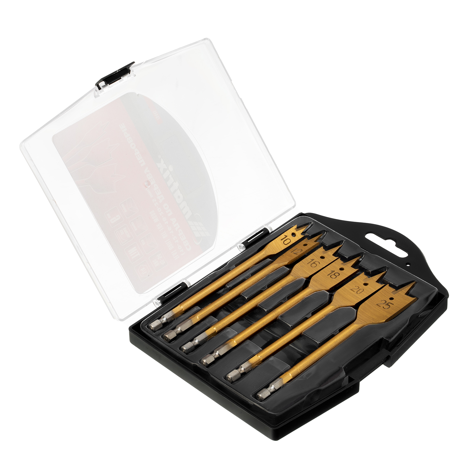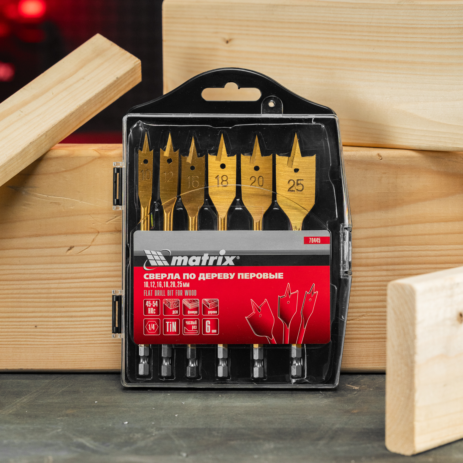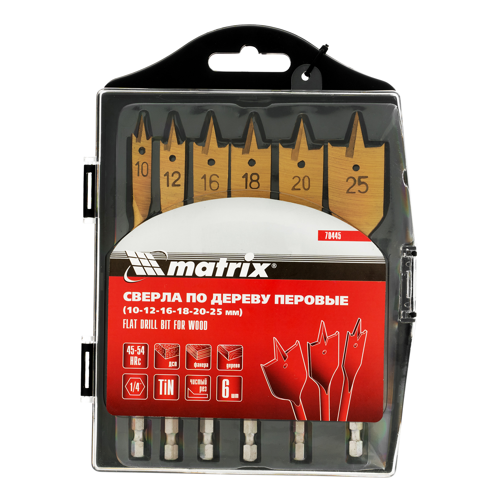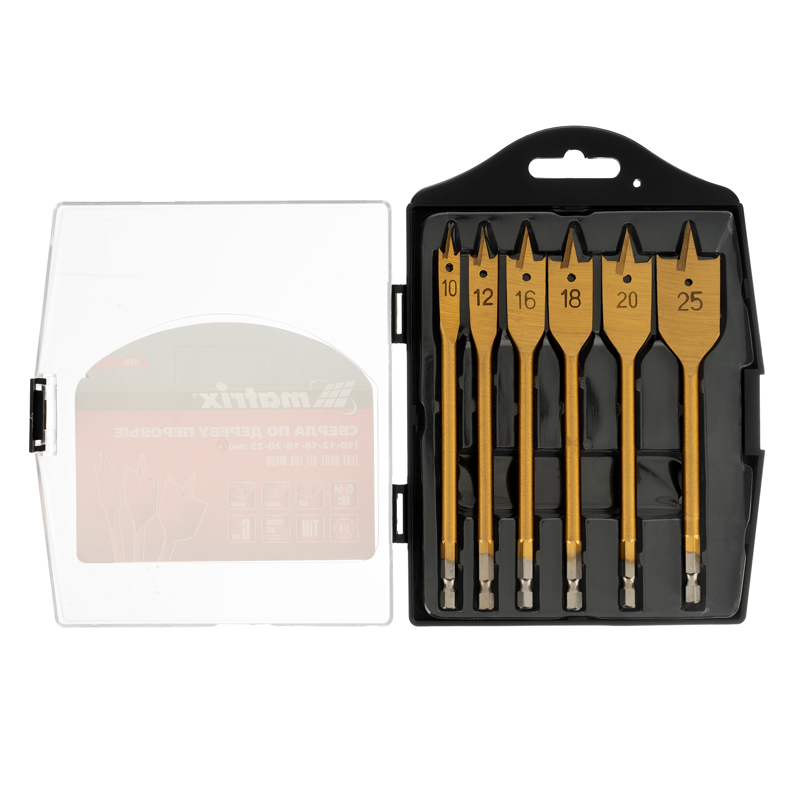 Набор Matrix 70445 состоит из 6 перовых сверл по дереву диаметром 10-12-16-18-20-25 мм и поставляется в пластиковом кейсе. Позволяет получать сквозные и глухие отверстия в древесине. Сверла устанавливаются на электрические и механические дрели или шуруповерты.