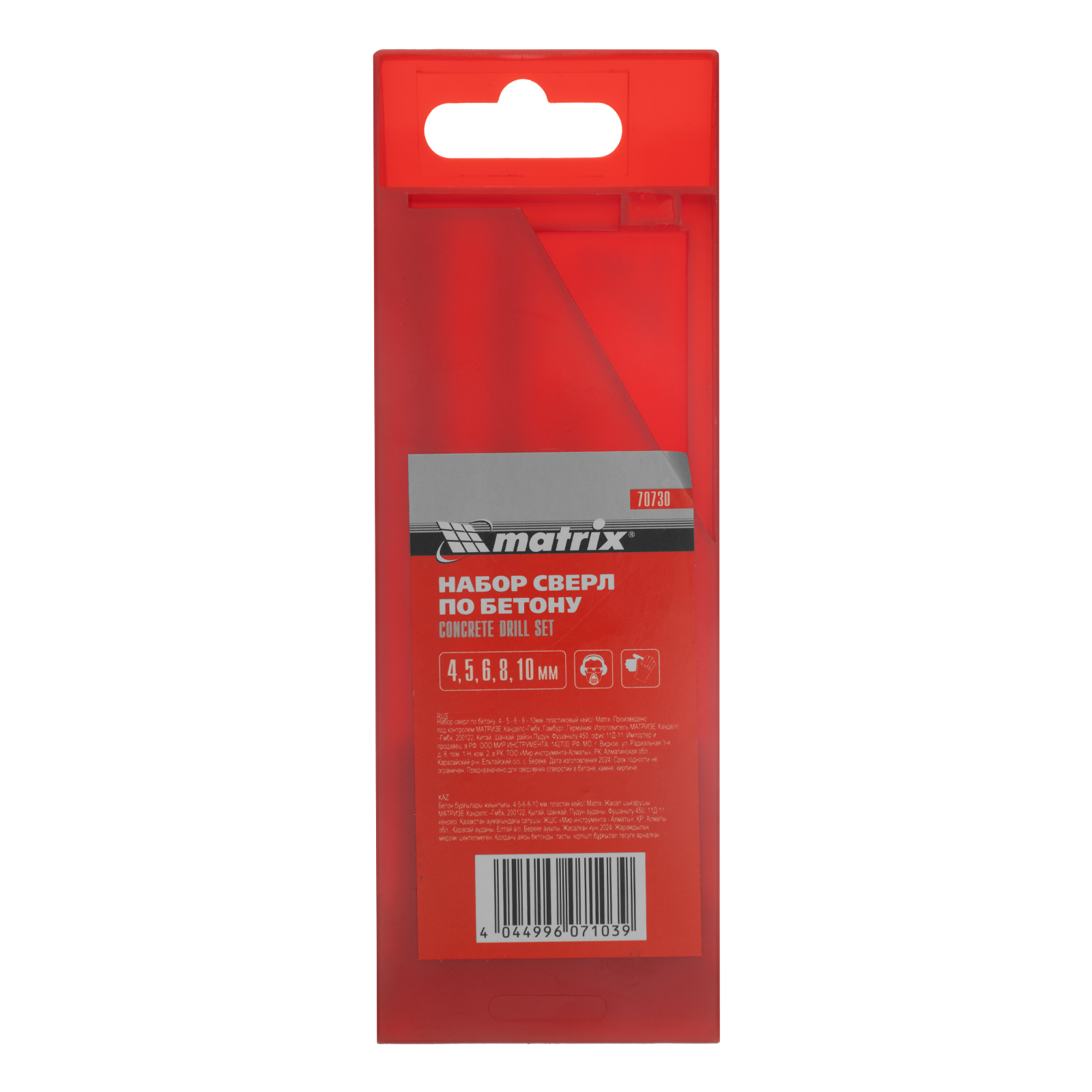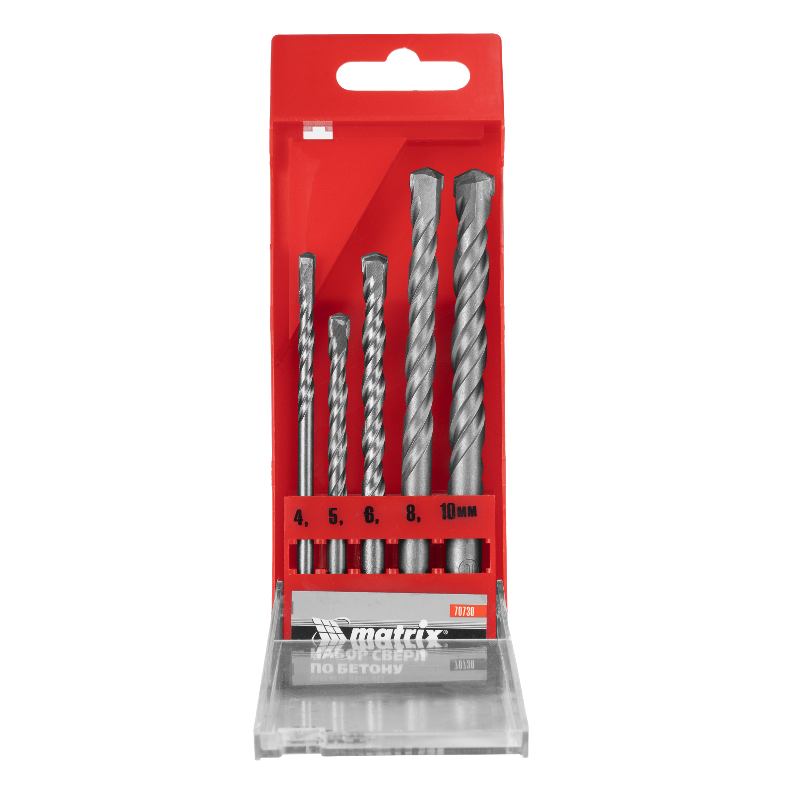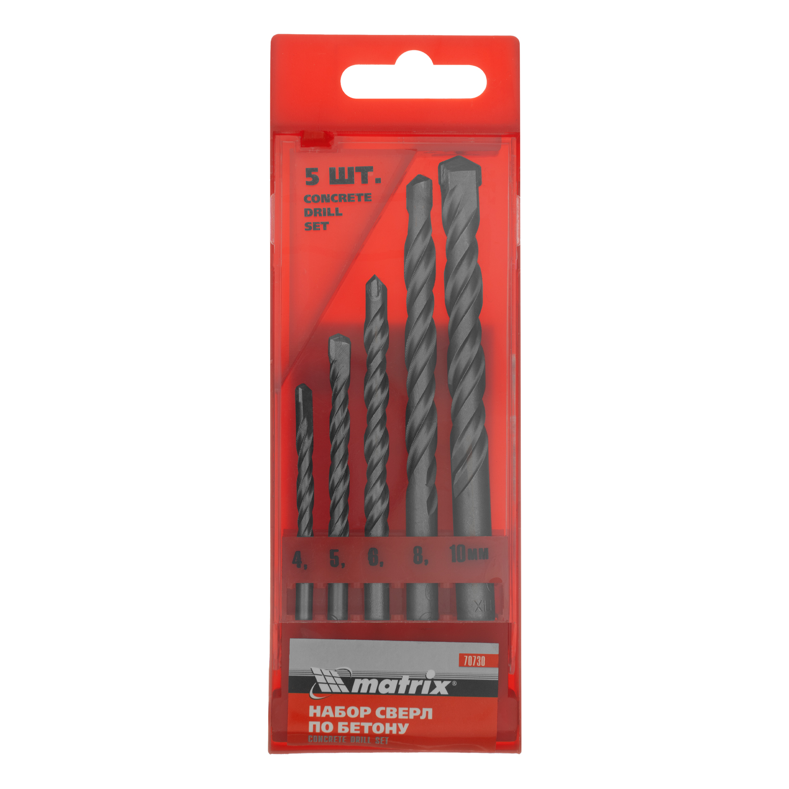 <p>Набор Matrix 70730, упакованный в пластиковый кейс, включает в себя 5 сверл диаметром 4, 5, 6, 8, 10 мм для получения отверстий в твердых материалах: бетоне, керамике, мраморе и т. д. Он рассчитан на интенсивное использование как в быту, так и на строительной площадке.</p><h2>Преимущества</h2><ul><li>Прочность и высокий ресурс — сверла выполнены из стали 40Х твердостью 44-48 HRC, режущим элементом является твердосплавная пластина ВК8.</li><li>Решение широкого спектра задач — в набор входит оснастка наиболее распространенных размеров.</li><li>Высокая скорость работы — канавки сверл с двойной спиралью обеспечивают эффективный отвод продуктов сверления.</li><li>Удобное хранение и транспортировка — набор сверл с цилиндрическими хвостовиками поставляется в пластиковом кейсе с подвесом.</li></ul>