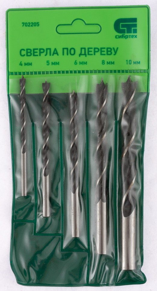 <p>Набор сверл по дереву Сибртех 702205 состоит из 5 режущих инструментов диаметром 4, 5, 6, 8 и 10 мм, с цилиндрическими хвостовиками, предназначенных для получения отверстий в древесине. Центрирующие острия облегчают засверливание и не позволяют сверлам отклоняться от заданной оси. Набор будет полезен в столярной мастерской, пригодится во время сборки мебели, а также дома или на даче.</p><h2>Преимущества</h2><ul><li>Прочность — сверла из инструментальной стали 45 устойчивы к динамическим нагрузкам.</li><li>Высокий ресурс — рабочие части закалены, твердость режущих кромок составляет 40 HRC.</li><li>Эффективность — спиральные канавки обеспечивают своевременное удаление стружки, что предотвращает застревание сверл в отверстиях.</li><li>Универсальность — цилиндрические хвостовики совместимы со стандартным патроном дрели.</li></ul>