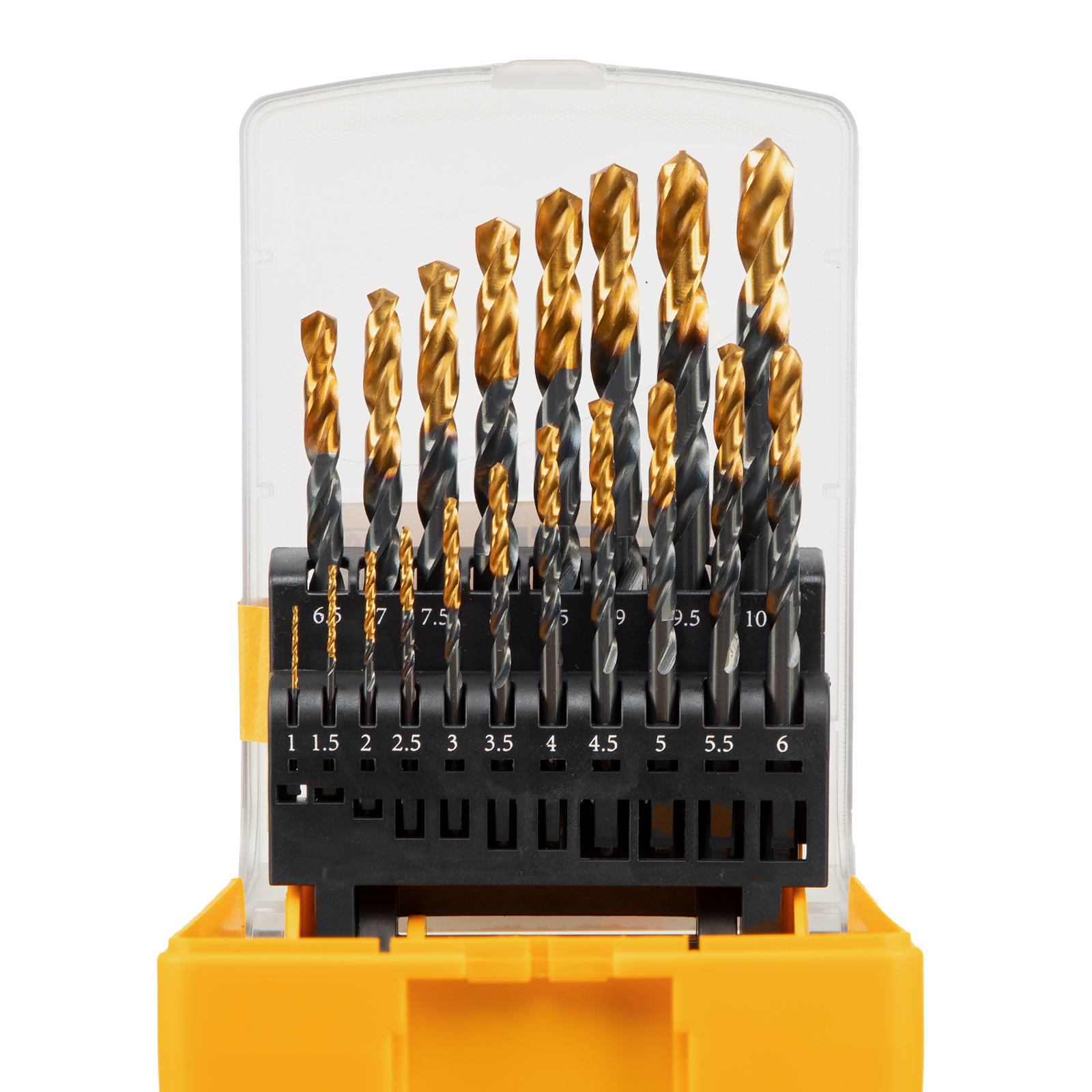 Набор Denzel Golden Tip 72321 включает 19 сверл по металлу из стали HSS-Tin самых распространенных диаметров 1-10 мм. Вышлифованные профили обеспечивают идеальную геометрию сверл (класс точности A1) и позволяют получать качественные отверстия в стальных заготовках. Набор упакован в пластиковый кейс, в крышке которого предусмотрен шаблон для измерения диаметра сверла — такое решение значительно ускоряет работу.