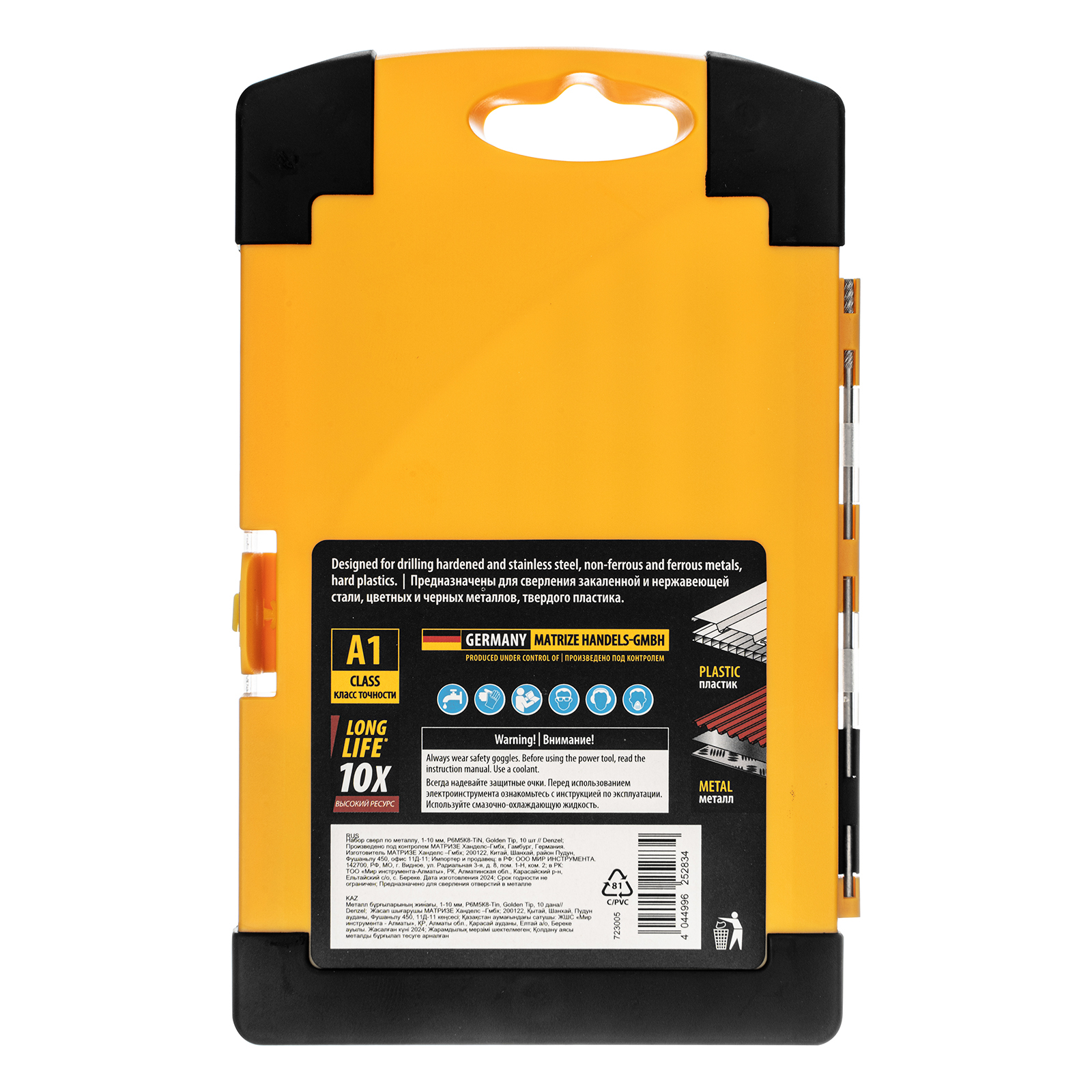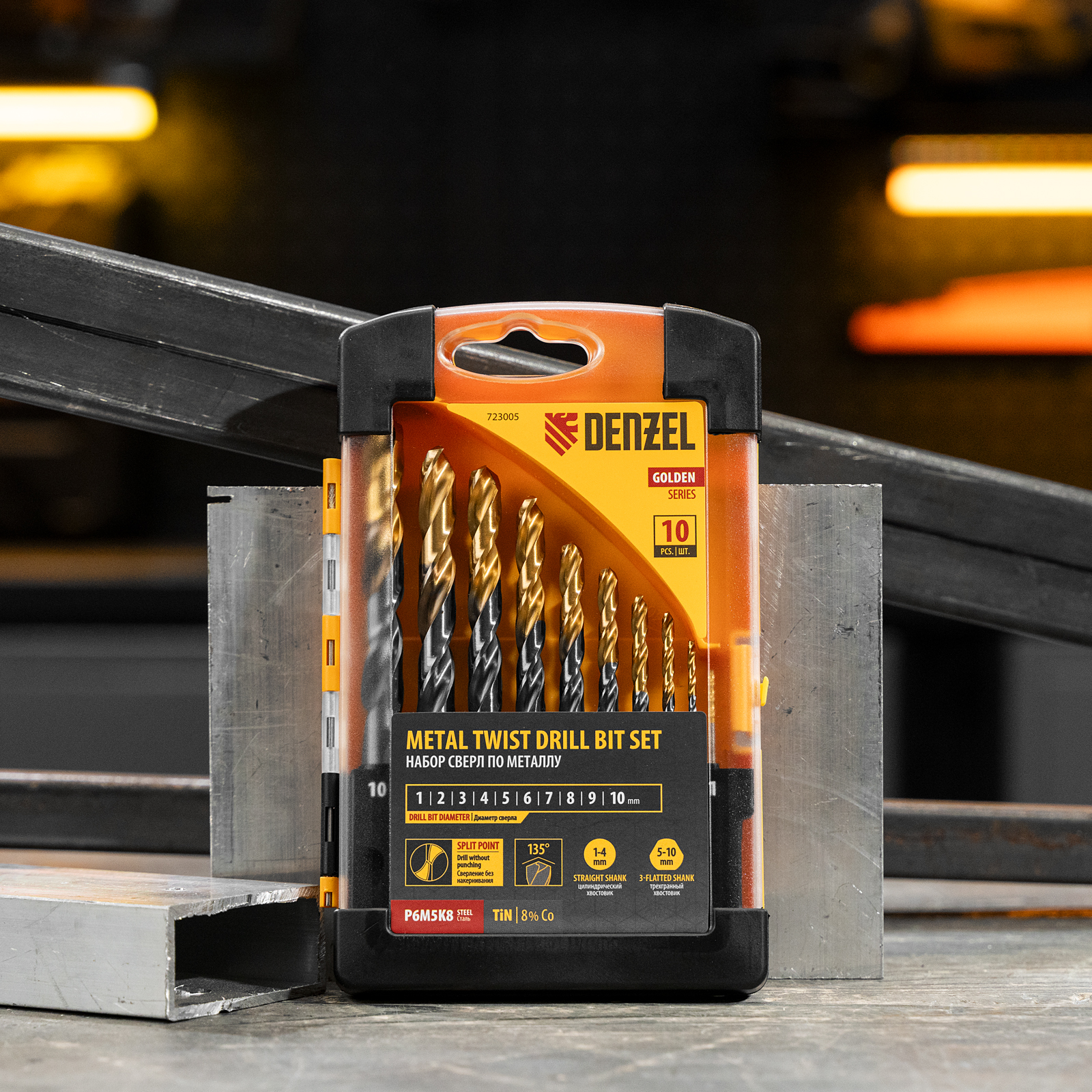 Набор Denzel Golden Tip 723005 состоит из 10 сверл по металлу диаметром 1-10 мм, изготовленных из стали P6M5K8. Угол заточки составляет 135°, что позволяет получать чистые и ровные отверстия в закаленной и нержавеющей стали, цветных и черных металлах, а также жестком пластике. Сверлам присвоен класс точности A1, что гарантирует высокое качество выполняемых работ. Оснастка характеризуется пониженным коэффициентом трения, что облегчает сверление и улучшает отвод стружки. Набор будет полезен дома и в мастерской.