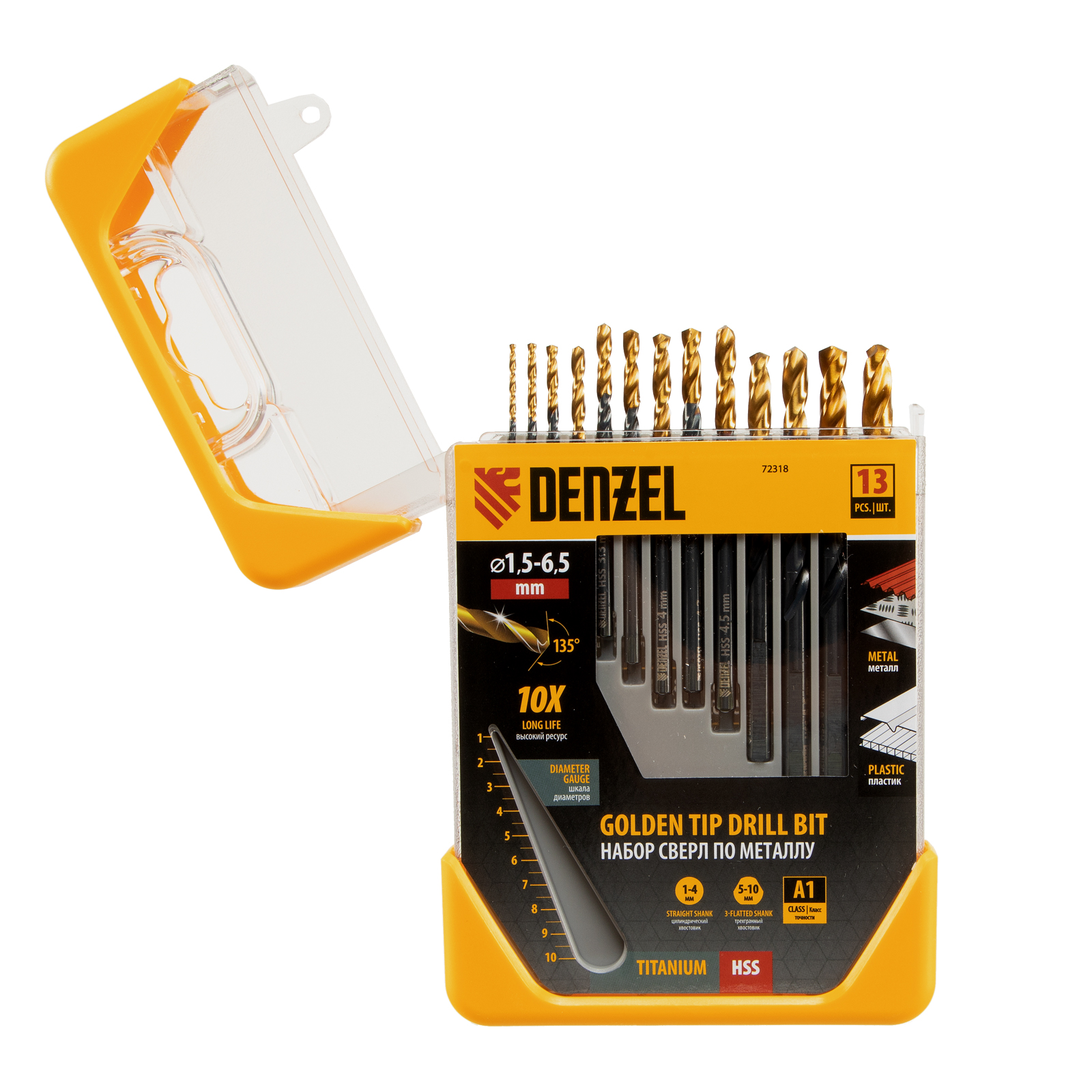 Набор Denzel Golden Tip 72318 включает 13 сверл по металлу для получения отверстий диаметром 1,5-6,5 в стальных заготовках. Оснастка вышлифована на высокоточном оборудовании и имеет класс точности A1, что позволяет эффективно решать поставленные задачи. Сверла упакованы в пластиковый кейс, с помощью которого можно измерить их диаметр: в крышке предусмотрен специальный шаблон.