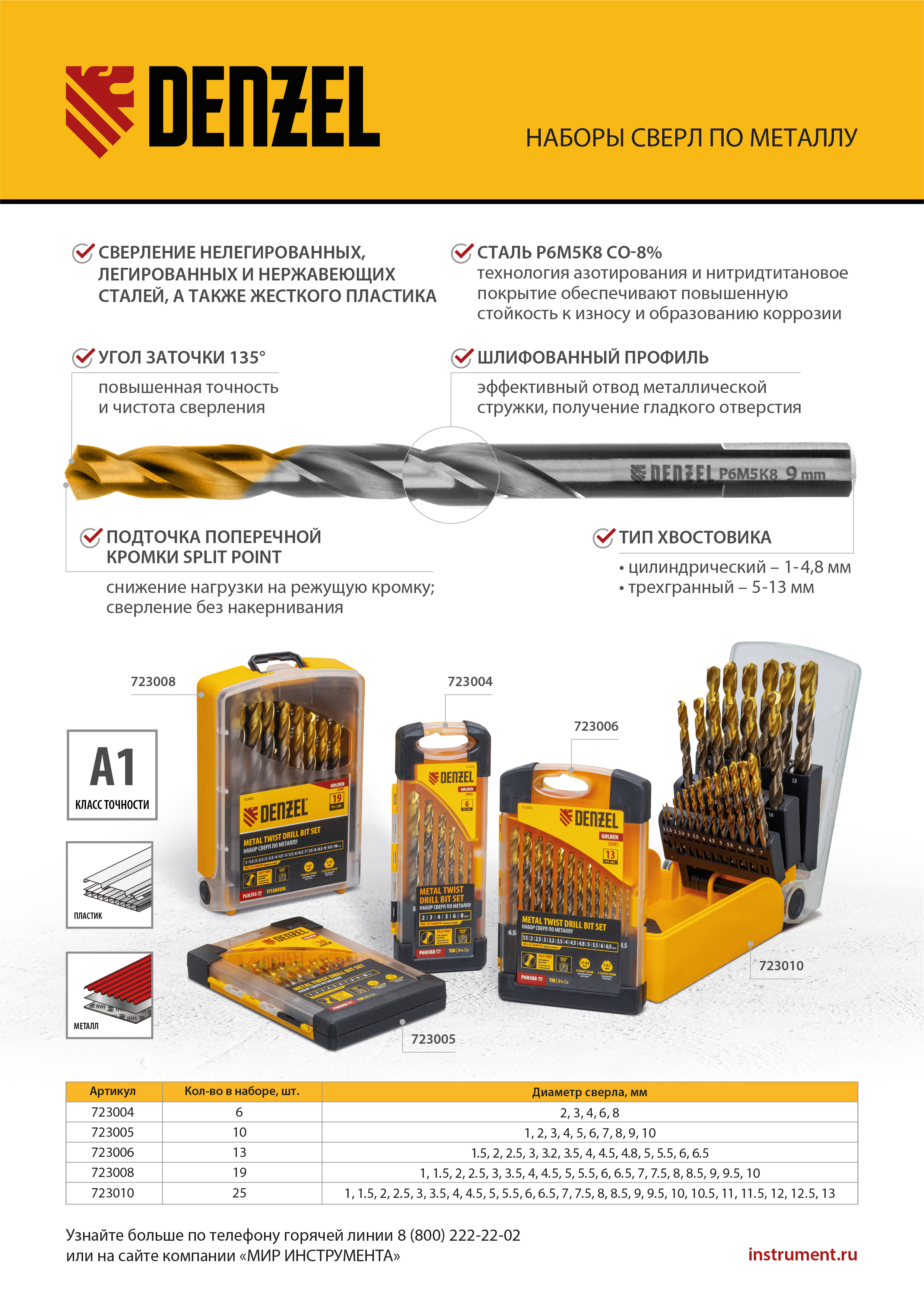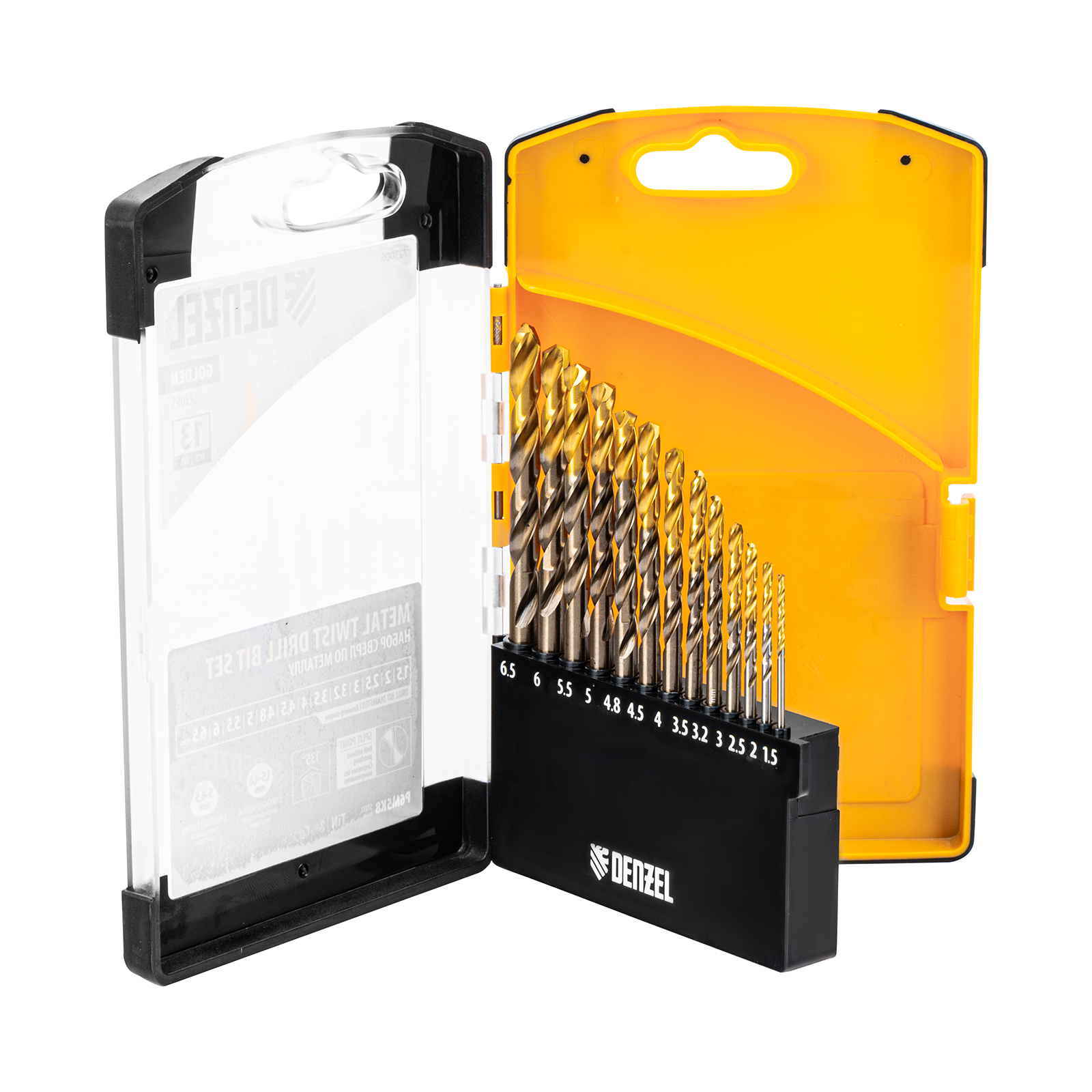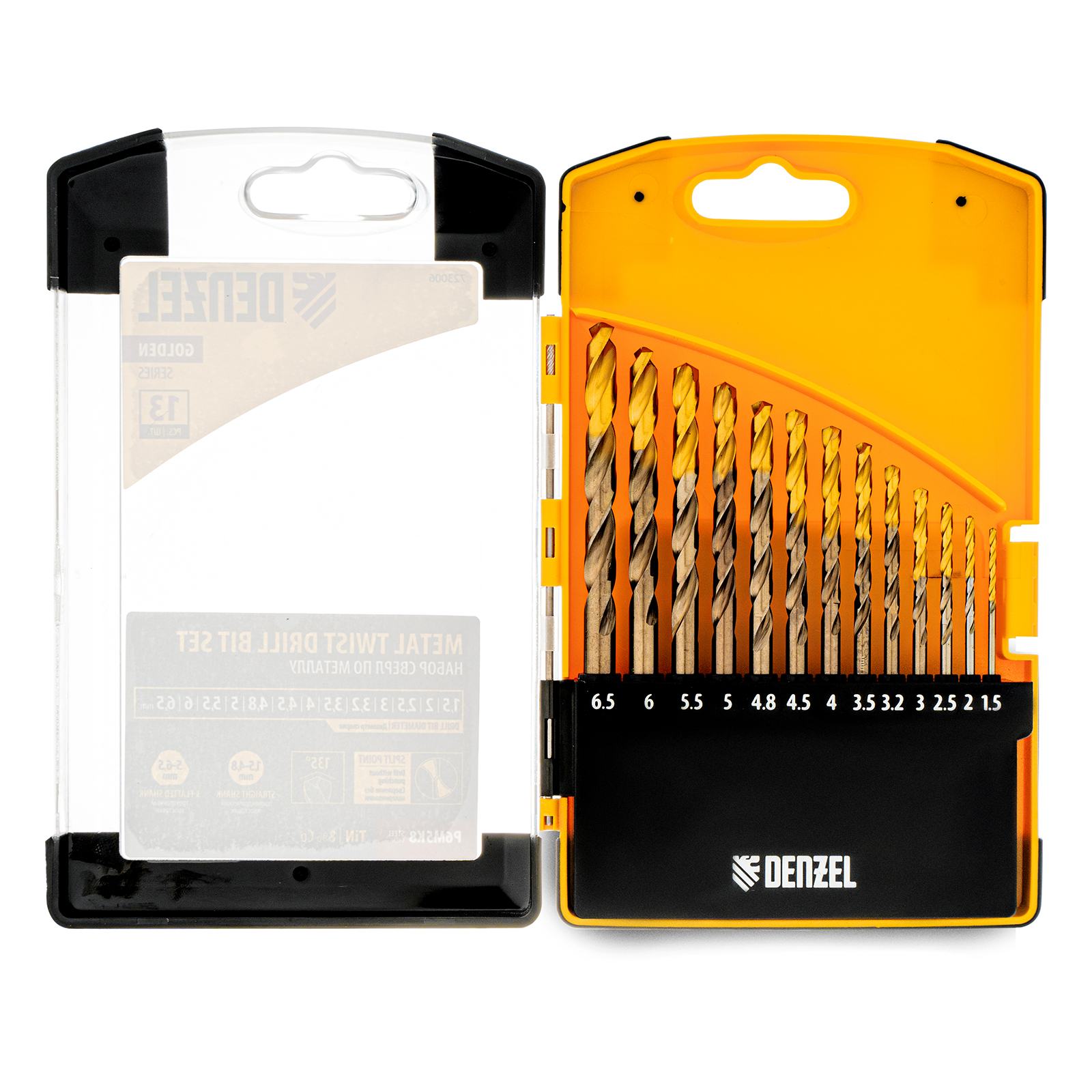 Набор Denzel Golden Tip 723006 состоит из 13 сверл по металлу диаметром 1,5-6,5 мм, изготовленных из стали P6M5K8. Угол заточки составляет 135°, что позволяет получать чистые и ровные отверстия в закаленной и нержавеющей стали, цветных и черных металлах, а также жестком пластике. Сверлам присвоен класс точности A1, что гарантирует высокое качество выполняемых работ. Оснастка характеризуется пониженным коэффициентом трения, что облегчает сверление и улучшает отвод стружки. Набор будет полезен дома и в мастерской.