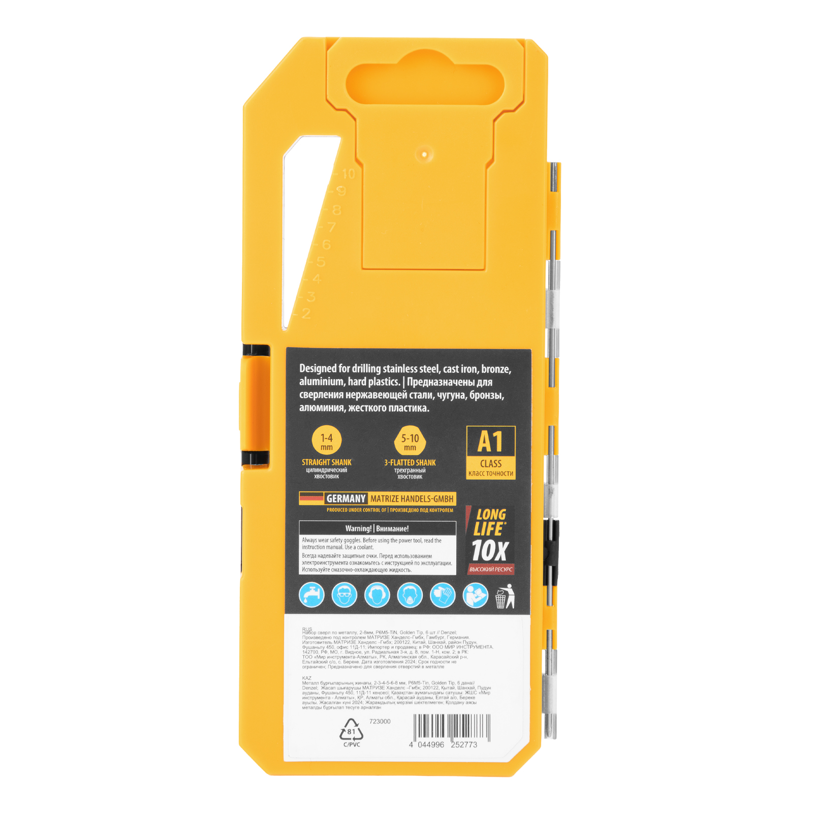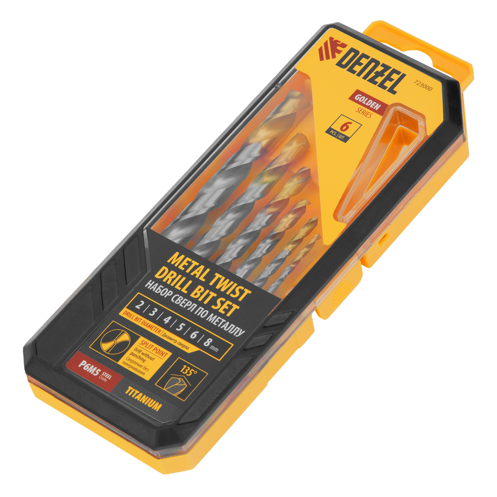 Набор Denzel Golden Tip 723000 состоит из 6 сверл по металлу диаметром 2-8 мм, изготовленных из стали P6M5. Угол заточки составляет 135°, что позволяет получать чистые и ровные отверстия в нержавеющей стали, чугуне, бронзе, алюминии, а также жестком пластике. Сверлам присвоен класс точности A1, что гарантирует высокое качество выполняемых работ. Оснастка характеризуется пониженным коэффициентом трения, что облегчает сверление и улучшает отвод стружки. Набор будет полезен дома и в мастерской.