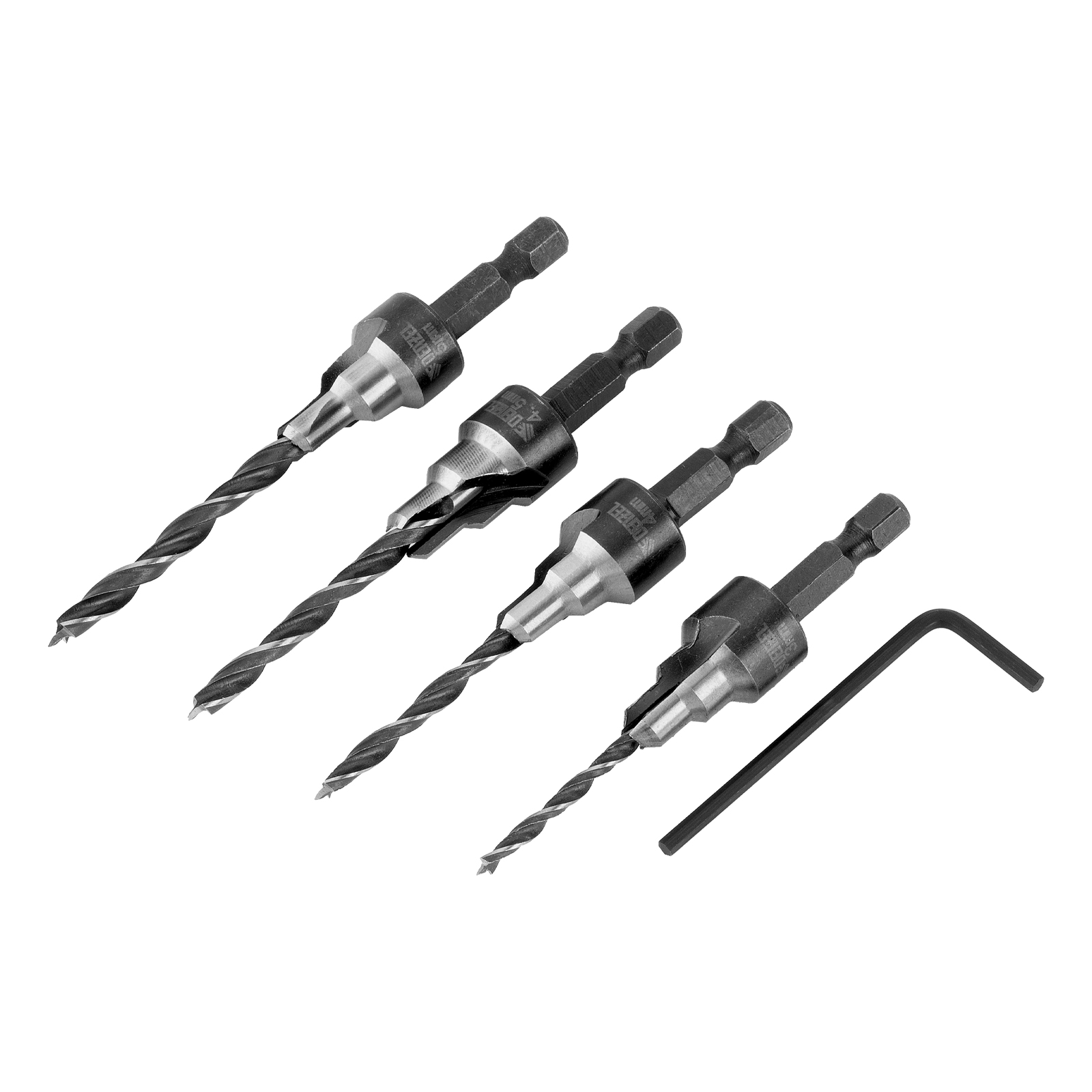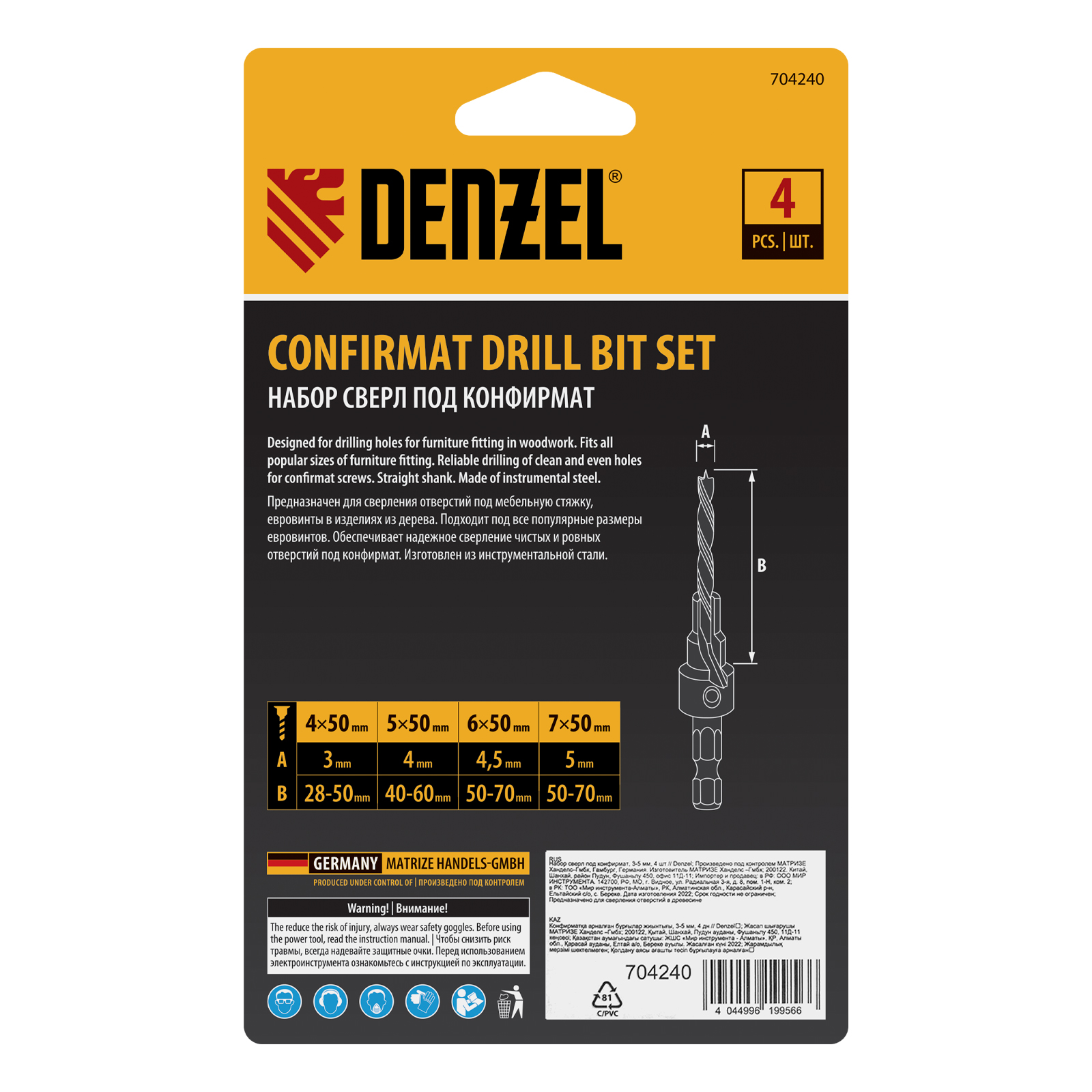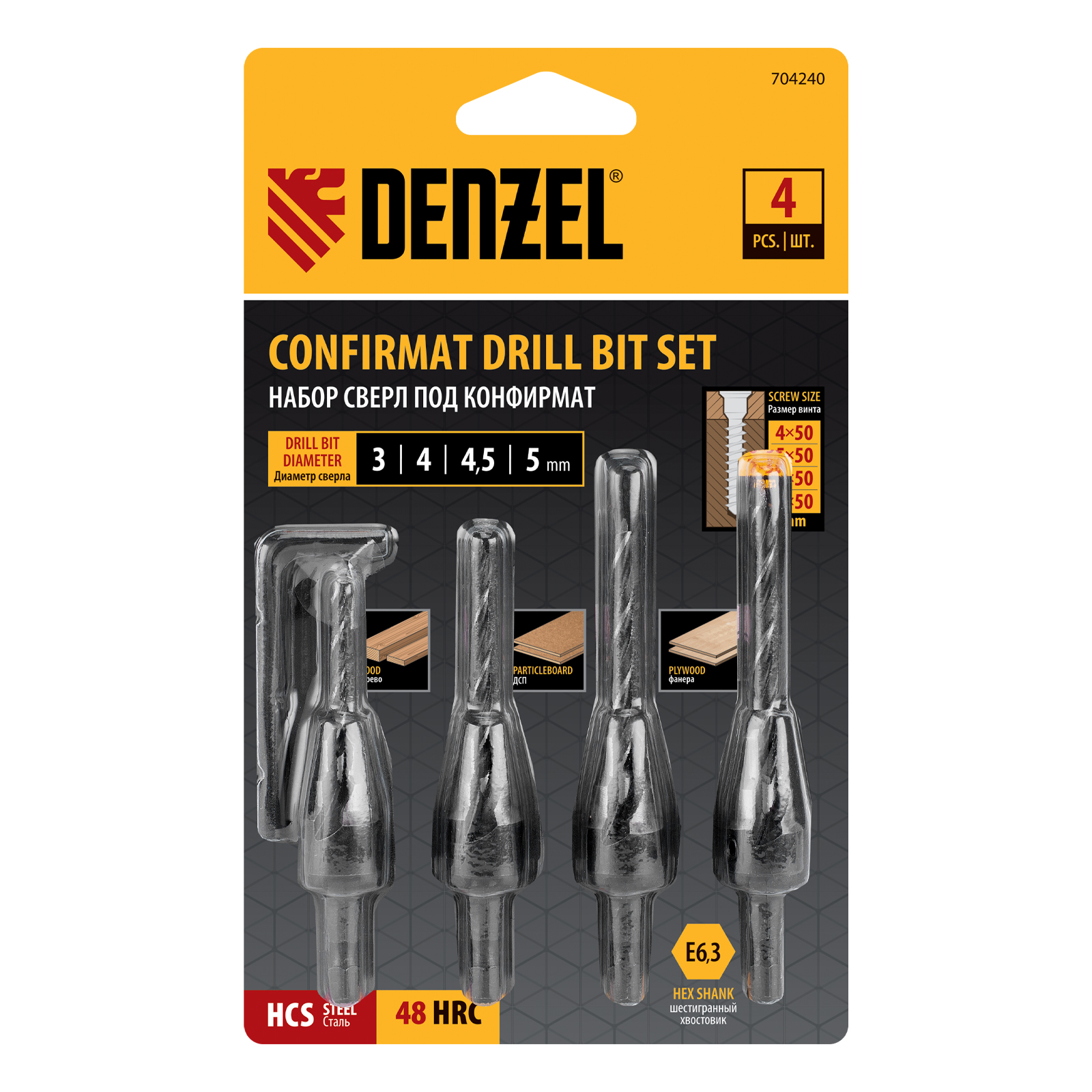 Набор сверл под конфирмат Denzel 704240 включает 4 оснастки диаметром 3-5 мм, предназначенные для получения отверстий под евровинты в древесине, фанере и ДСП. Сверла устанавливаются в патрон электрической дрели или сверлильного станка и подходят для конфирматов размером 4 х 50, 5 х 50, 6 х 50 и 7 х 50 мм. Набор используется в мебельном производстве.