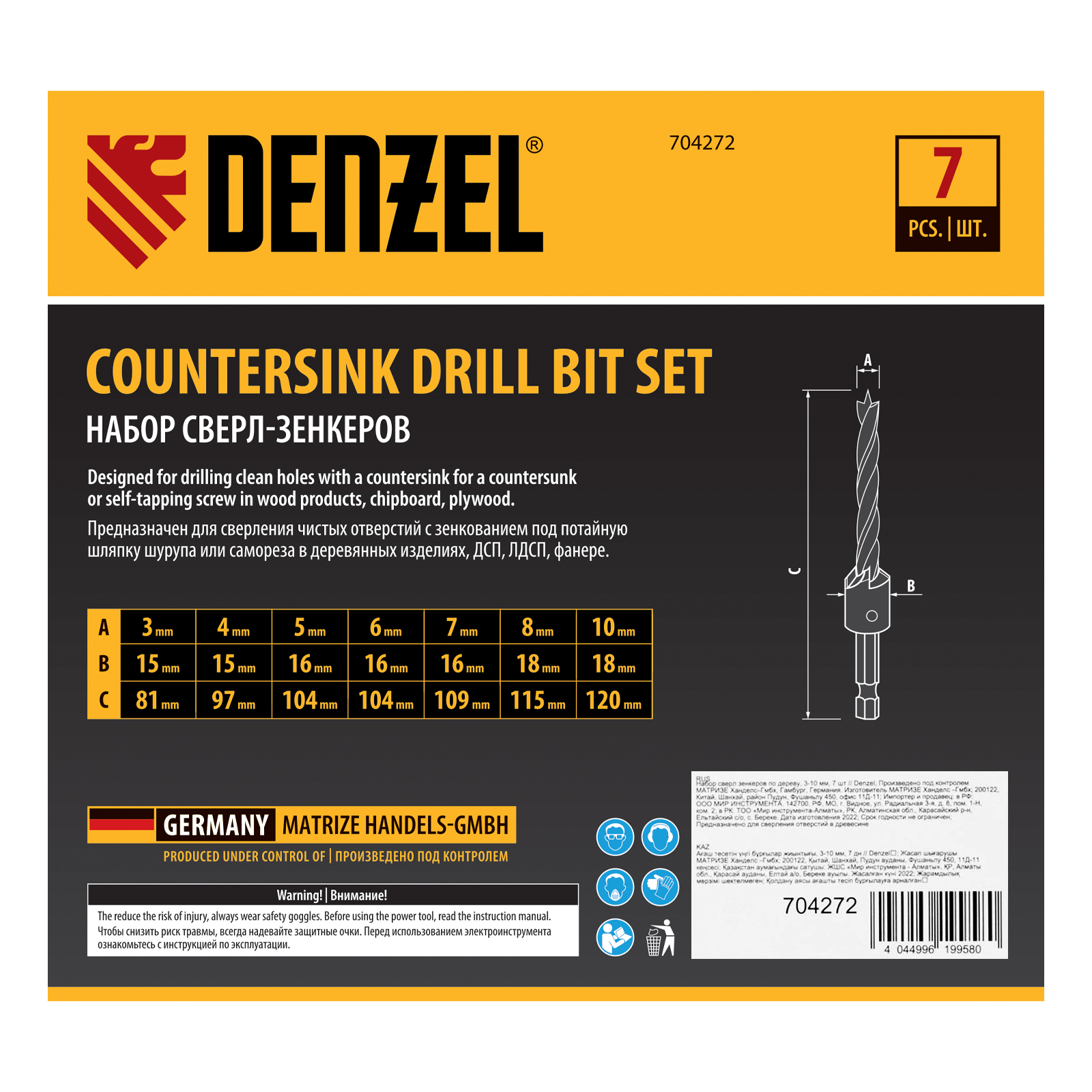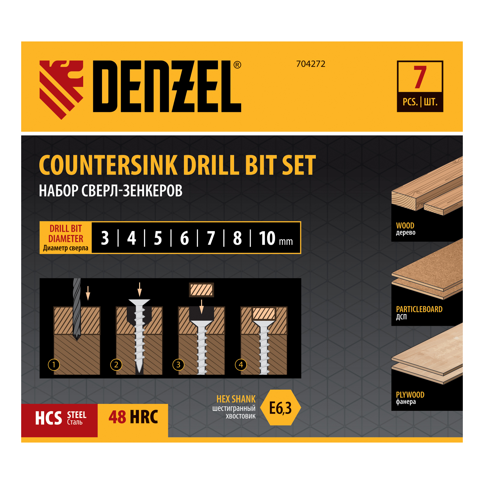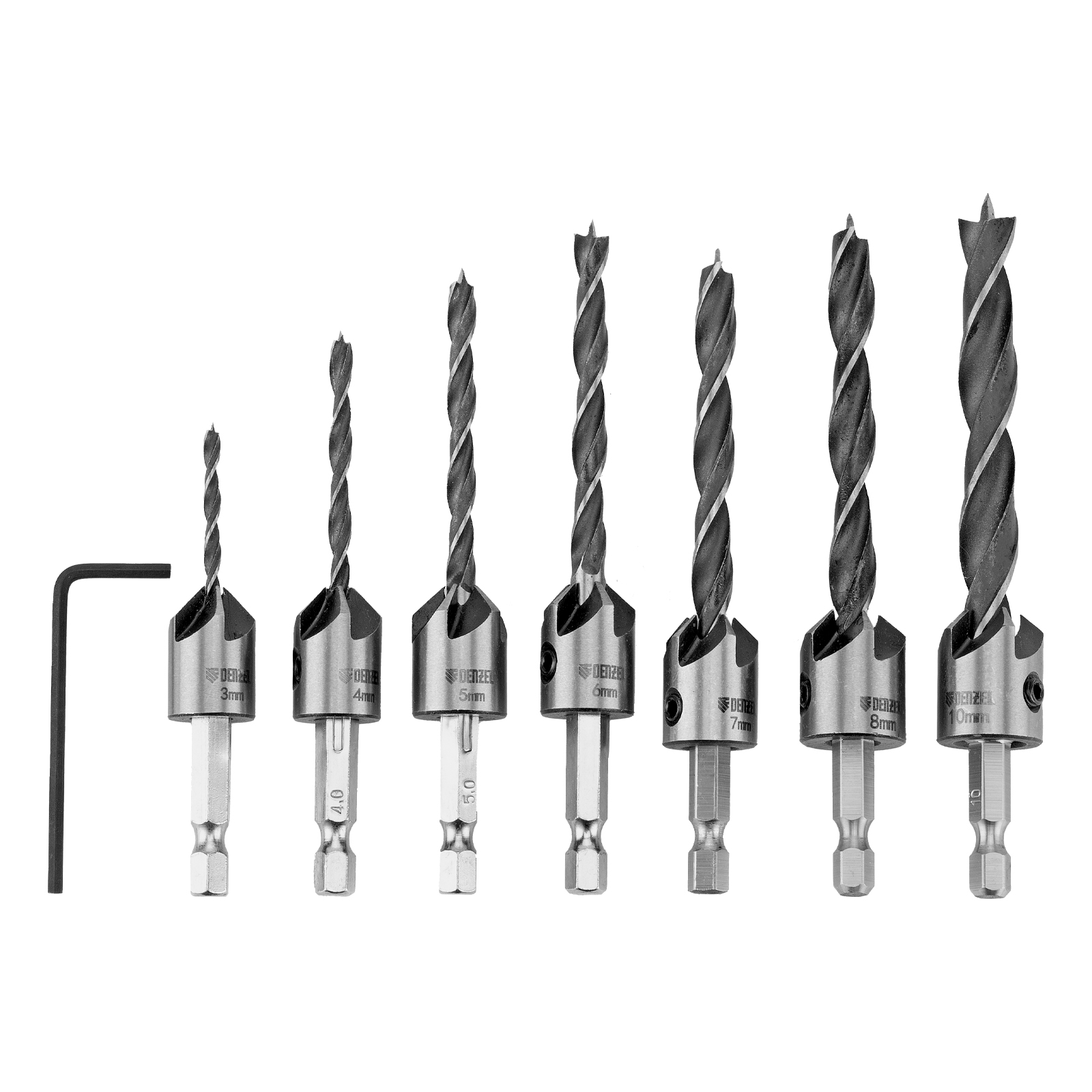 Набор сверл-зенкеров по дереву Denzel 704272 включает 7 оснасток диаметром 3-10 мм и используется для получения отверстий с гнездом под потайную шляпку самореза. Сверла подходят для работы по древесине, фанере, ДСП и используются для сборки мебели, а также строительных и монтажных работ.