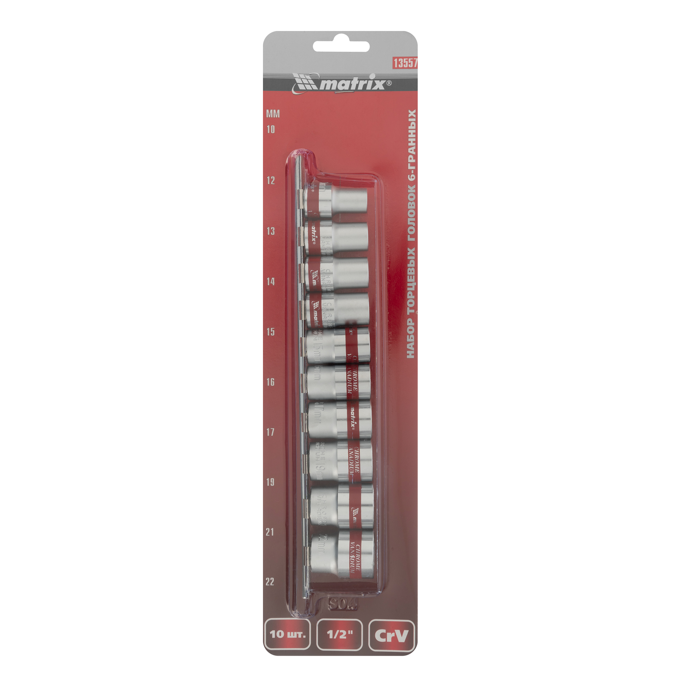 Набор торцевых головок Matrix 13557 из стали CrV, с посадочным гнездом 1/2" и шестигранным профилем, включает 10 насадок диаметром 10-22 мм, предназначенных для работы с резьбовыми соединениями. Пригодится для проведения бытового ремонта, будет полезен сантехнику, слесарю, авторемонтнику.