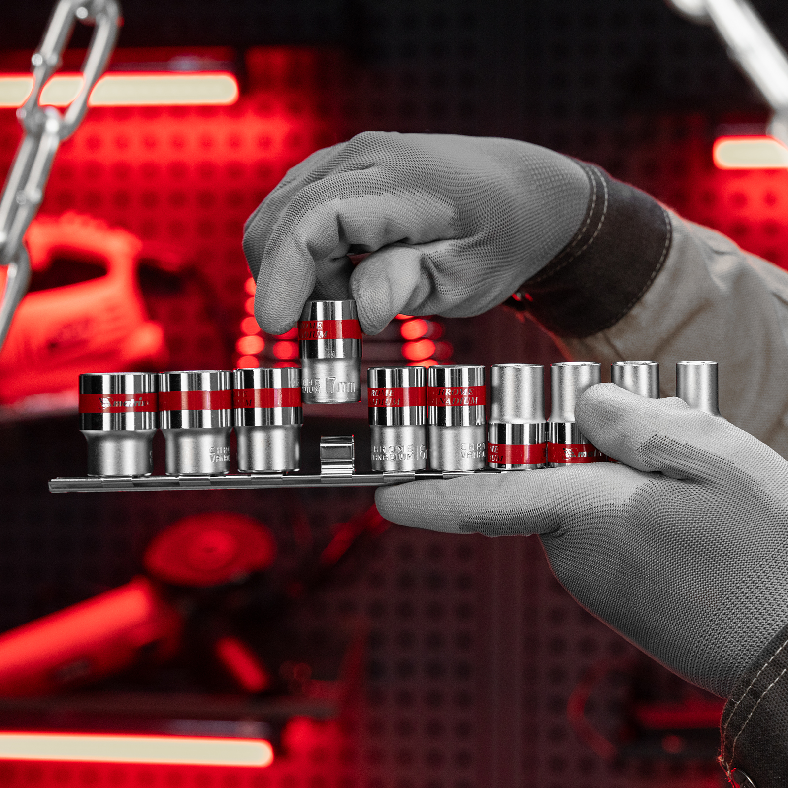 - Быстрый поиск нужной насадки — каждая торцевая головка маркирована ярко-красной полоской и имеет обозначение типоразмера.
