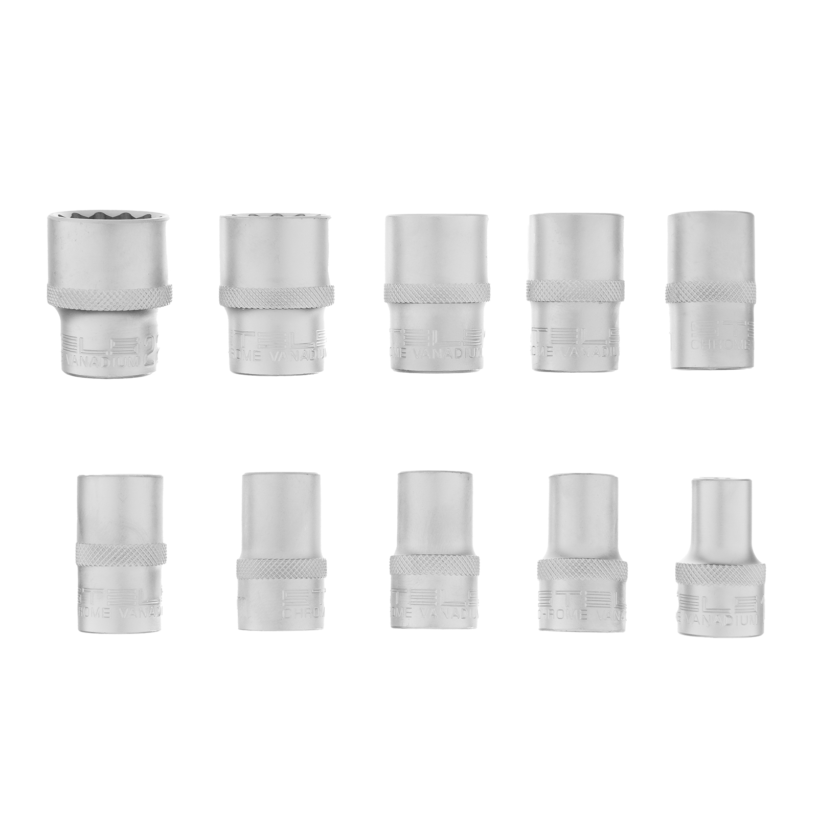 Набор 12-гранных торцевых головок Stels 13638 с посадочным размером 1/2 дюйма, из стали CrV, состоит из 10 насадок 10-22 мм для трещоток и гайковертов. С их помощью монтируют и демонтируют резьбовые соединения во время ремонта или обслуживания авто. 12-гранные торцевые головки с углом поворота 30 градусов удобны для работы в ограниченном пространстве.