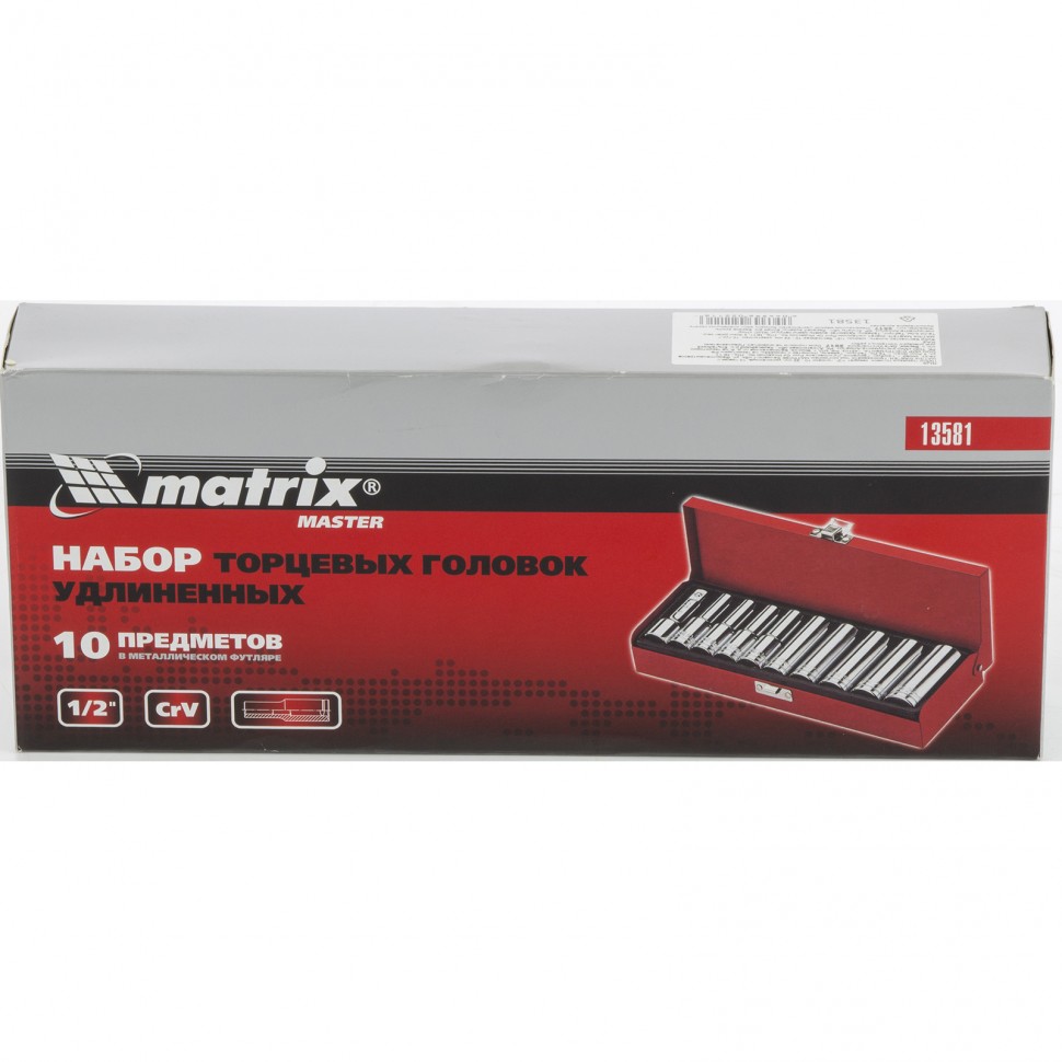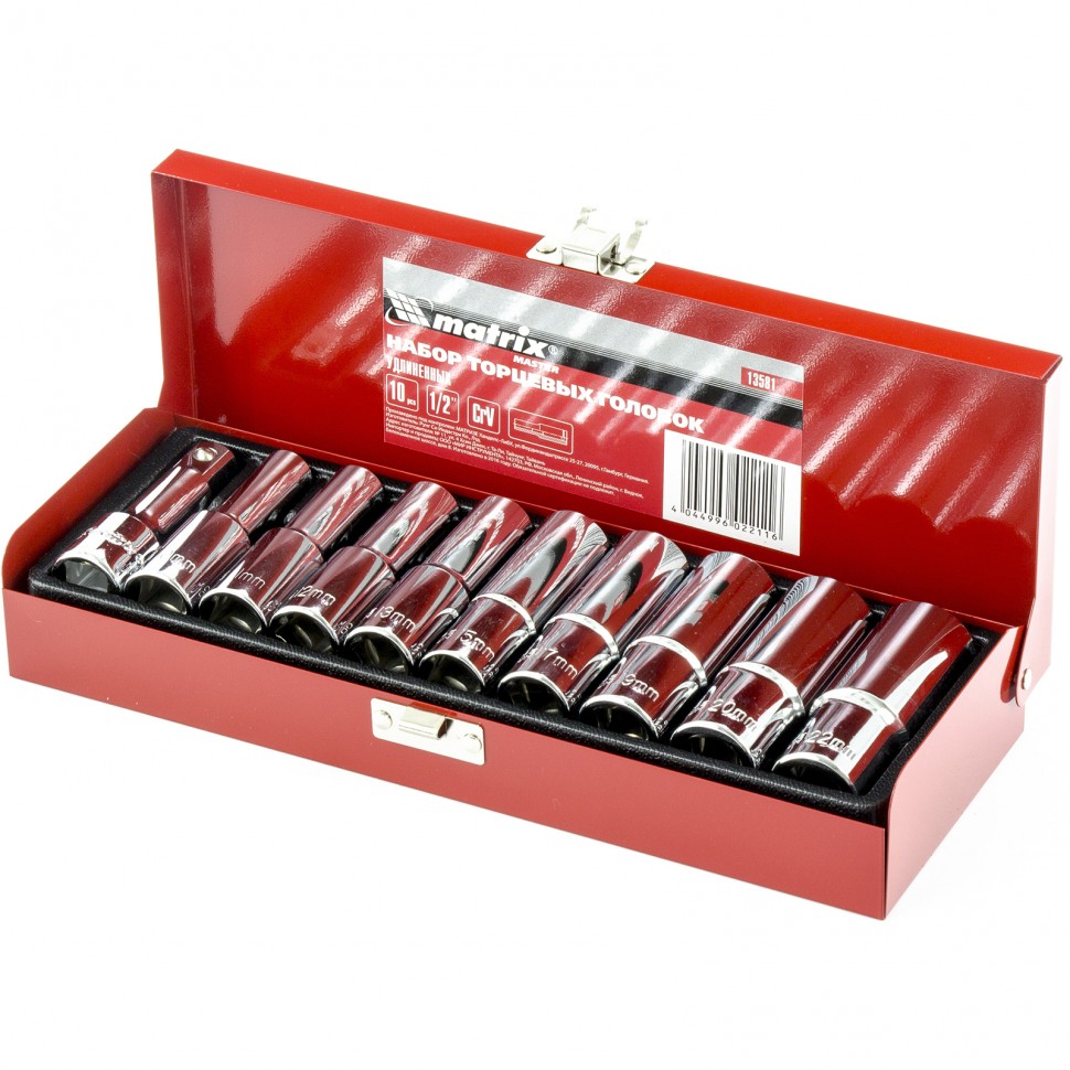 Набор из 10 удлиненных торцевых головок Matrix 13581 диаметром 10-22 мм, с посадочным квадратом 1/2", используется для монтажа и демонтажа резьбовых соединений. Насадки особенно актуальны для работы в труднодоступных местах. набор применяется в автомастерских, подходит также для самостоятельного использования в гараже.