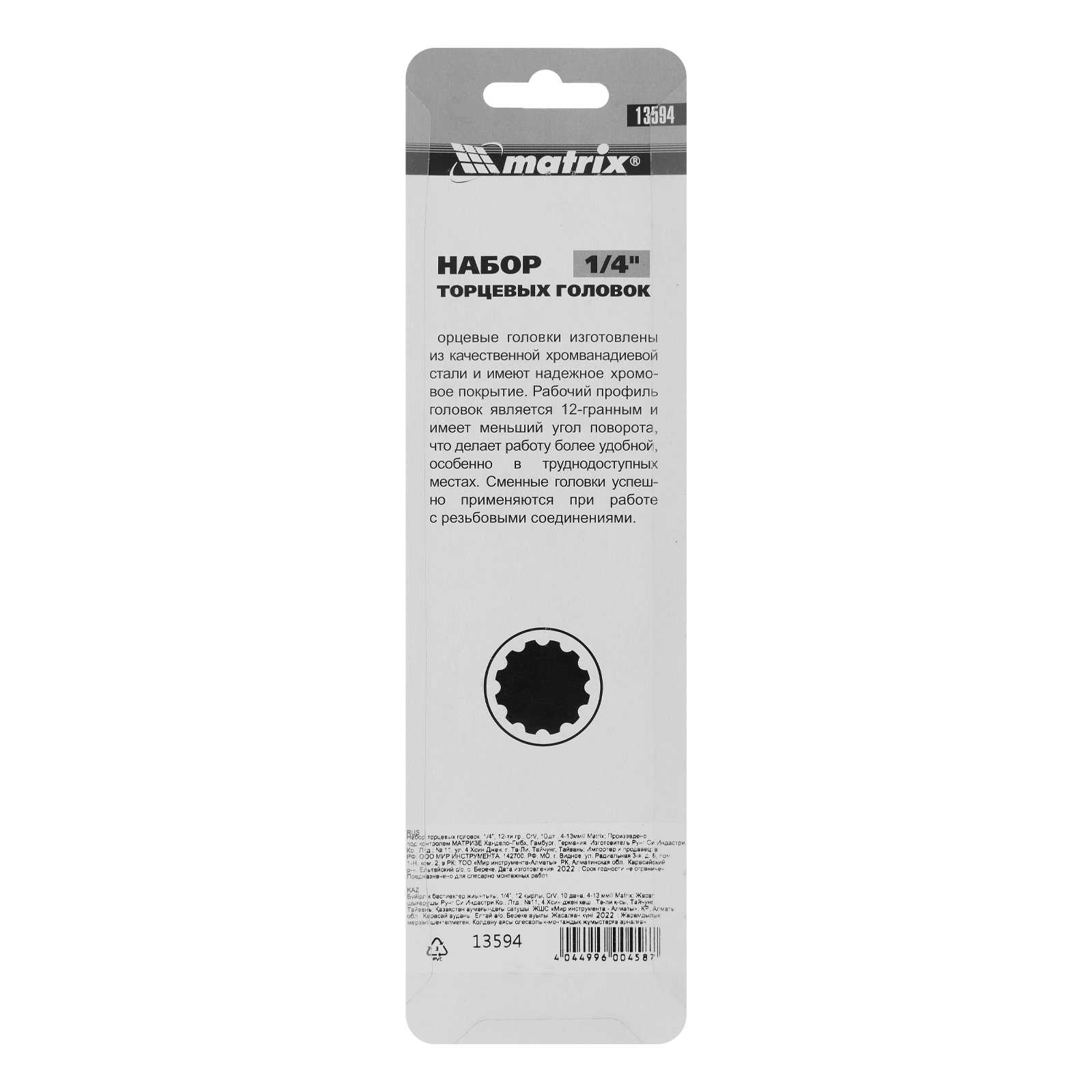 Набор из 10 торцевых головок размером 4-13 мм Matrix 13594 с присоединительным квадратом 1/4", с 12-гранным профилем, из стали CrV, предназначен для работы с небольшими резьбовыми соединениями. Насадки будут полезны автовладельцу, работнику автосервиса и домашнему мастеру.