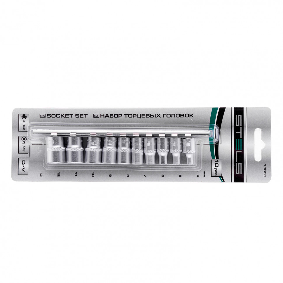 Набор торцевых головок Stels 13606 содержит 10 12-гранных насадок 4-13 мм из стали CrV, с посадочным размером 1/4 дюйма. Торцевые головки используются с трещотками, воротками и гайковертами для откручивания и закручивания гаек, болтов и других крепежных элементов. Насадки выдерживают интенсивные нагрузки, поэтому набор незаменим для техобслуживания авто и ремонтных работ дома и на даче.